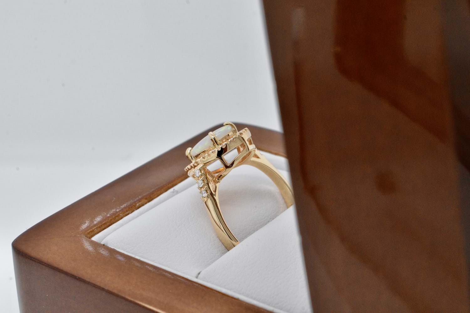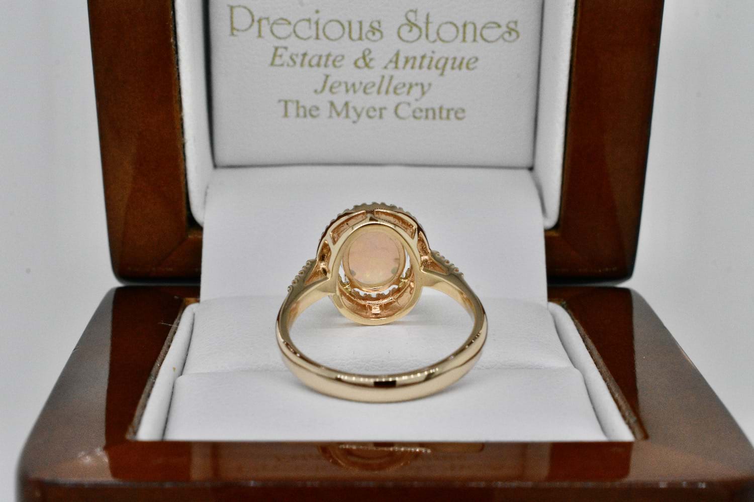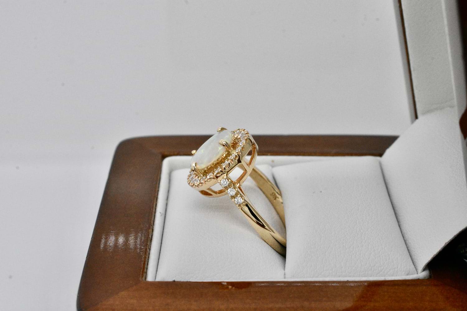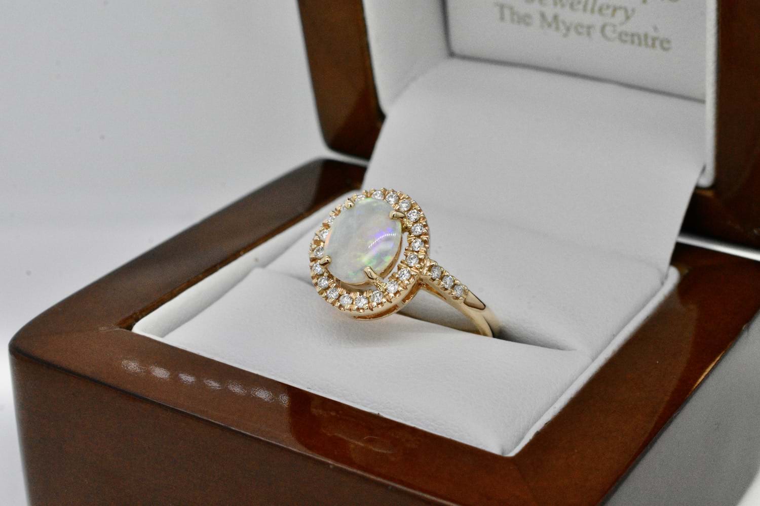 A gorgeous, solid white crystal opal from Coober Pedy of 0.72cts displaying brilliant blue and green flashes set into a 9ct yellow gold diamond halo ring with a small complement of diamonds down the shoulders. Total diamond content is 26 white, sparkly round brilliant cuts totalling 0.23cts G/SI. Finger size M+. Independent Valuation Supplied
