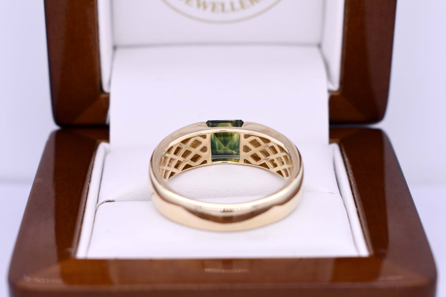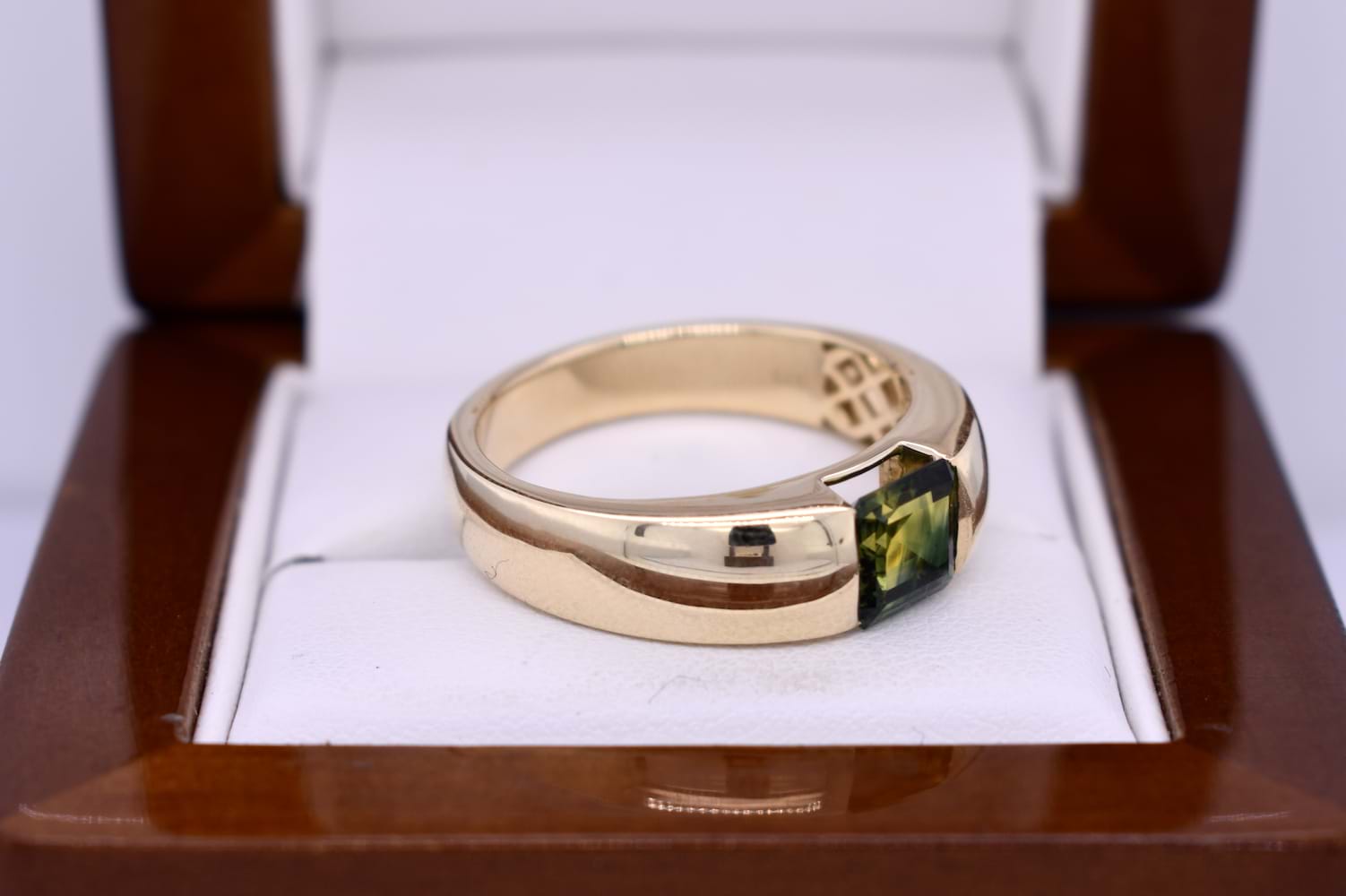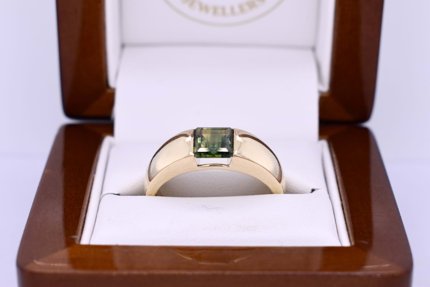 This elegant gents ring is crafted in 9ct yellow gold and set with a square emerald cut Australian parti sapphire of 1.71ct, floating channel set. Sapphire measures 6.54x6.65x4.00mm and is bright-mid greenish yellow. Completed on a domed shoulder 6.63-4.50mm band. Finger size U. Independent Valuation Supplied