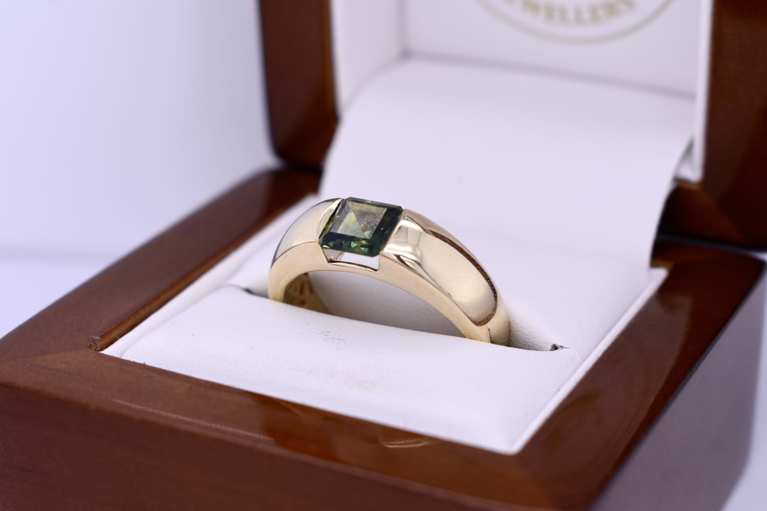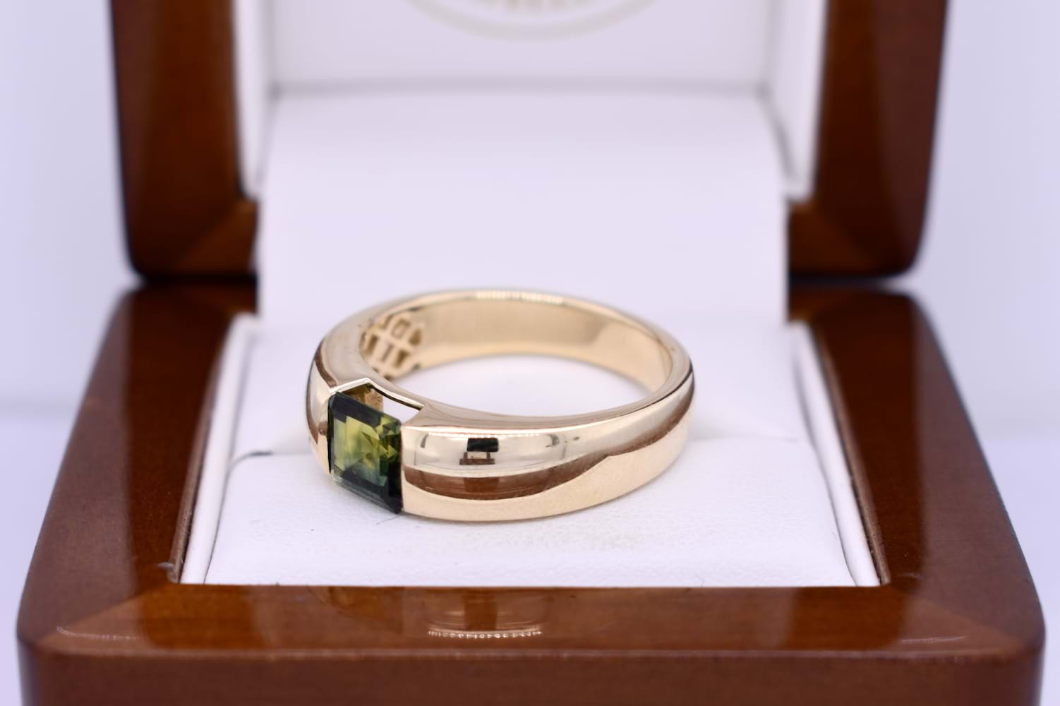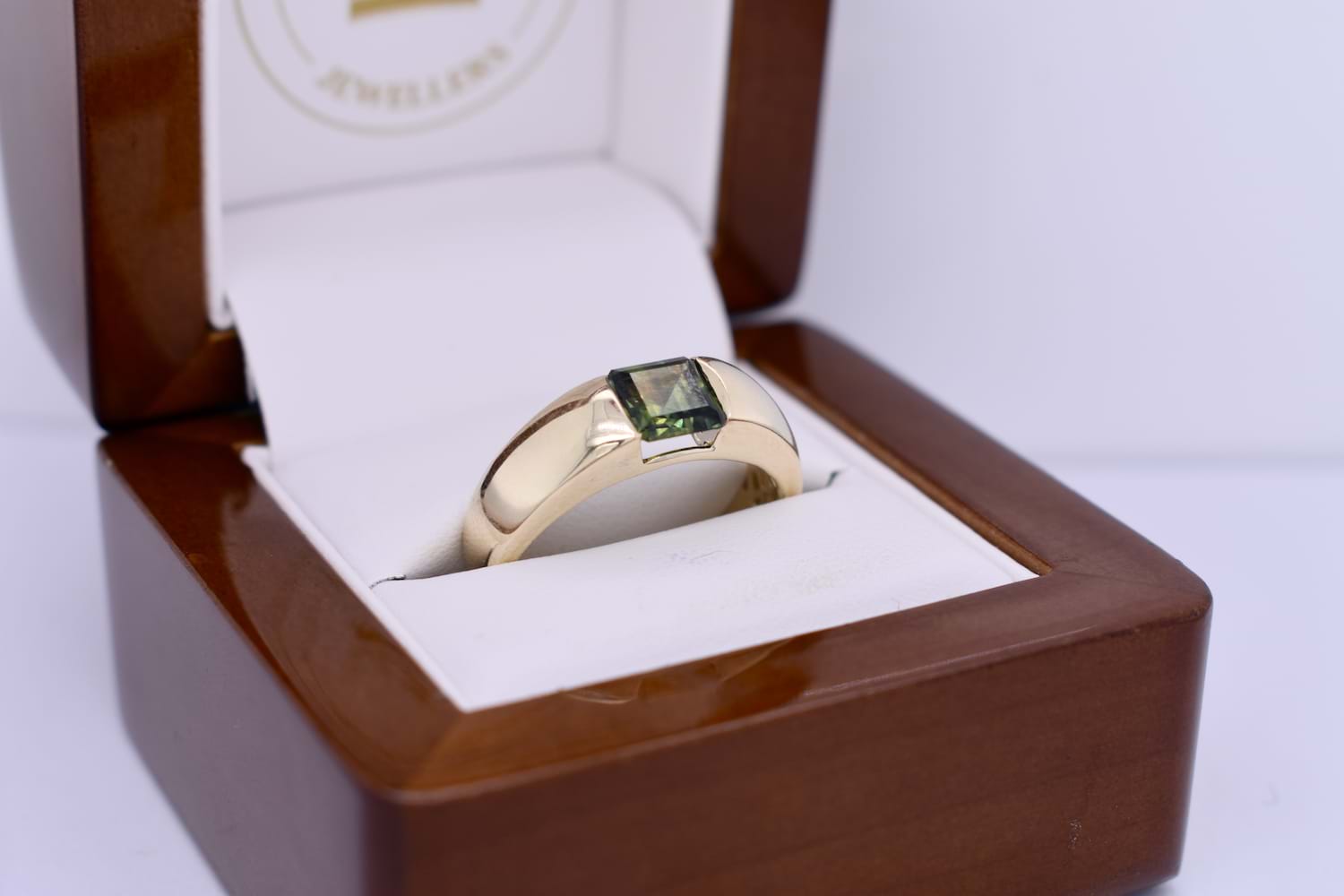 This elegant gents ring is crafted in 9ct yellow gold and set with a square emerald cut Australian parti sapphire of 1.71ct, floating channel set. Sapphire measures 6.54x6.65x4.00mm and is bright-mid greenish yellow. Completed on a domed shoulder 6.63-4.50mm band. Finger size U. Independent Valuation Supplied