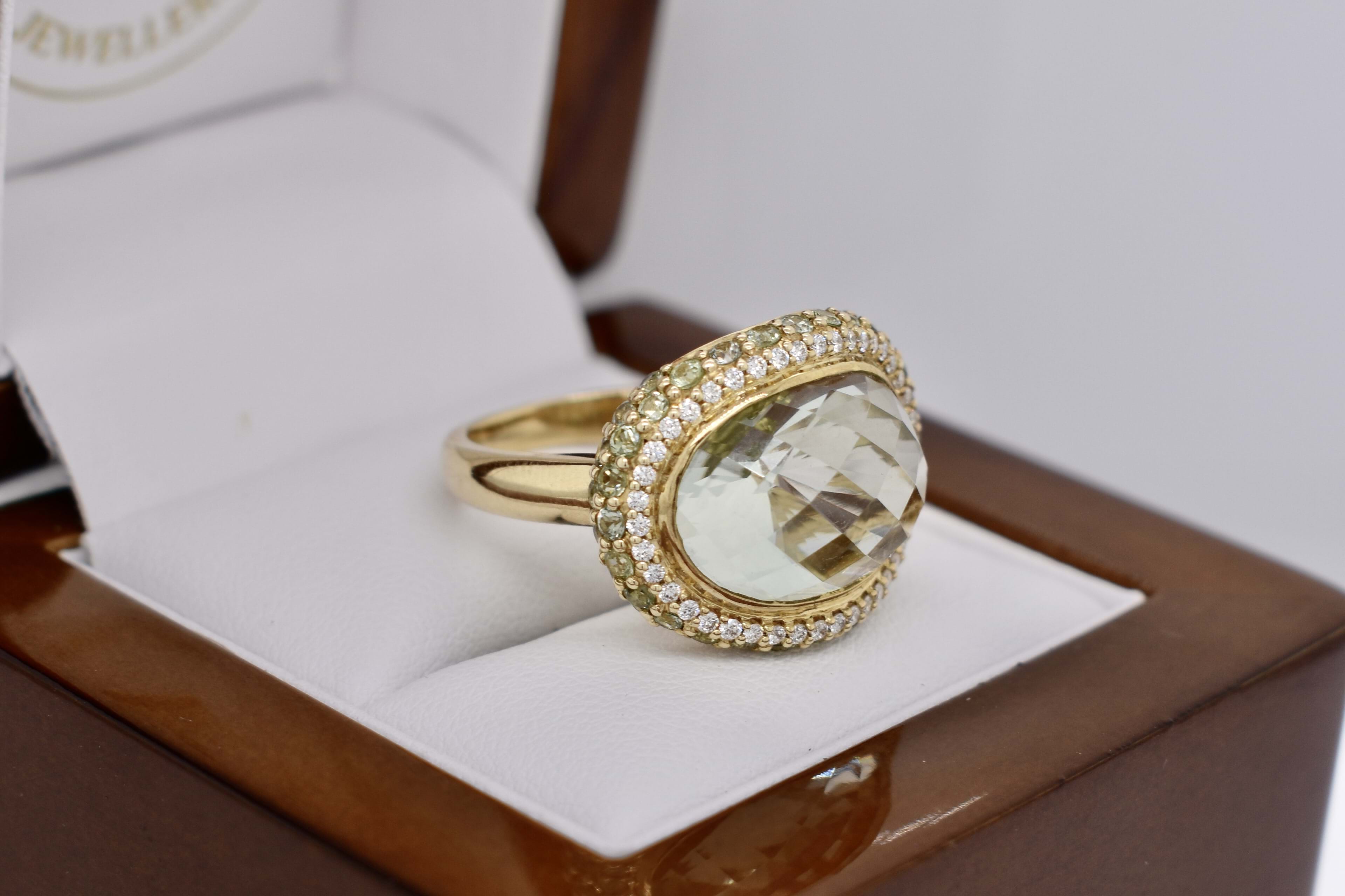 Stunning dress ring featuring a gorgeous 10.50ct oval prasiolite with a checkerboard cut rub over set east/west with a halo of sparkling white diamonds and an outer surround of moss green sapphires. The ring has been beautifully crafted in 9ct yellow gold and the 42 round brilliant cut diamonds total 0.33ct G/SI and the 44 sapphires equal 1.30ct. Finger size L. Independent Valuation Supplied