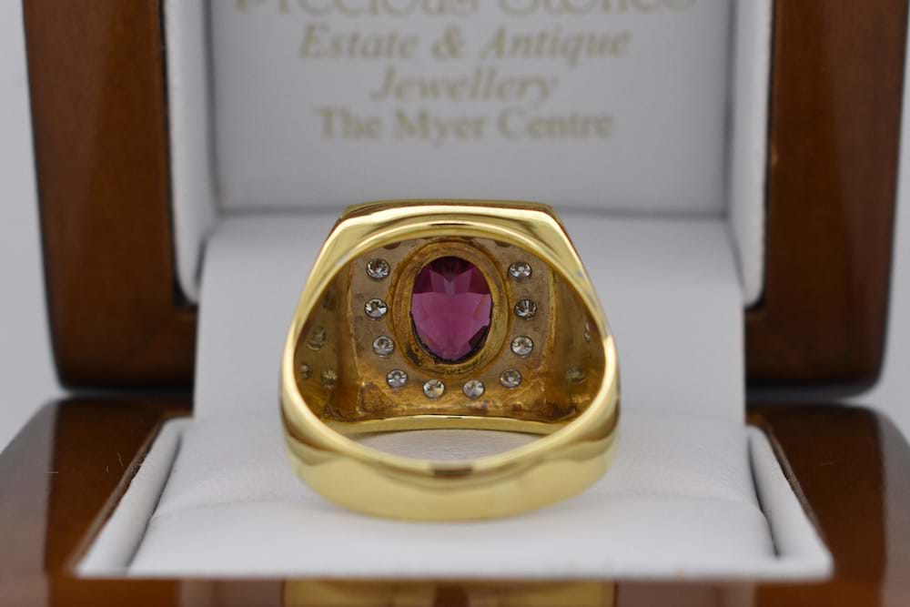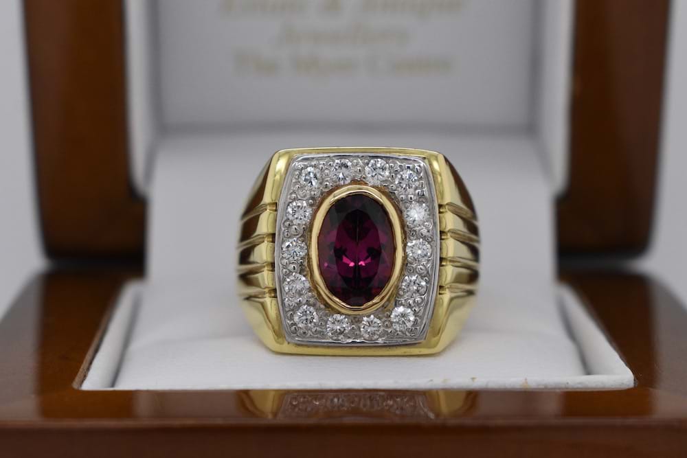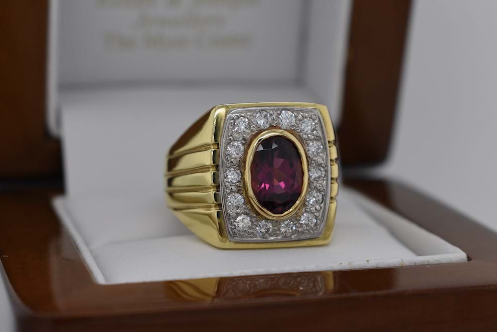 This beautifully hand crafted gents ring is very striking in 18ct gold. It features an oval 2.15ct Rhodolite Garnet in the centre surrounded by a bed of shimmering white diamonds totaling 0.42cts. Independent Valuation Supplied. Finger size R