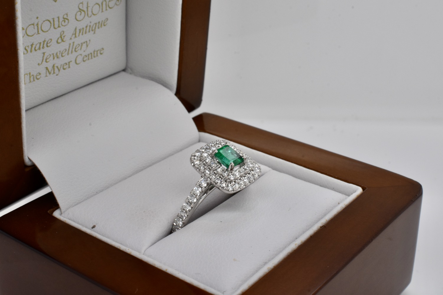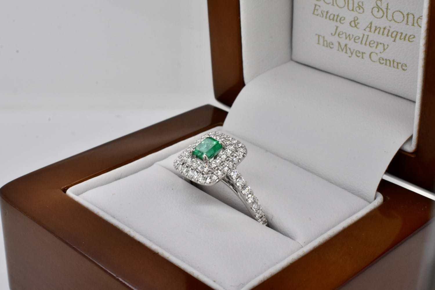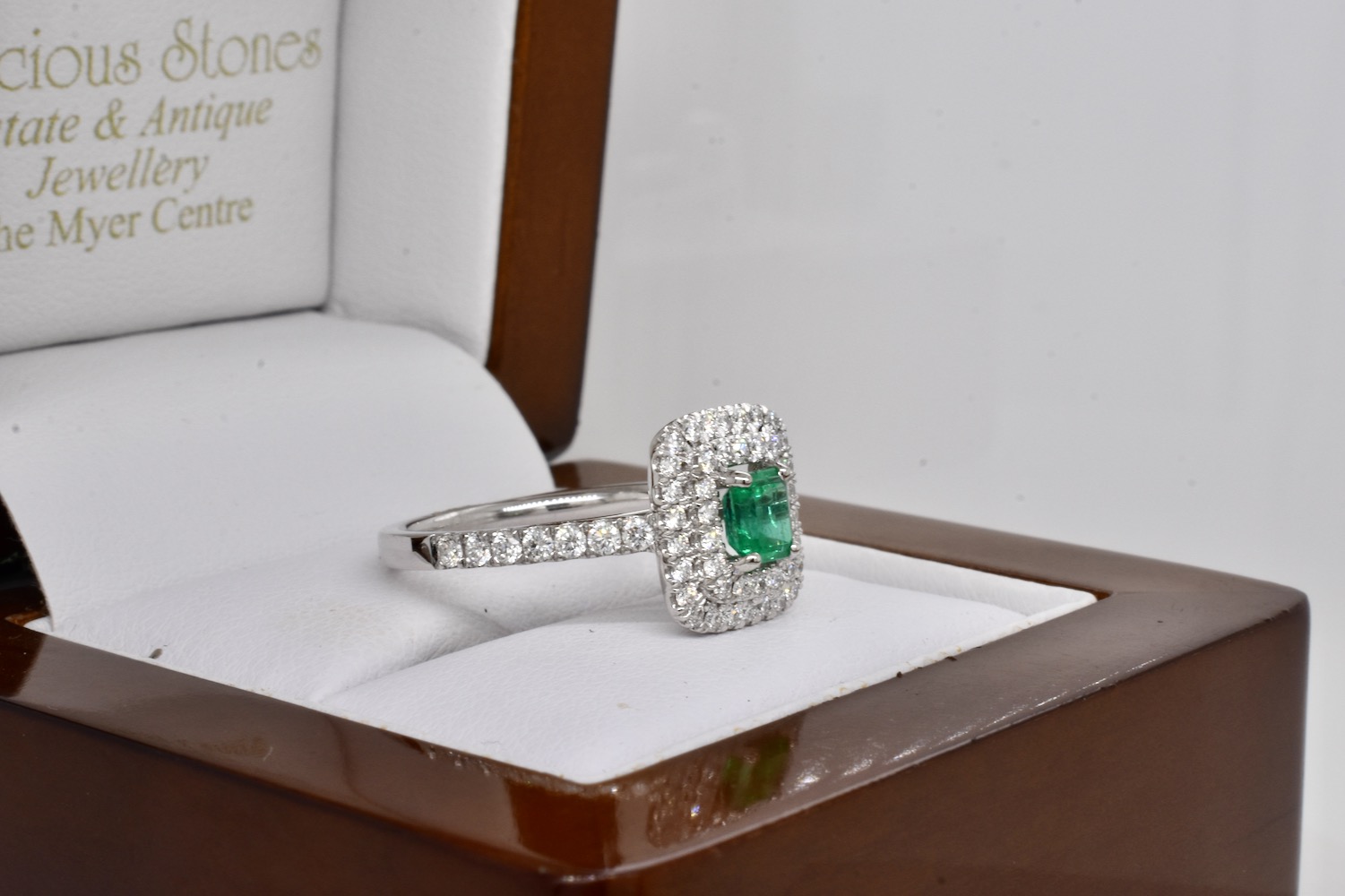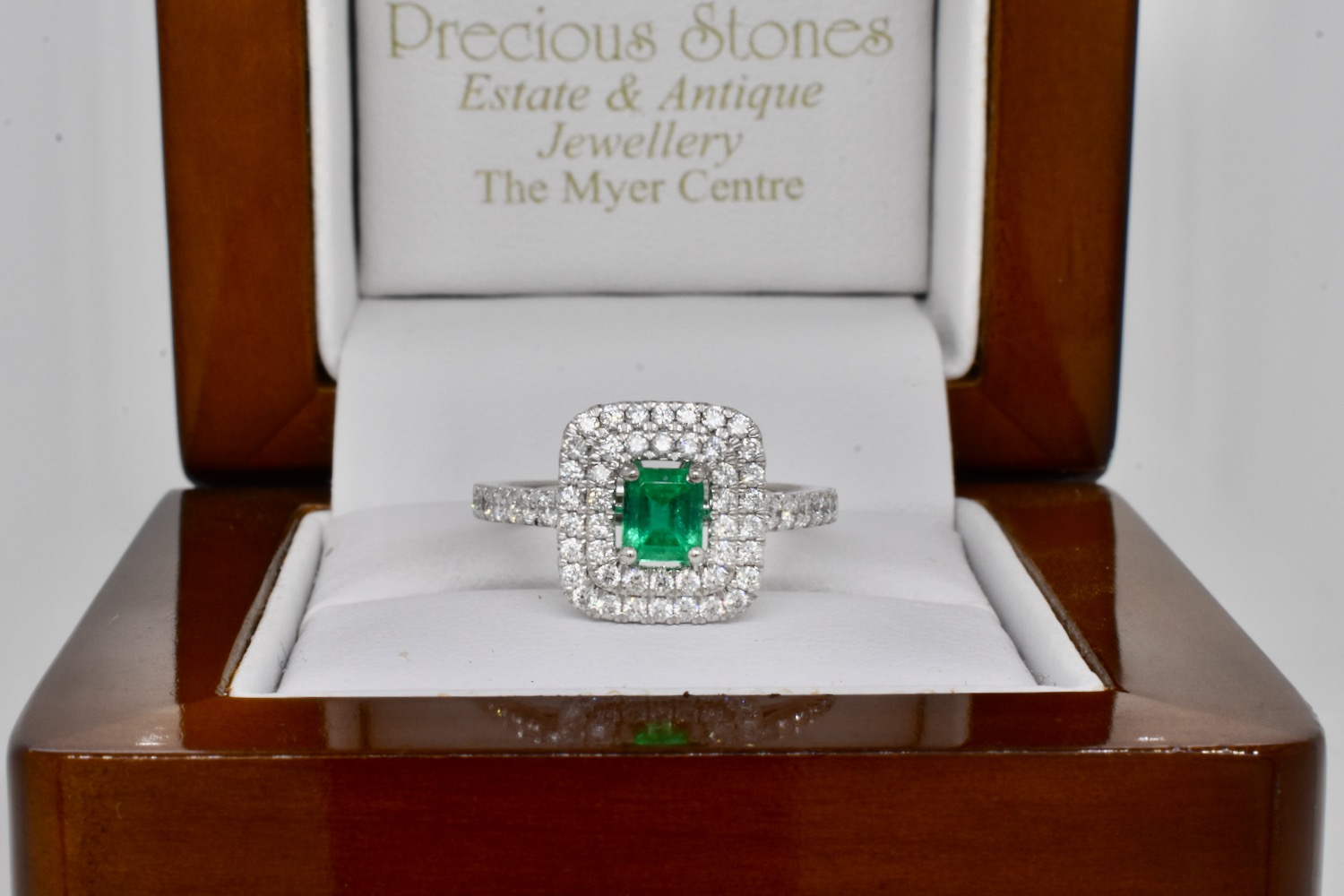This dazzling, sparkling ring is crafted in platinum featuring a beautiful 0.41ct emerald cut Colombian emerald, 4 claw set and surrounded by a double halo of glittering diamonds with additional diamonds down the shoulders. Total diamond content is 58 RBCs equalling 0.61ct G/VS. This ring has been designed to either wear alone or sit flush next to additional bands. Finger size L+