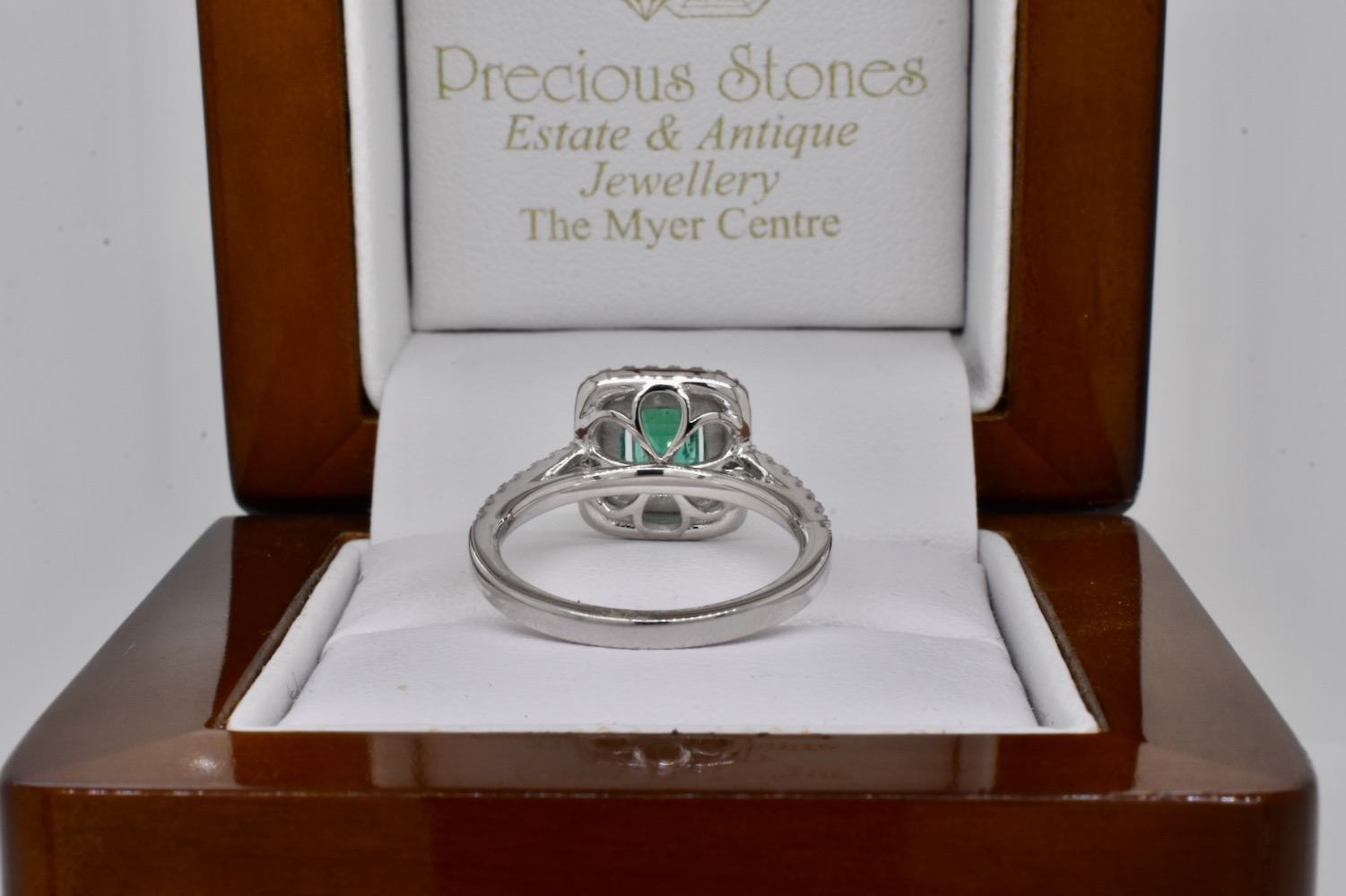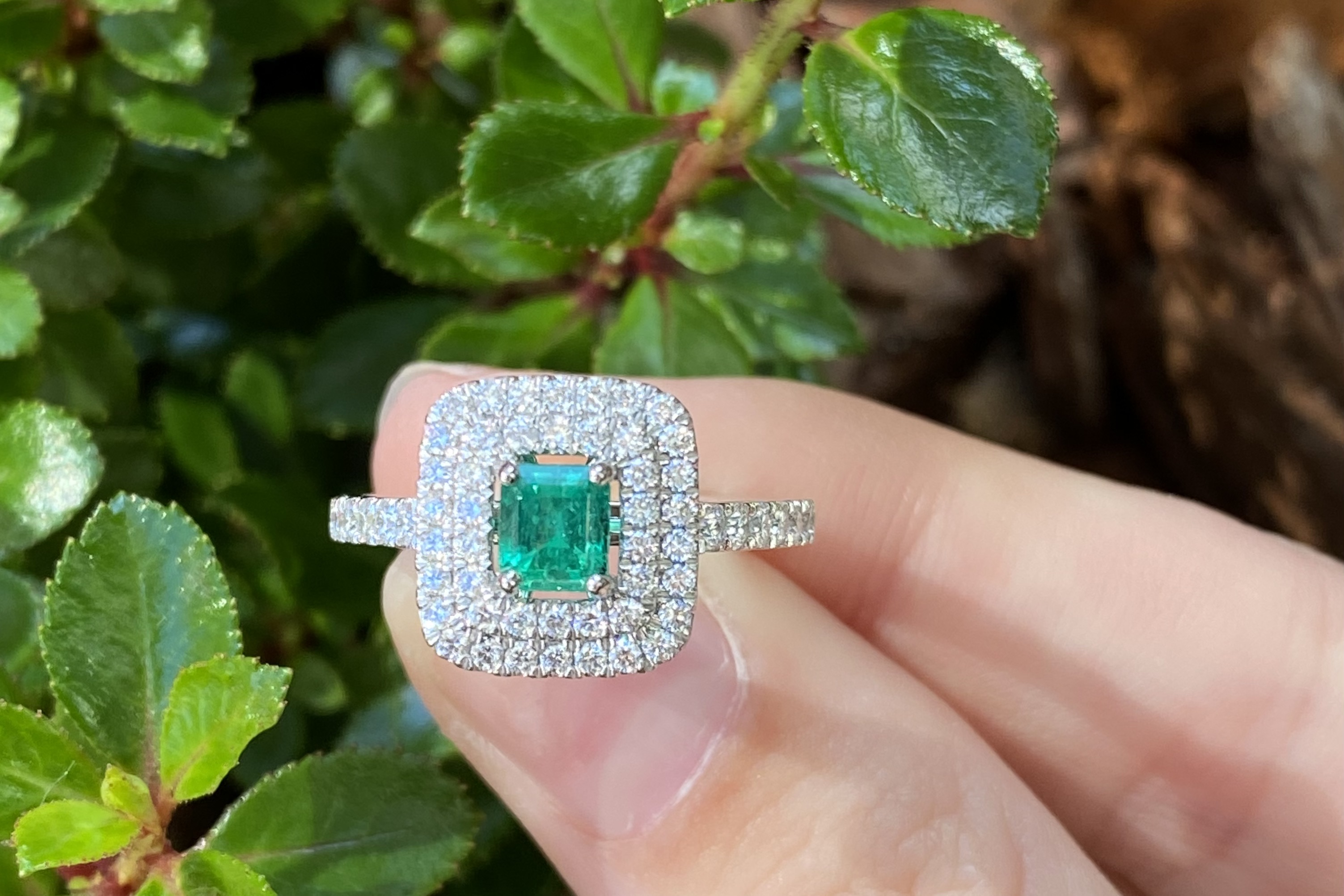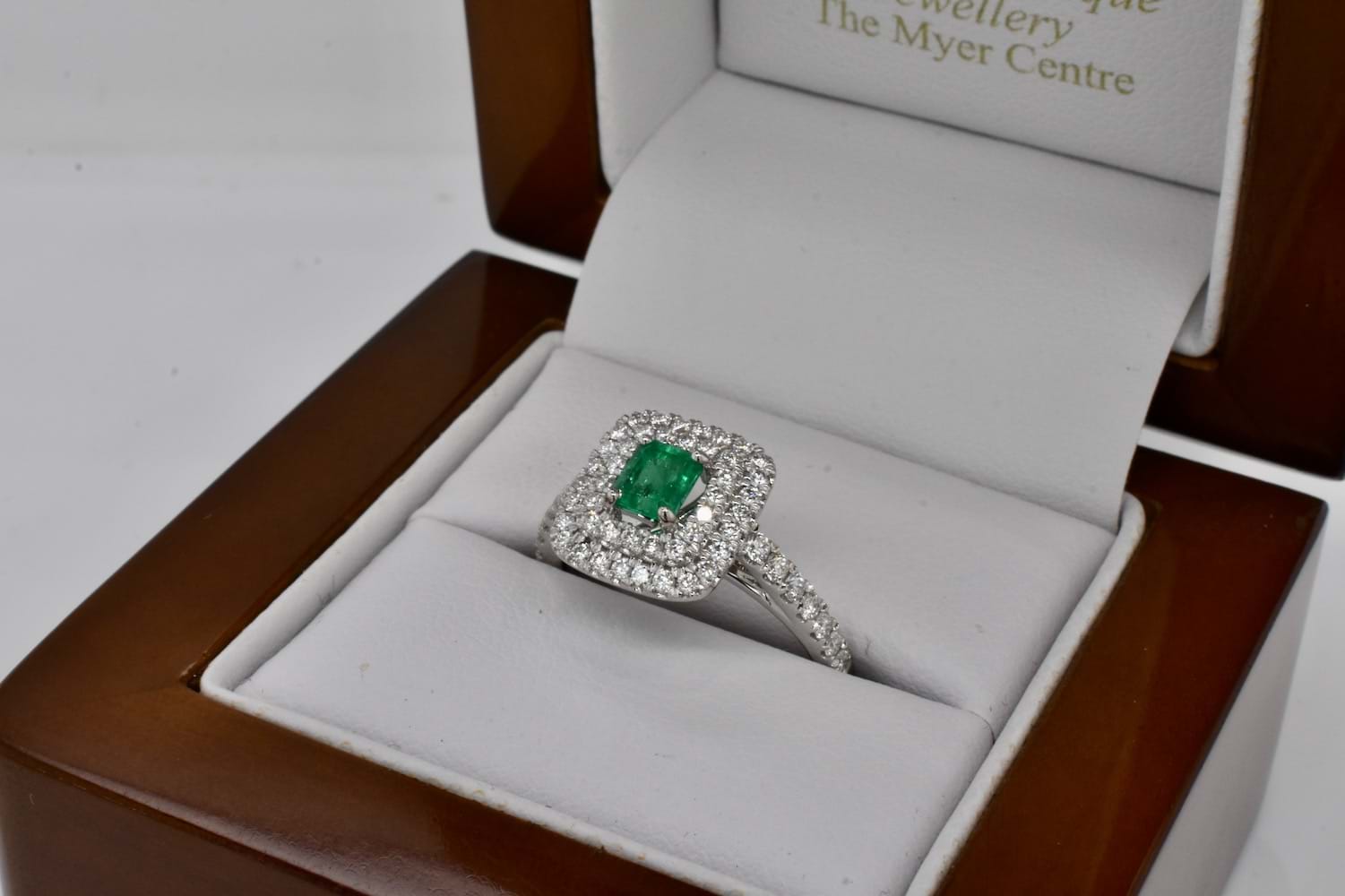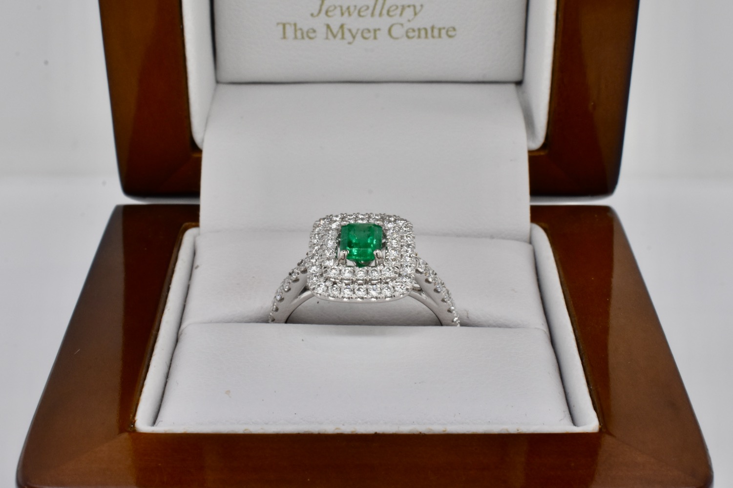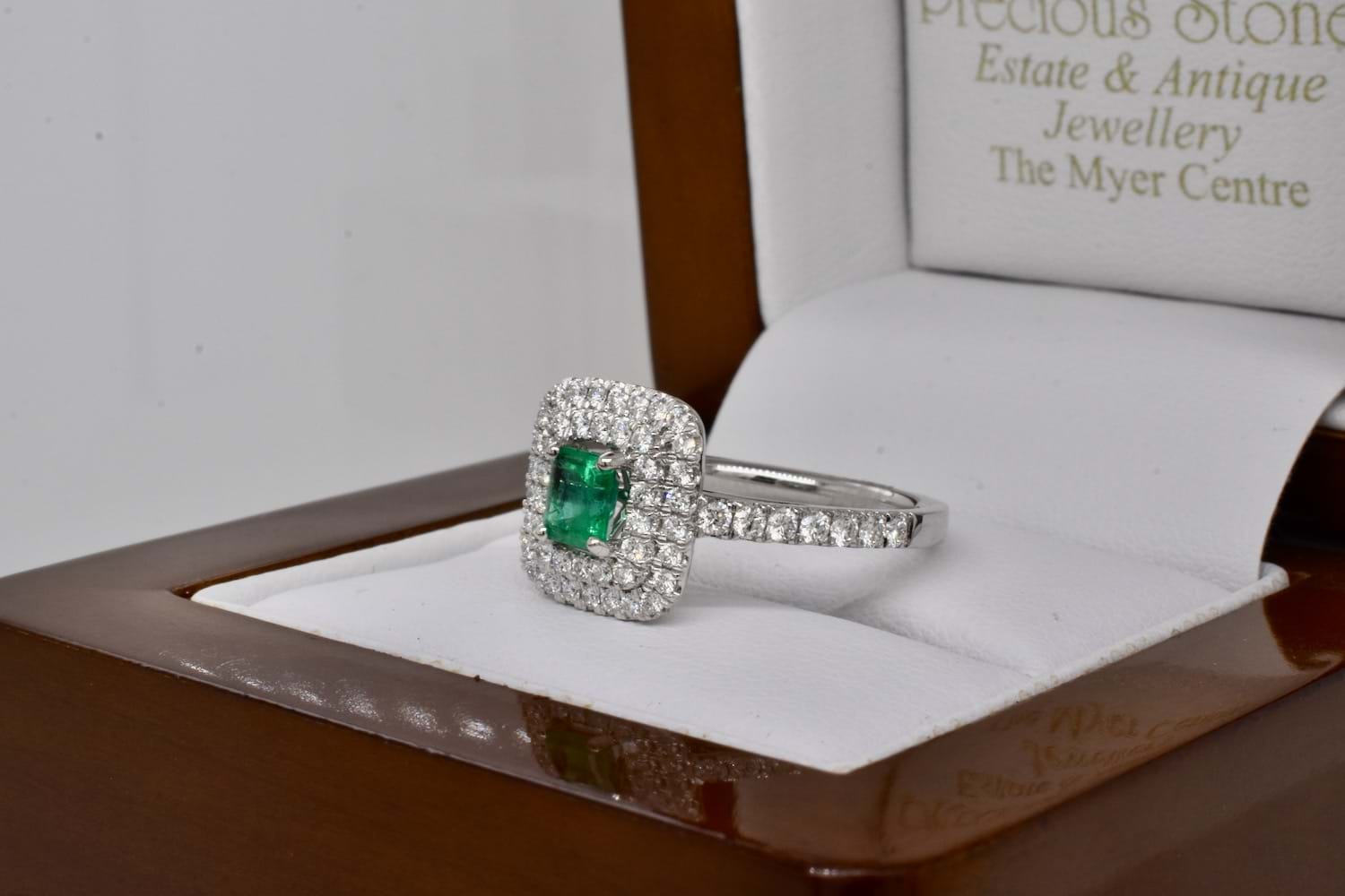 This dazzling, sparkling ring is crafted in platinum featuring a beautiful 0.41ct emerald cut Colombian emerald, 4 claw set and surrounded by a double halo of glittering diamonds with additional diamonds down the shoulders. Total diamond content is 58 RBCs equalling 0.61ct G/VS. This ring has been designed to either wear alone or sit flush next to additional bands. Finger size L+