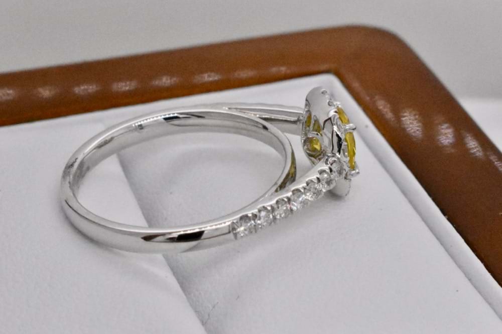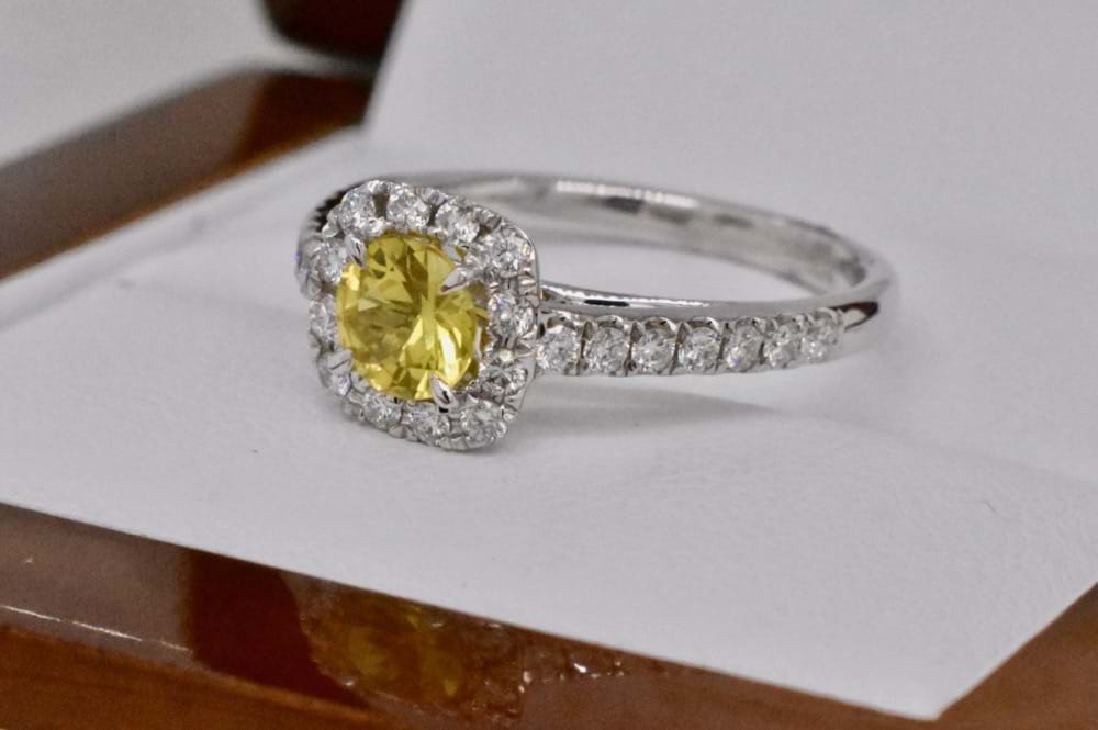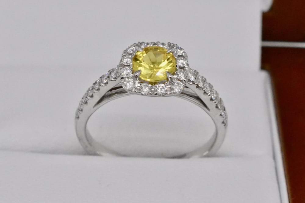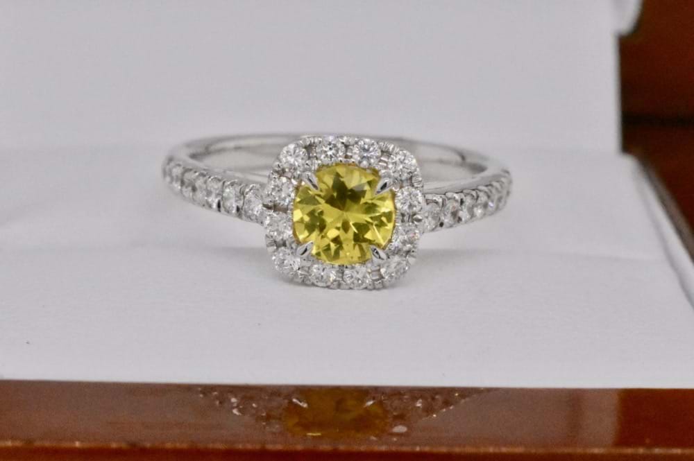 This bright yellow, eye clean, yellow sapphire of 0.70cts was chosen in store to be set into this stunning platinum, cushion shaped, halo ring. Containing 26 round brilliant cut diamonds both in the halo and down the shoulders totalling 0.44cts. Designed as an engagement ring this halo ring will sit perfectly with diamond bands. Independent Valuation Supplied