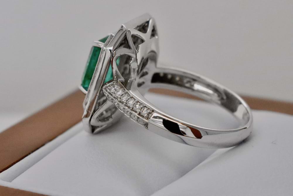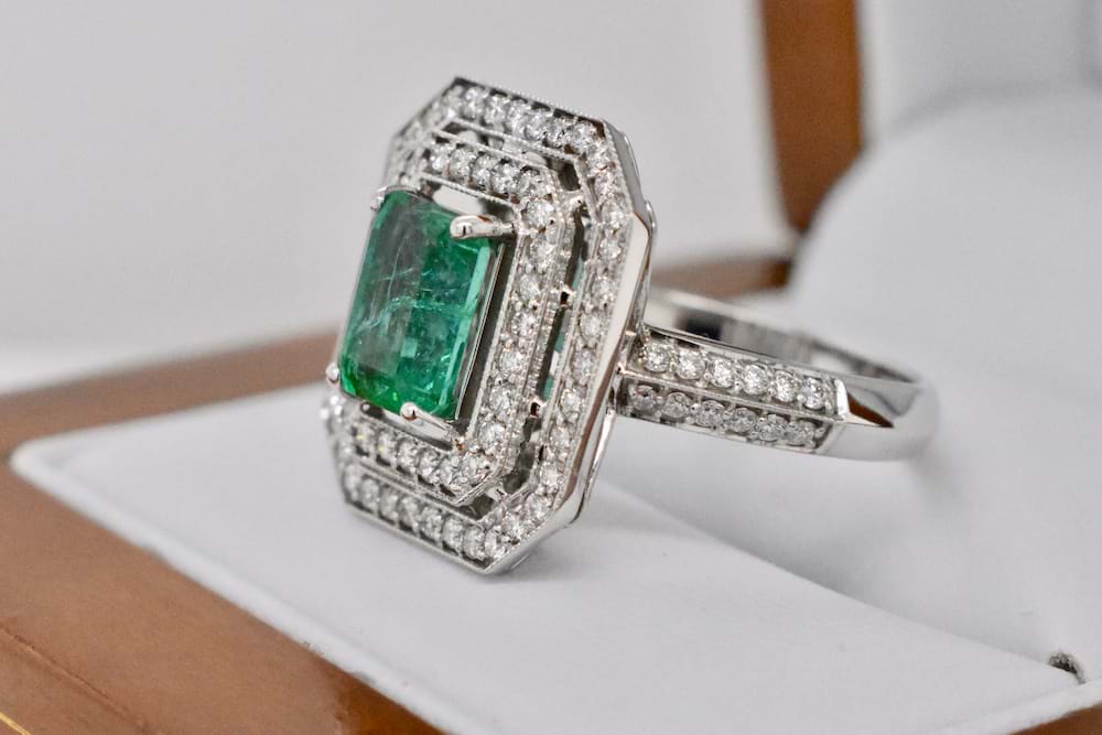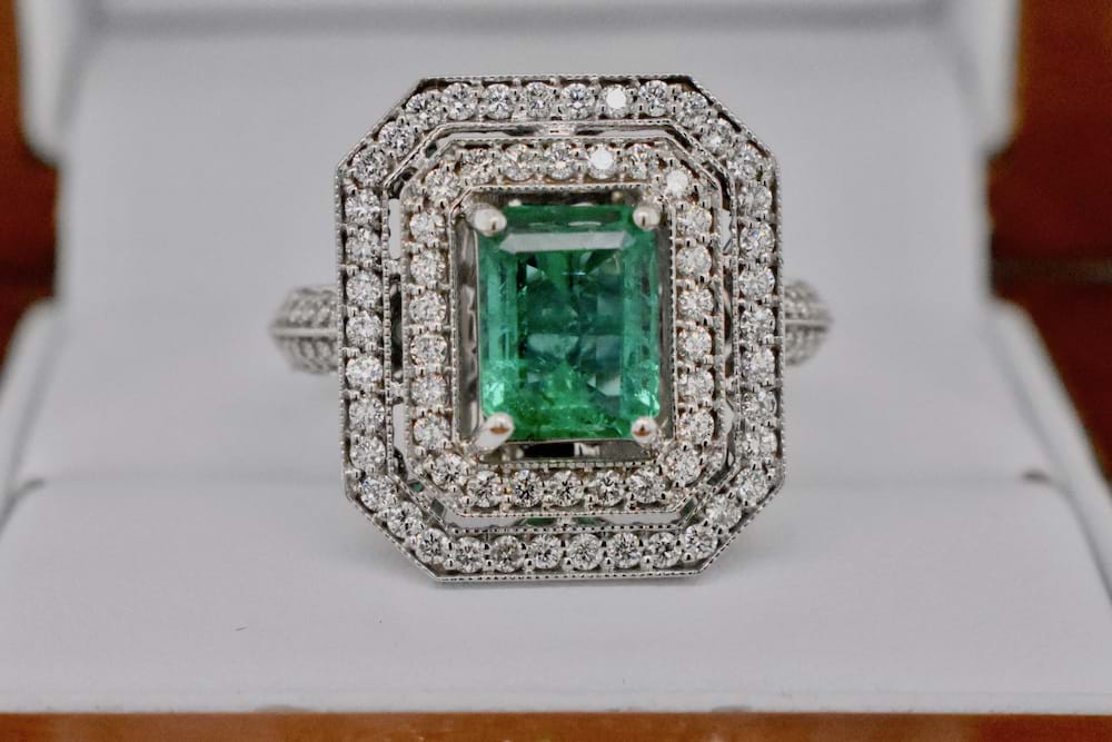 18ct white gold double halo diamond ring set with 88 round brilliant cut diamonds totalling 1.84ct and at the centre of the ring is a 1.84ct emerald cut, bright, mid green, natural Emerald. Independent Valuation Supplied