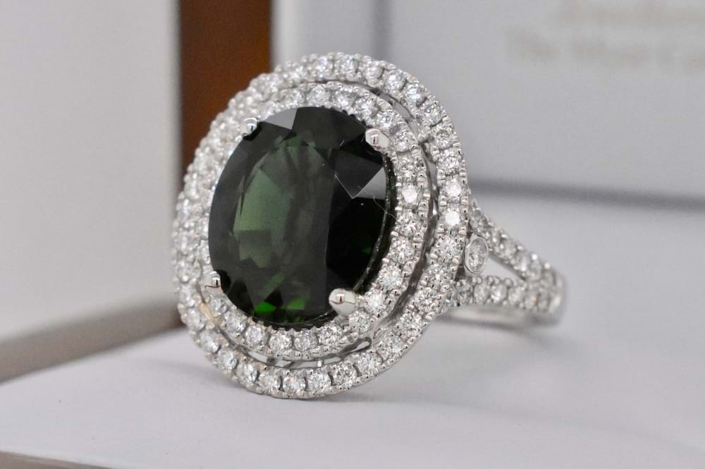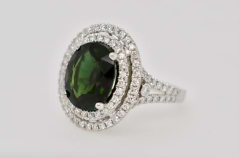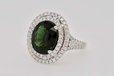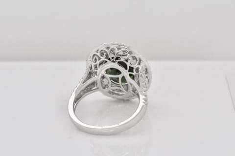 This Impressive, bright, dark green Tourmaline is a tremendous 5.52ct and is surrounded by a double diamond halo and diamond encrusted split shoulders. Crafted in 18ct white gold the ring contains a mind blowing 96 white, sparking, diamonds totaling 1.00ct. Independent Valuation Supplied