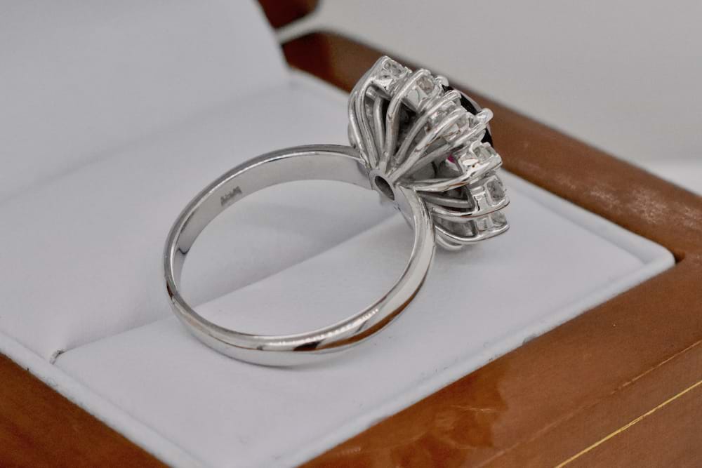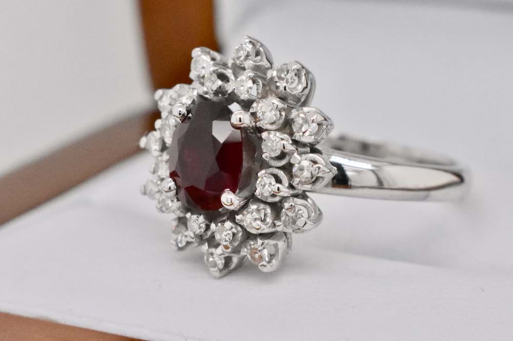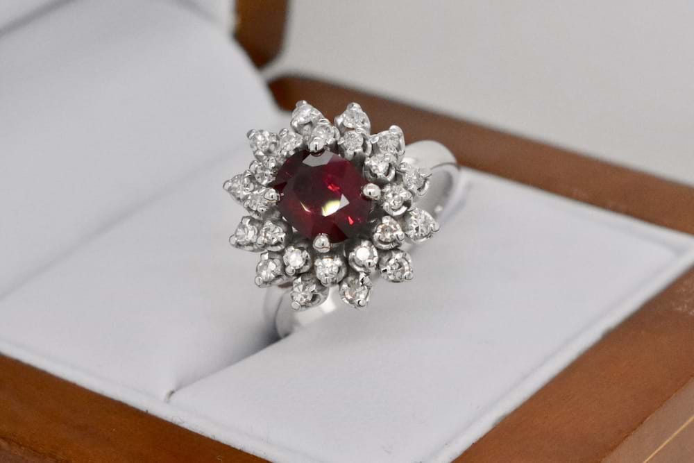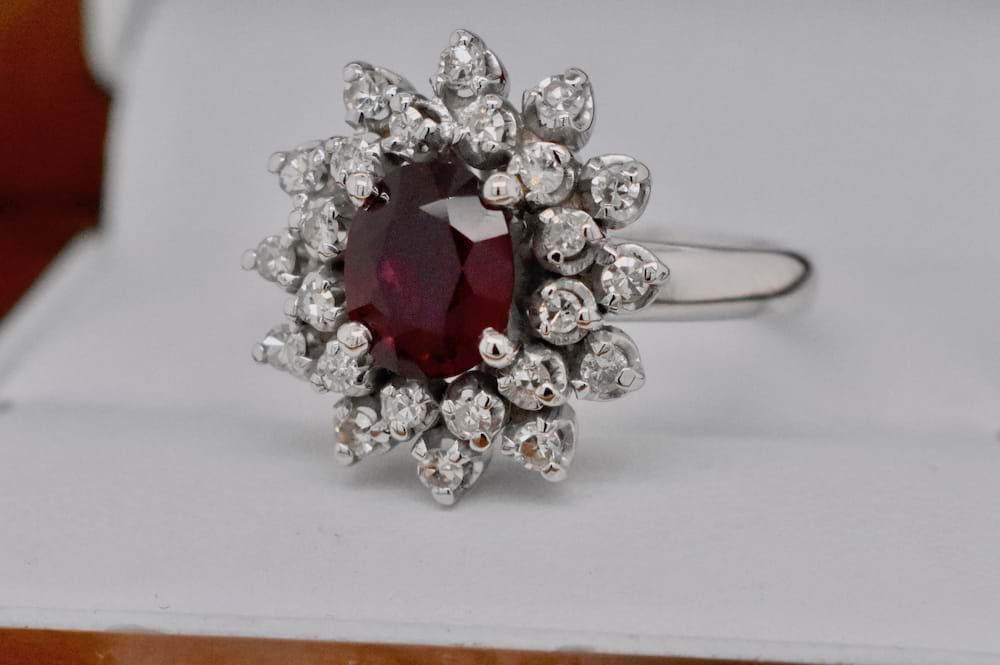 This gorgeous, natural, 1.50ct ruby has been given a make over and re-polished to it’s former beauty, it has then been reset into its’ original vintage ring setting. The ring has been crafted in 18ct white gold and features 24 single cut diamonds totalling 0.36cts in a cluster style designed to showcase the natural beauty of this stunning dark red ruby. Independent Valuation Supplied