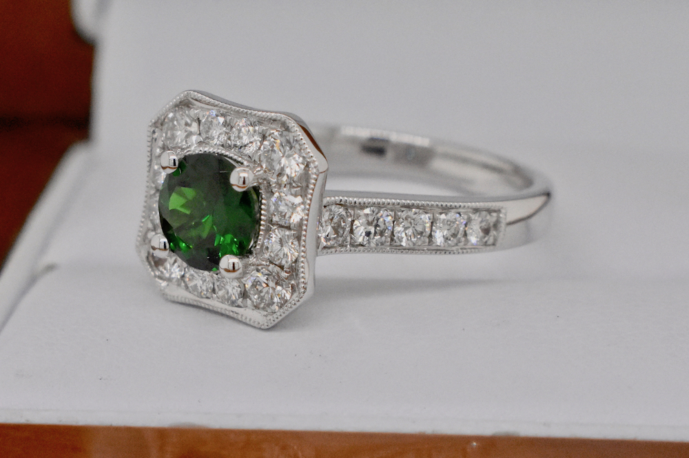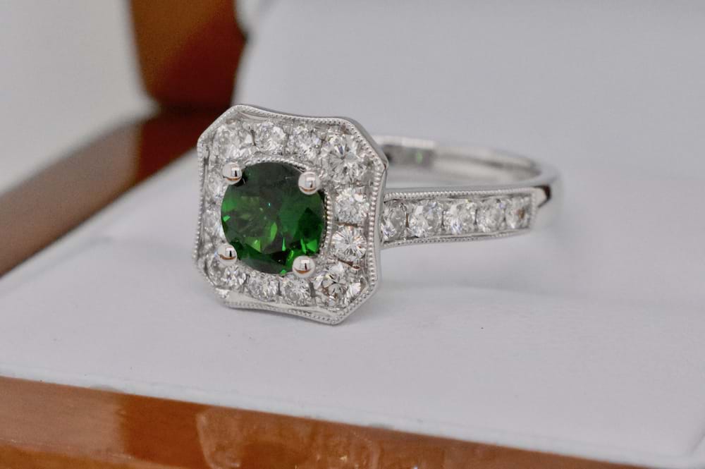 This round, bright dark green, 0.83ct Tsavorite Garnet has been four claw set into the centre of corner cut 18ct white gold halo ring. With 22 diamonds totalling 0.82cts (G/VS) this ring looks stunning worn by itself or when paired with diamond bands. Independent Valuation Supplied. Finger size M