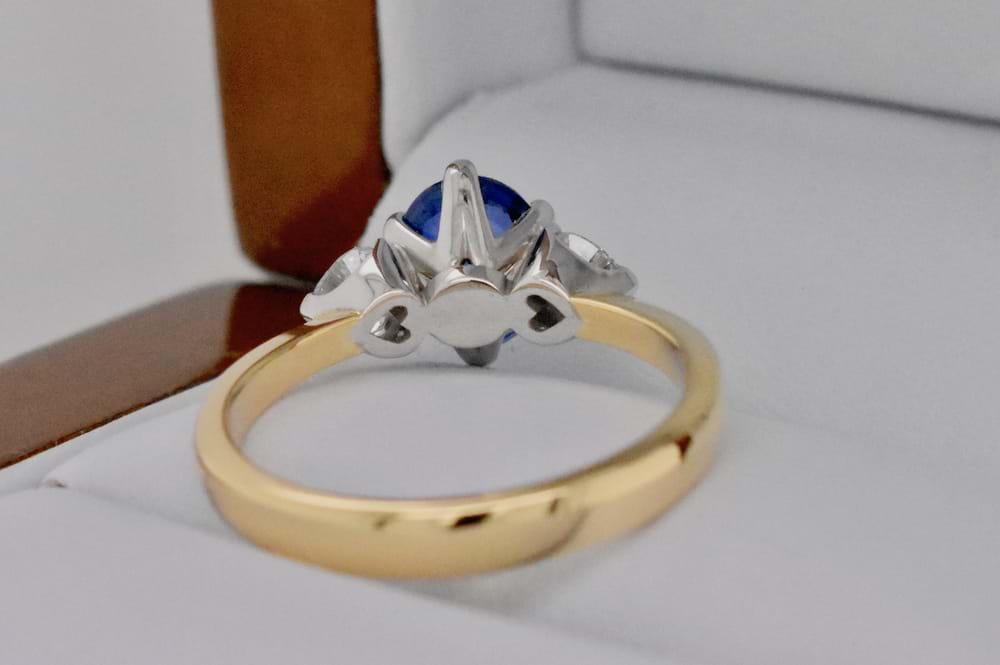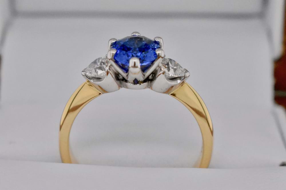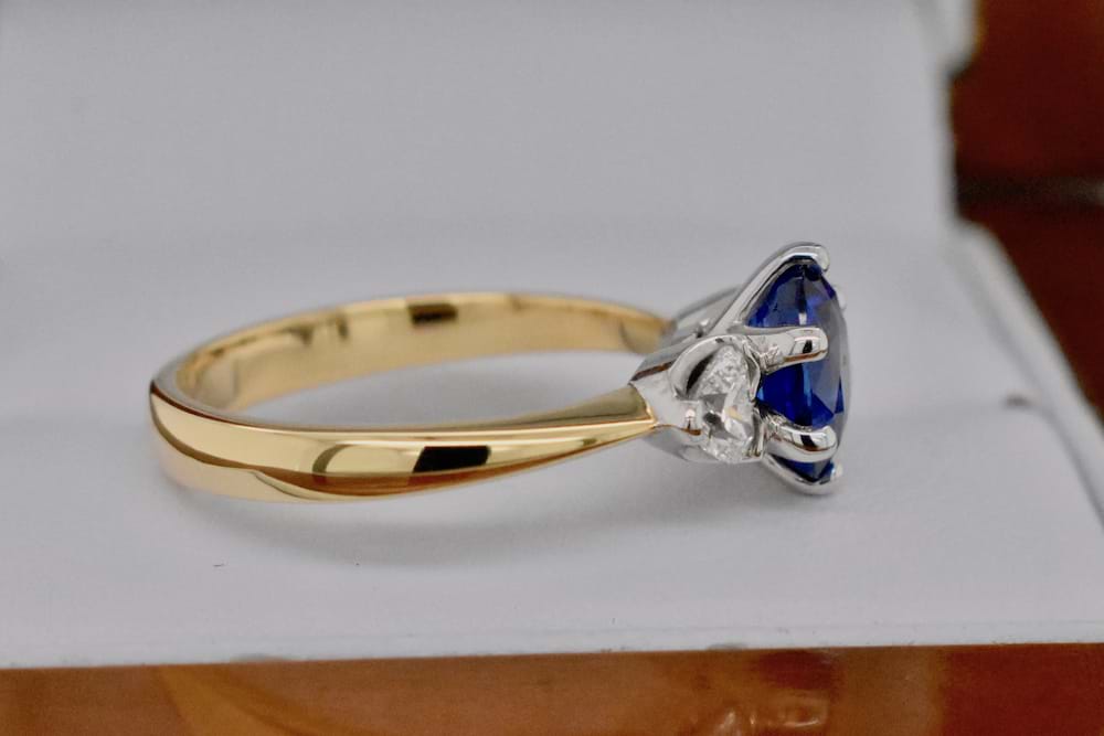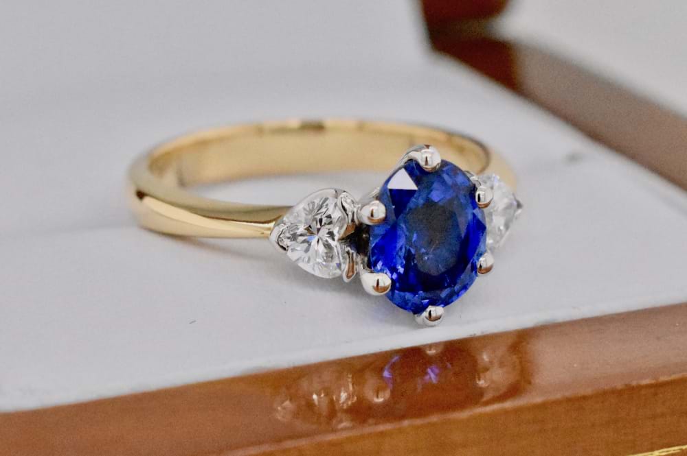 An impeccable 1.59ct, bright and deeply saturated, blue Ceylon sapphire set into six 18ct white gold claws and flanked by a scintillating heart shape diamond on each side with a combined total weight of 0.40cts on an 18ct yellow gold shank. A timeless and classic design that would make a beautiful anniversary, birthday, or just because ring! Independent Valuation & AIGS Certificate Supplied
