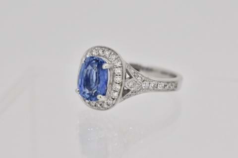 An alluring 2.24ct soft cornflower blue Ceylon sapphire set into an oval cushion halo of shimmering round brilliant cut diamonds in 18ct white gold. With a total of 0.57cts of diamonds combined in the halo and in the split shoulders this ring makes a stunning engagement or dress ring. Independent Valuation Supplied