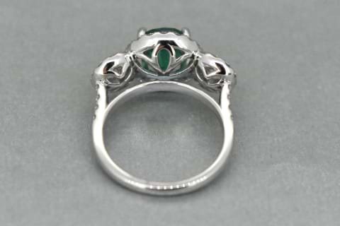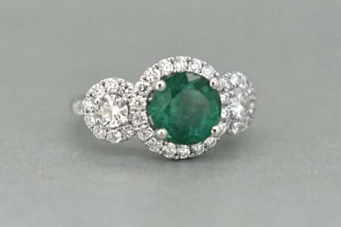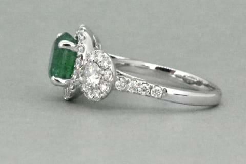 This gorgeous 2.63ct natural emerald was hand selected in store to be the central feature of this trilogy cluster ring. Crafted in 18ct white gold the emerald has been set in four raised claws with a halo of shimmering round brilliant cuts, flanked by a single larger round on each side which have both been surrounded in their own halos. This pieces contains a total of 1.43cts of white diamonds and can be worn alone or paired with diamond bands on each side. Independent Valuation Supplied