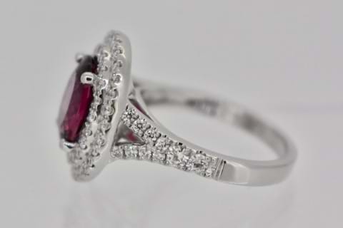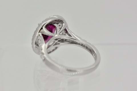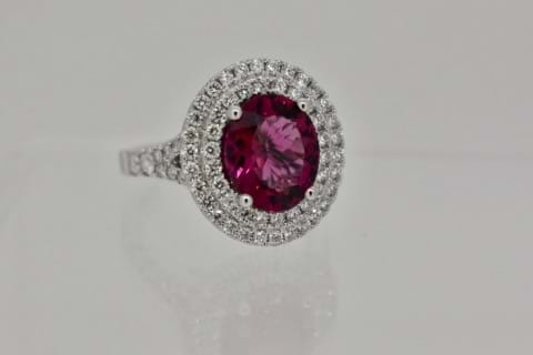 This stunning 2.88ct bright, deep pink, tourmaline has been four claw set into the centre of a gorgeous double halo of shimmering round brilliant cut diamonds. Crafted in 18ct white gold with 72 diamonds, both in the halo and set into the split shoulders, totaling 0.90cts this amazing ring has to be seen to be believed. Independent Valuation Supplied