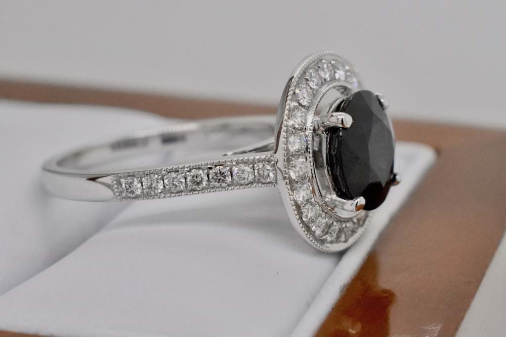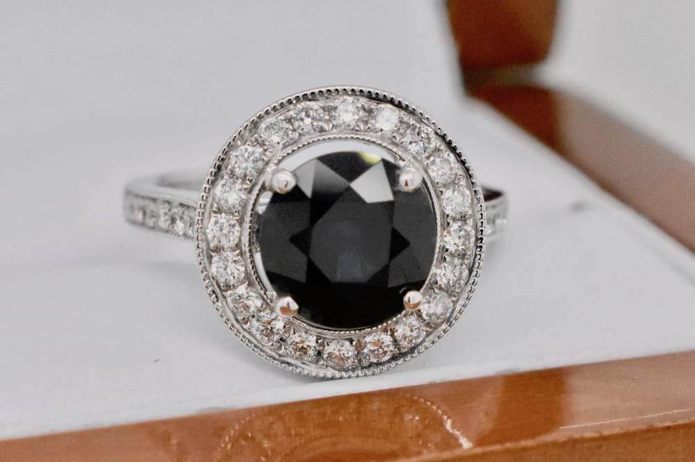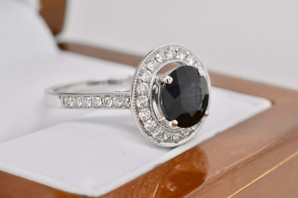 A gorgeous 2.89ct bright dark blue Australian sapphire suspended in four claws in the centre of a circular diamond halo. Crafted in 18ct white gold this ring features a beaded border around the halo and down the shoulders with a total of 34 grain set diamonds equaling 0.64cts (G/SI). Designed to look fabulous as is, or to sit perfectly next to wedding bands this ring can be both engagement or dress. Independent Valuation Supplied. Finger size M+