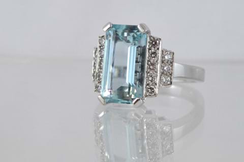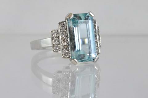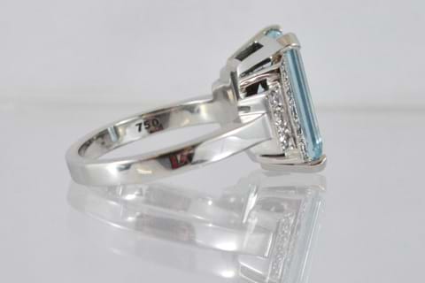 This absolutely sensational 4.13ct emerald cut aquamarine was hand selected by our in store gemmologist and has been corner cap set into a bespoke 18ct white gold ring. Designed in collaboration with our jeweller it features eight round brilliant cut diamonds on each side of the aquamarine in two leveled steps to enhance and show case the stunning nature of the centre gemstone. Total diamond content equals 0.40cts. Independent Valuation Supplied