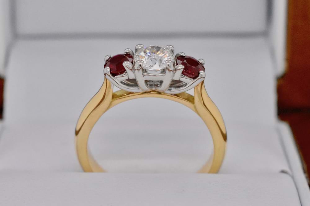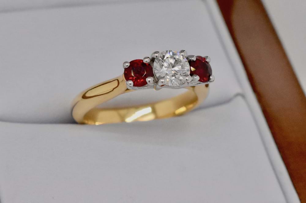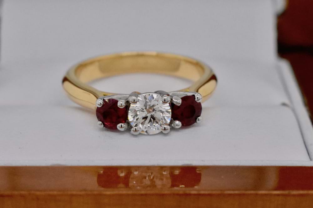 18ct Yellow Gold 3 stone trilogy ring. The round brilliant diamond in the centre is a lovely white GIA certified stone weighing 0.54ct (H/SI1). The natural Burmese Rubies on either side are a combined weight of 0.60ct. This ring is a simply stunning, classic design suitable for an engagement ring, dress ring or eternity ring. Independent Valuation Supplied. Fingr size M