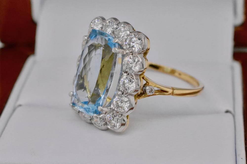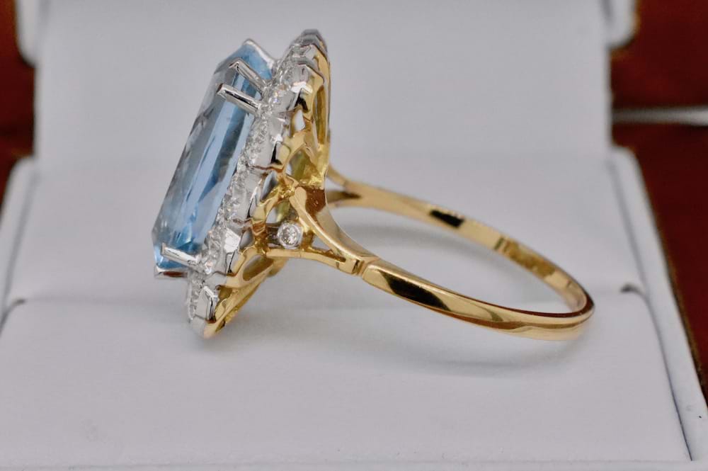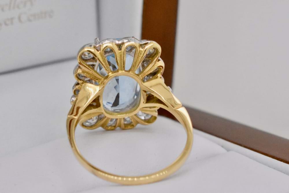 Crafted mostly in 18ct yellow gold with an 18ct white gold top is this stunning 4.80ct elongated Swiss cushion cut Aquamarine surrounded by 14 exceptionally white, brilliant cut diamond totaling 1.70ct. Independent Valuation Supplied