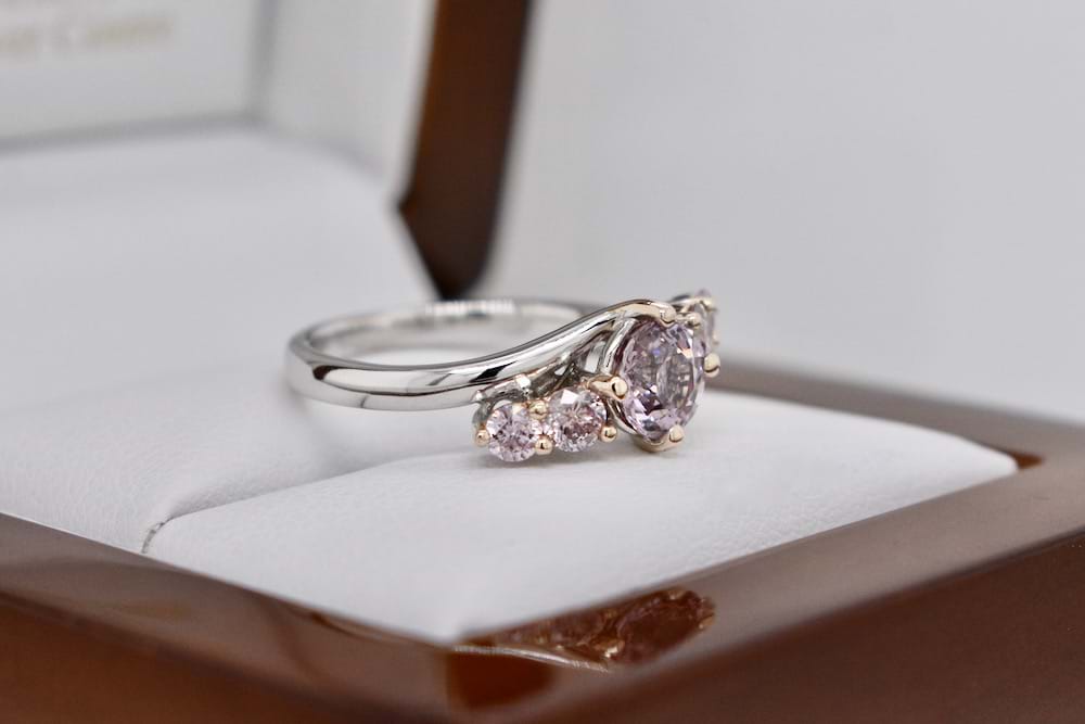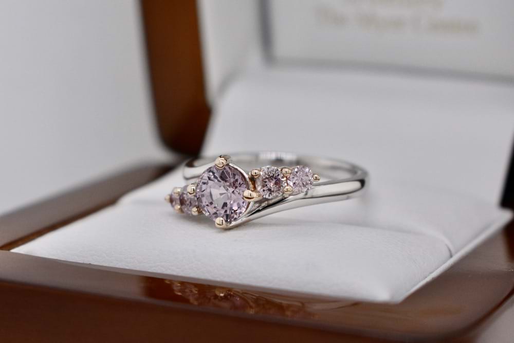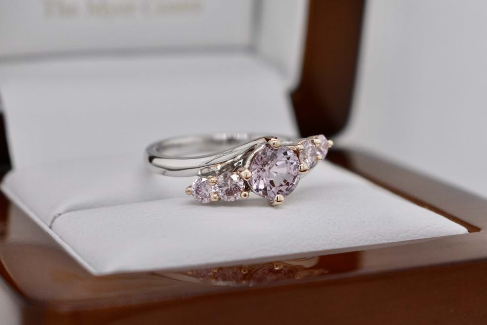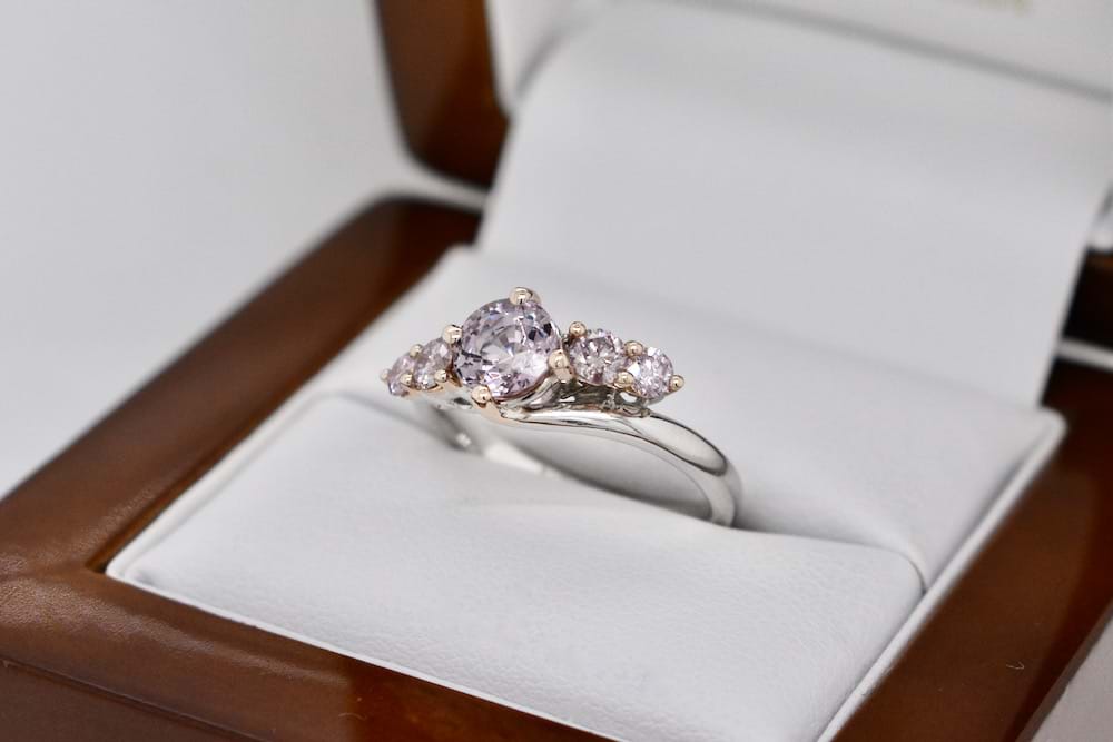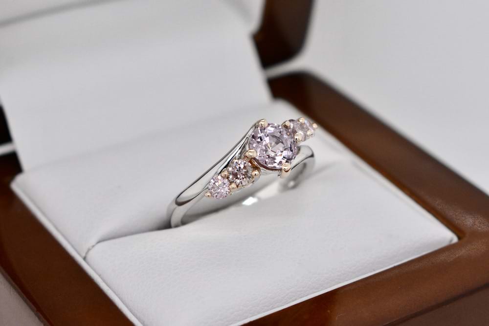 A beautiful blush purplish pink 0.99ct spinel from Burma set into four pink claws with two shimmering round brilliant cut pink diamonds set on an angle on each side. The four natural pink diamonds total 0.45cts and have been graded as fancy light pink colour, P1-2 clarity with a swept up 18ct white gold wave design band. Finger size M+ Independent Valuation Supplied.