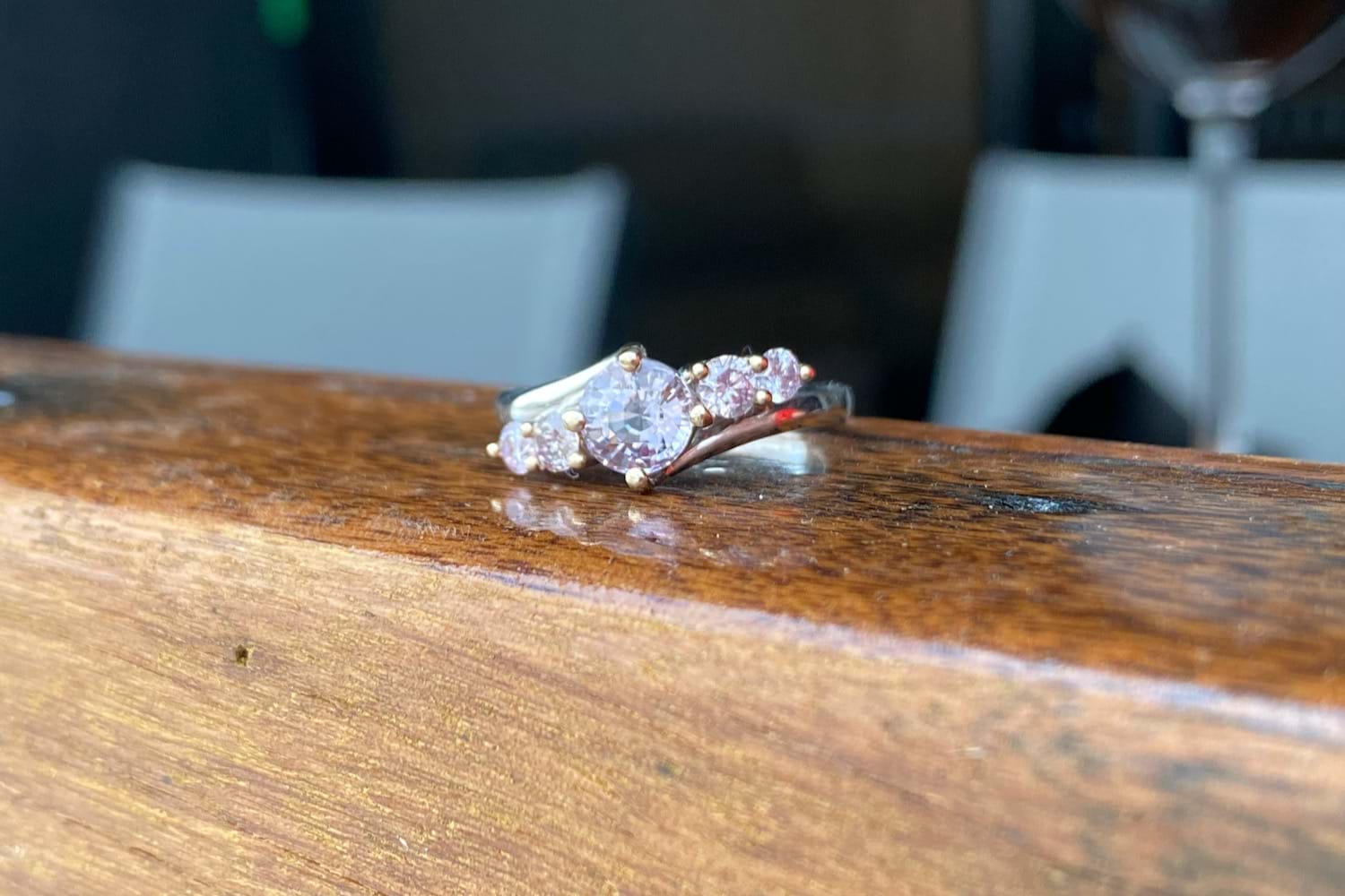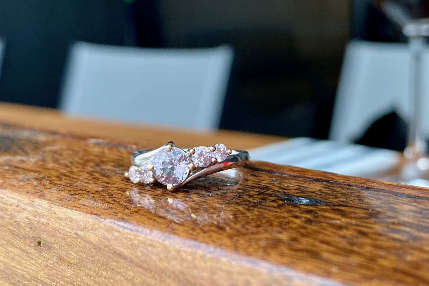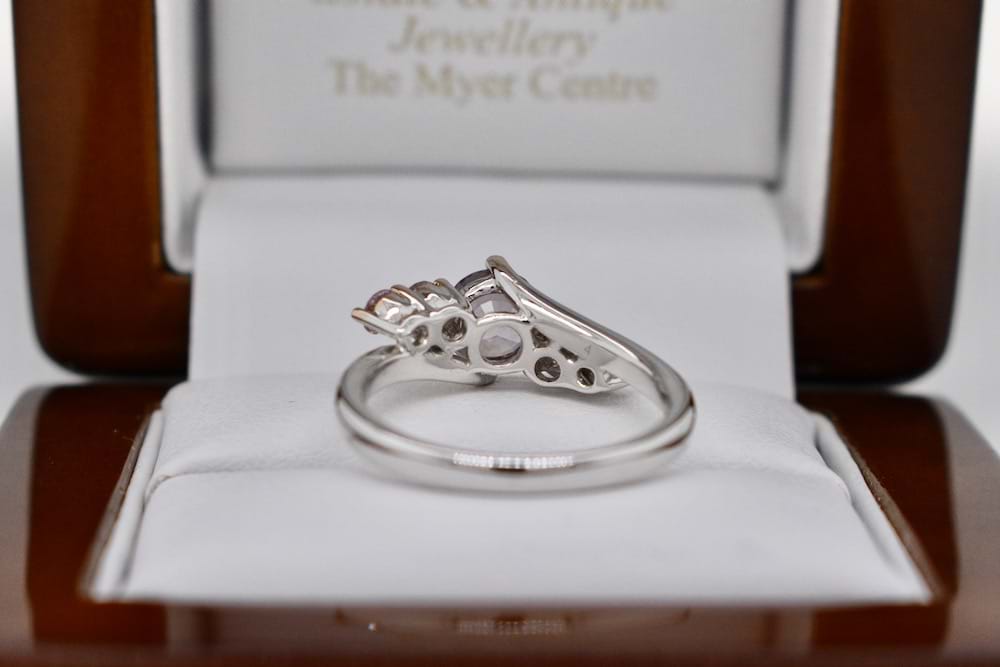 A beautiful blush purplish pink 0.99ct spinel from Burma set into four pink claws with two shimmering round brilliant cut pink diamonds set on an angle on each side. The four natural pink diamonds total 0.45cts and have been graded as fancy light pink colour, P1-2 clarity with a swept up 18ct white gold wave design band. Finger size M+ Independent Valuation Supplied.
