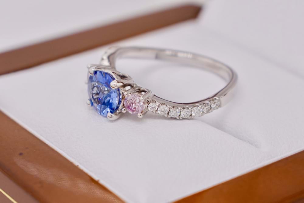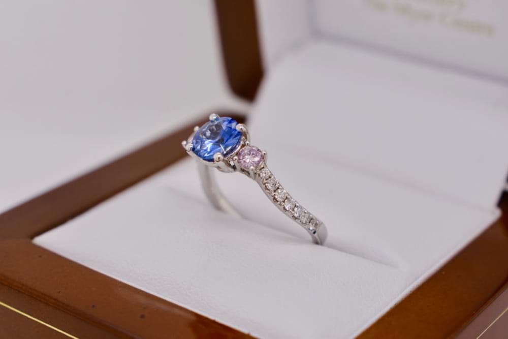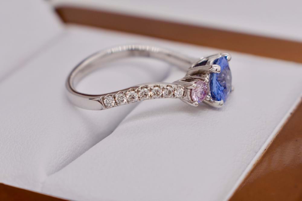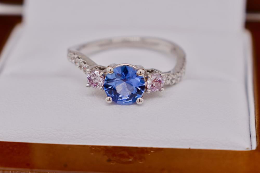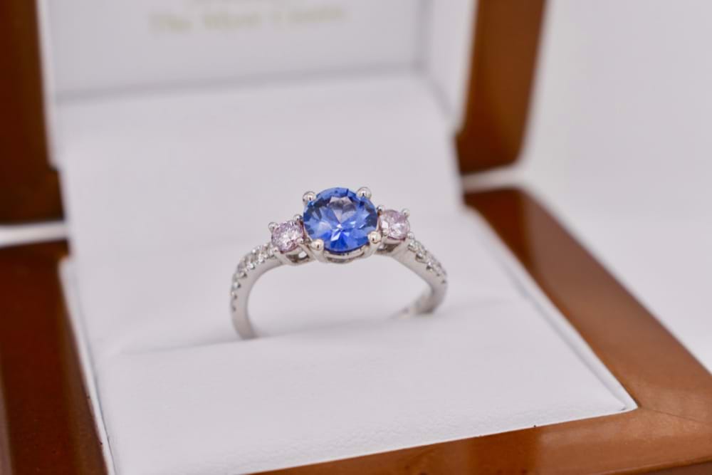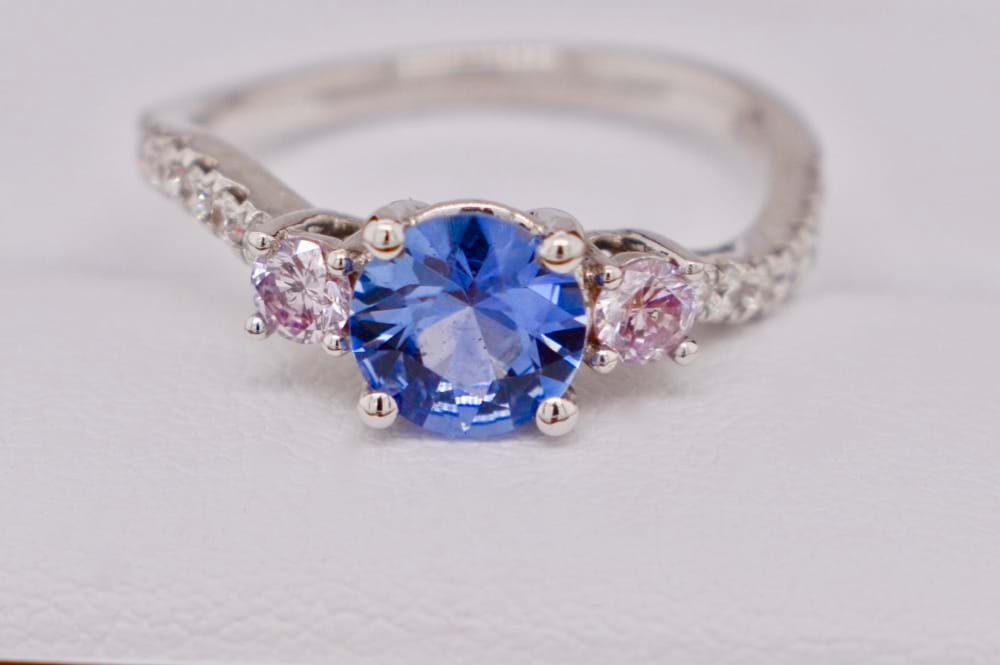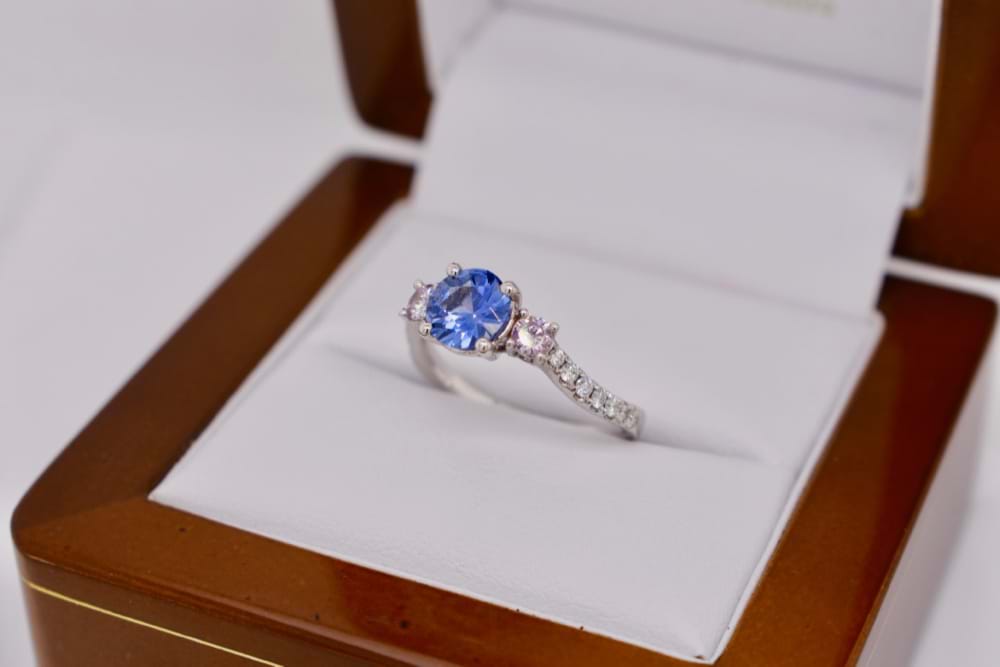 Crafted in 18ct white gold this light blue Ceylon sapphire of 1.05cts was chosen to be the center piece of this beautiful design. With two round brilliant cut pink diamonds completing the classic trilogy totaling 0.20ct (Light Fancy Pink, P1) what gives this ring a modern edge is the twisted diamond set band that follows down the shoulders from the pink diamonds. Total white diamond content equals 0.23cts (GSI). Independent Valuation Supplied