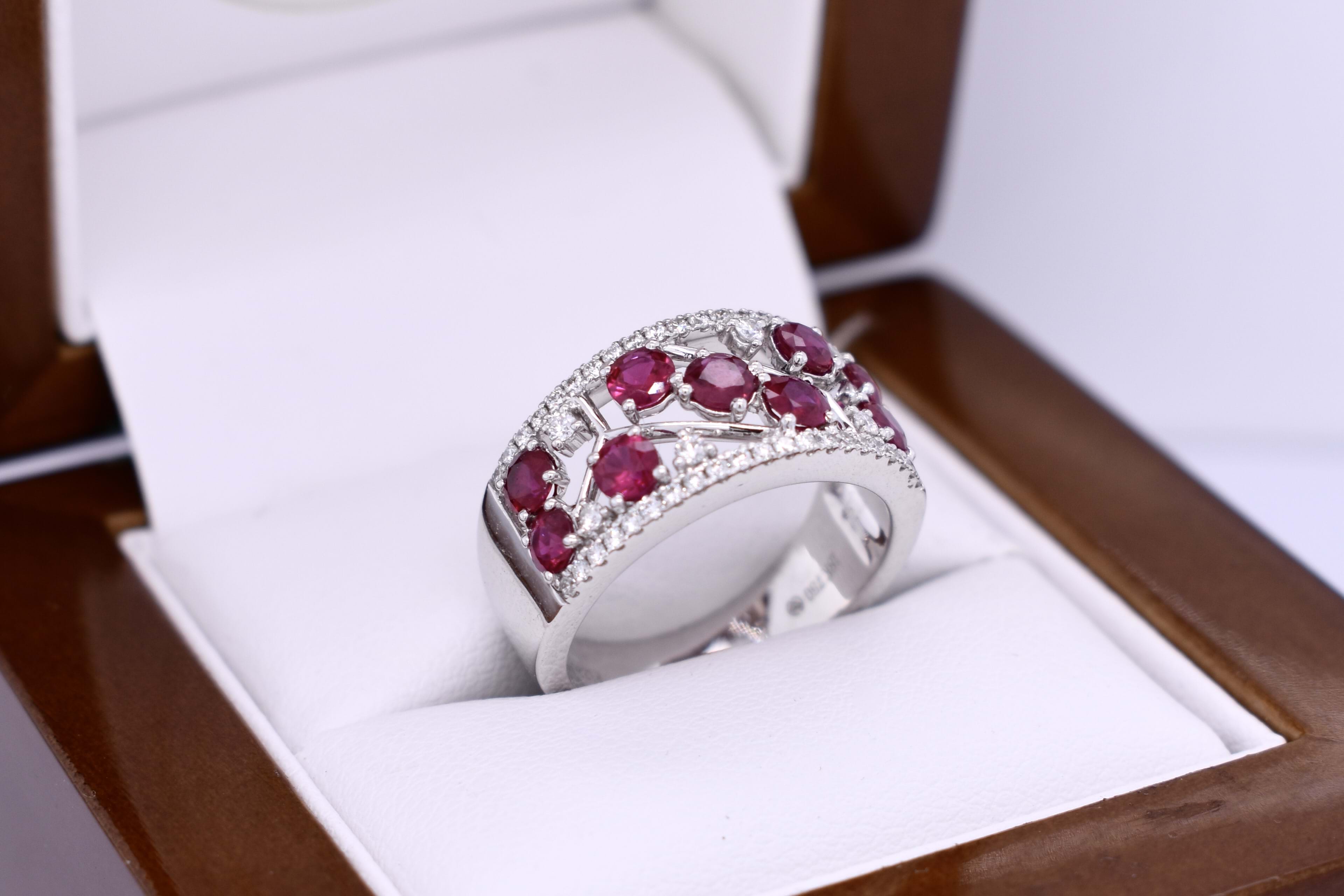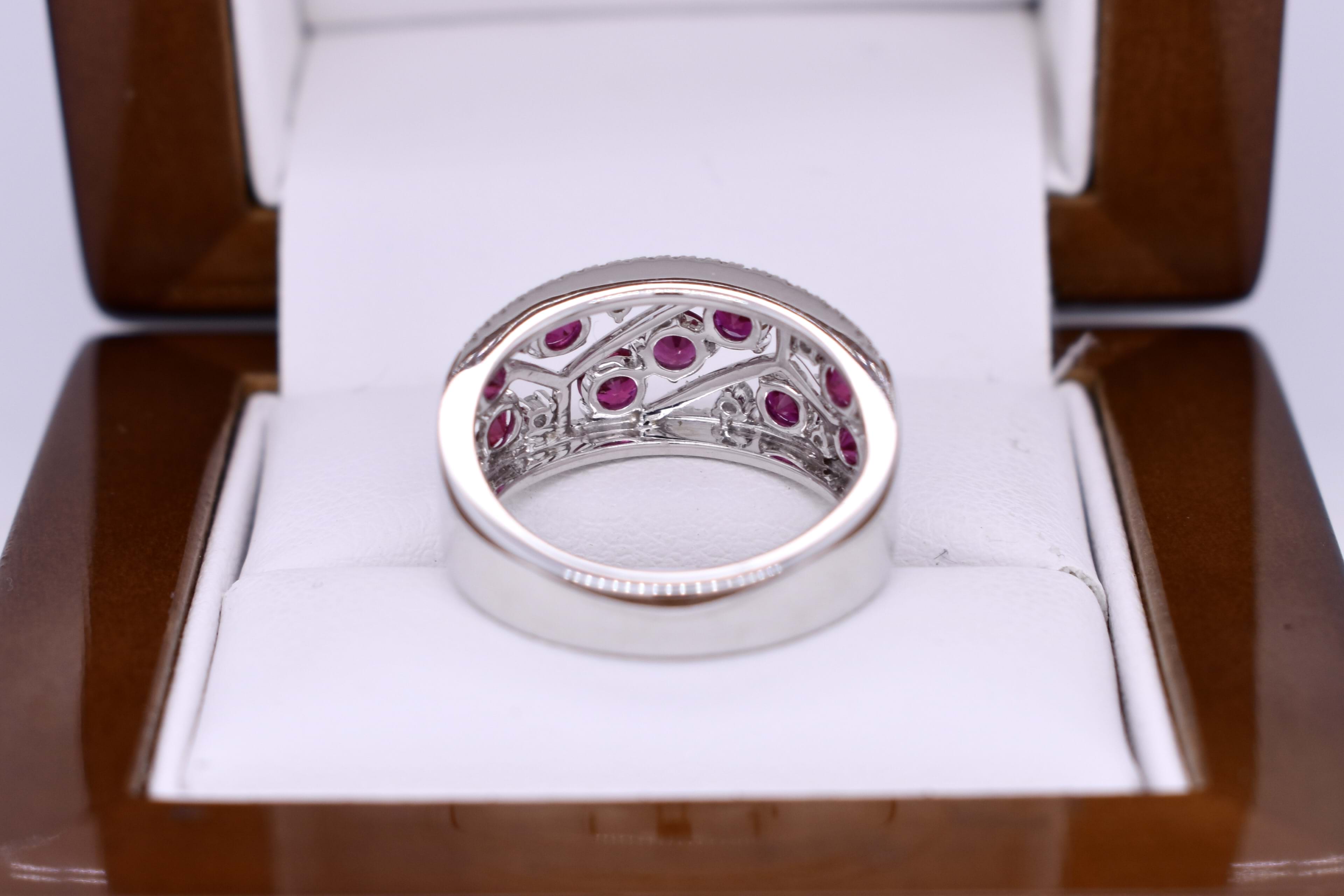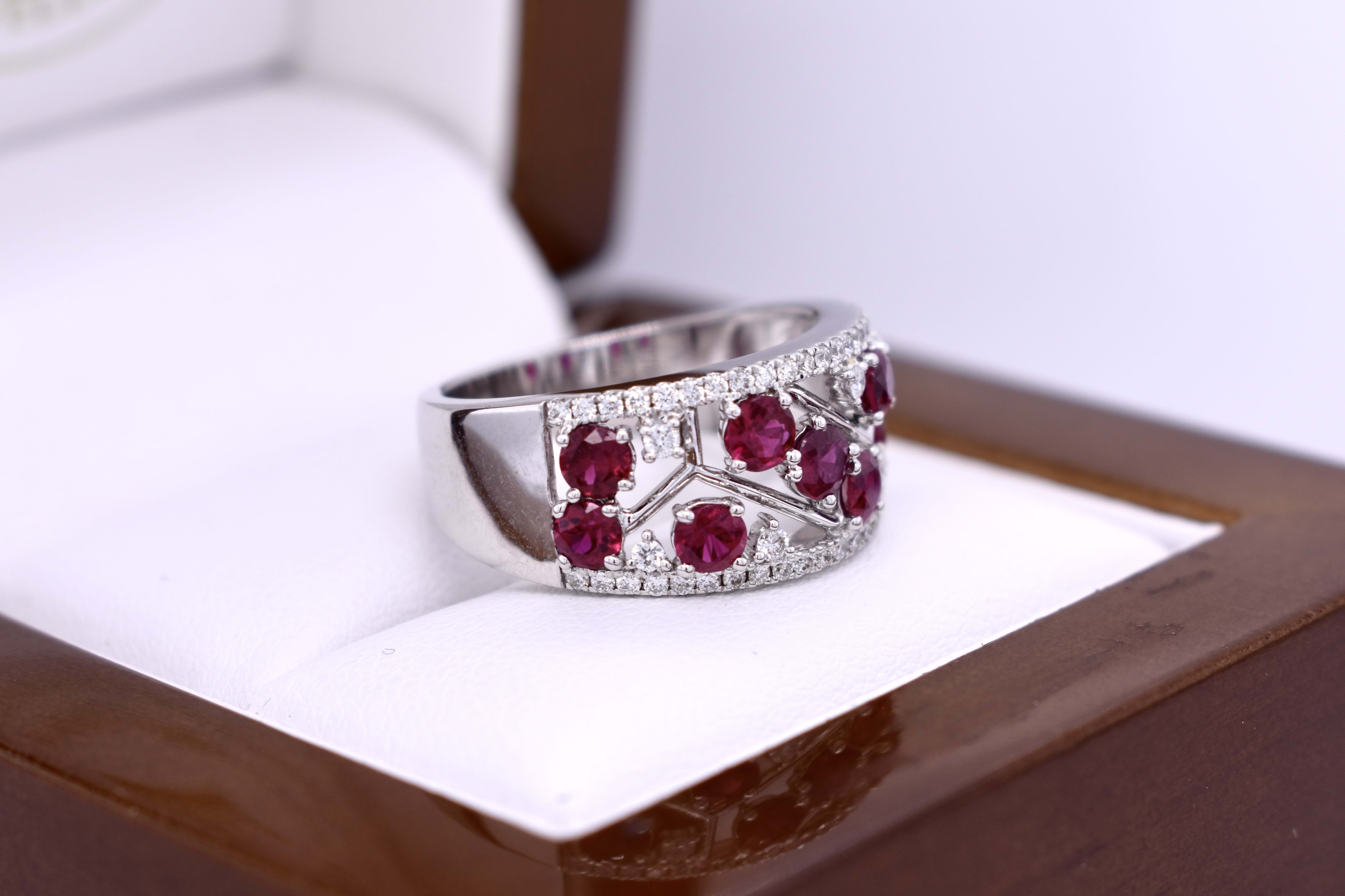 Beautifully crafted in 18ct white gold, this ruby and diamond ring features 9 3.25-3.00mm round bright pinkish red rubies claw set within a pierced out geometric centre of the band, lined above and below with 42 round brilliant cut 1.00mm diamonds equalling 0.19ct G VS-SI. A further 6 round brilliant cut 1.50mm diamonds are randomly scattered throughout the centre of the ring with the rubies. Completed on a 9.78-4.10mm soft edge flat band. 6.26 grams. Finger size M. Independent Valuation Supplied.