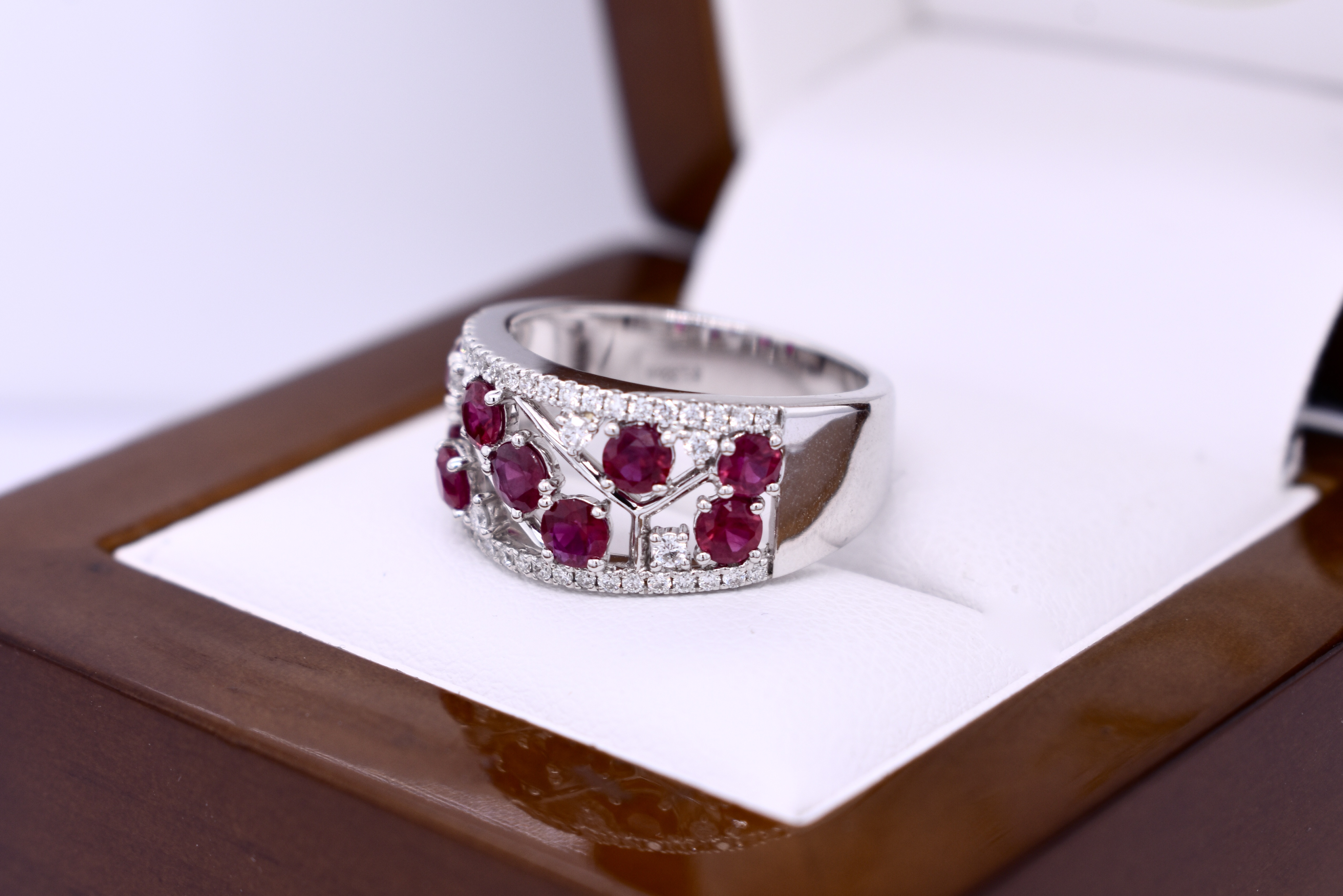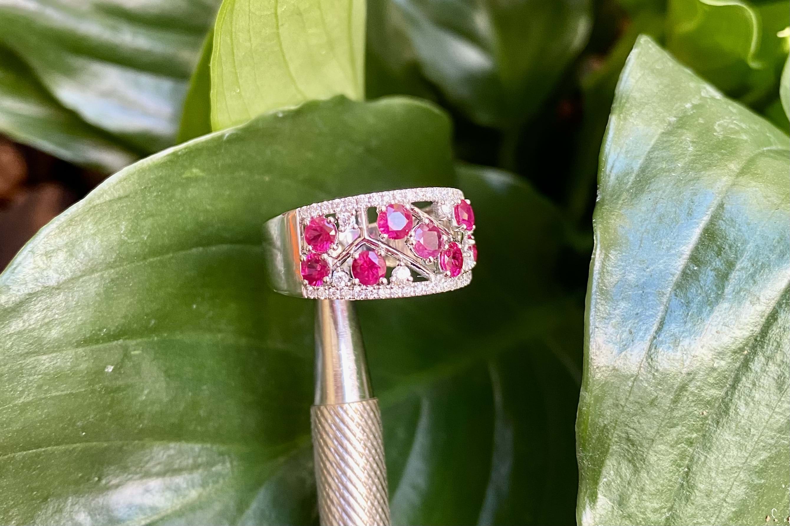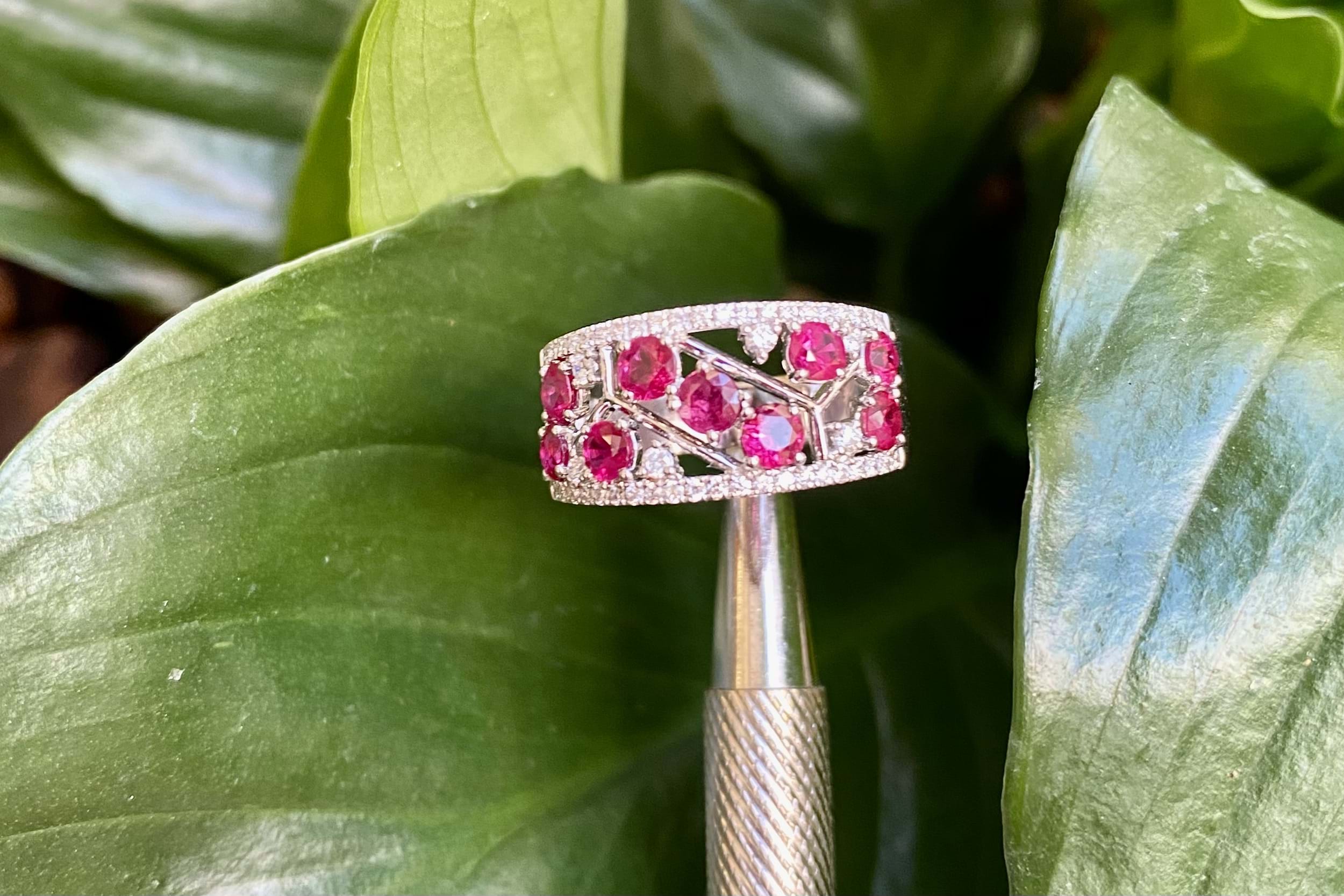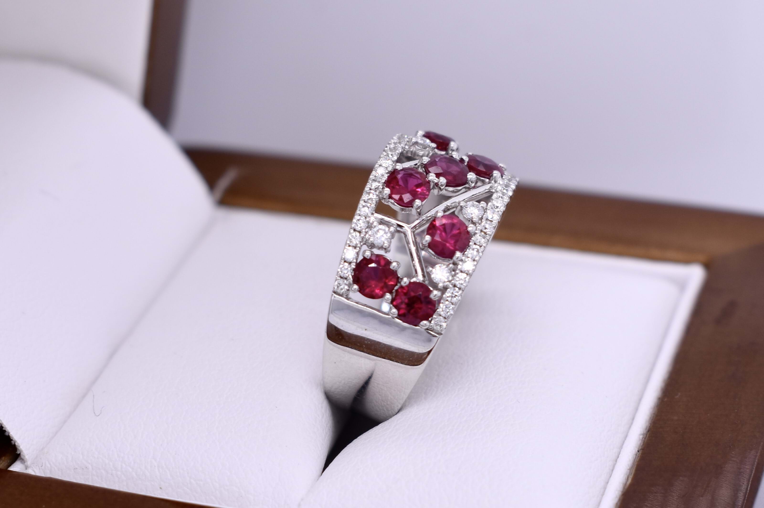 Beautifully crafted in 18ct white gold, this ruby and diamond ring features 9 3.25-3.00mm round bright pinkish red rubies claw set within a pierced out geometric centre of the band, lined above and below with 42 round brilliant cut 1.00mm diamonds equalling 0.19ct G VS-SI. A further 6 round brilliant cut 1.50mm diamonds are randomly scattered throughout the centre of the ring with the rubies. Completed on a 9.78-4.10mm soft edge flat band. 6.26 grams. Finger size M. Independent Valuation Supplied.