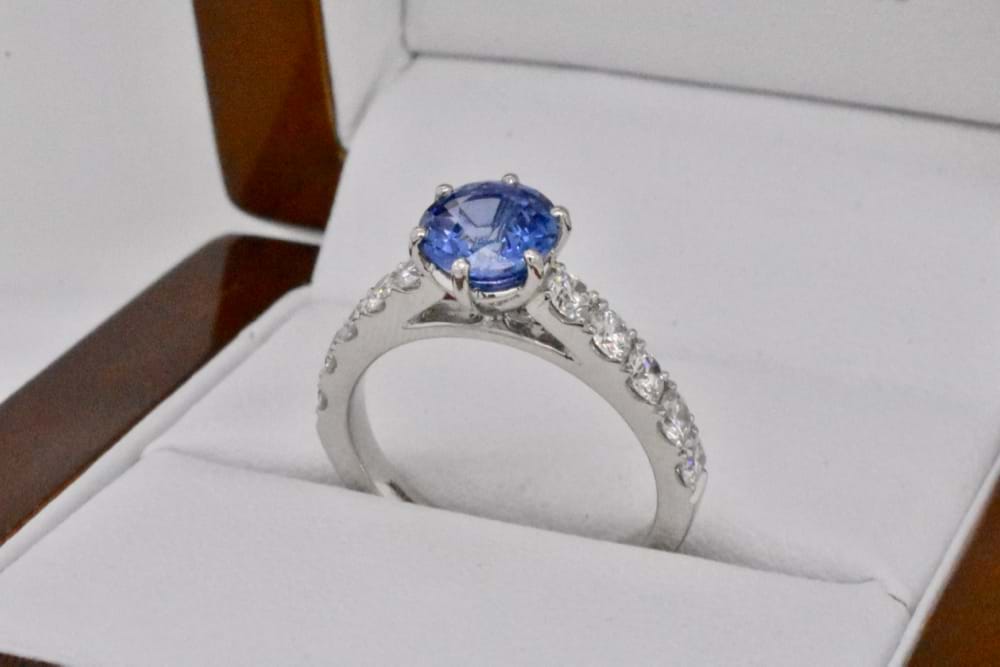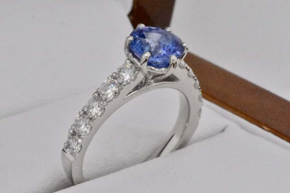 Gorgeous 1.59ct, mid slightly purplish blue, Ceylon sapphire six claw set into this luxurious platinum ring. With five round brilliant cut diamonds, cut away claw, set down each shoulder and a combined total of 0.78cts (F/VS) this ring is designed to sit perfectly with wedding bands. Independent Valuation Supplied. Finger size L