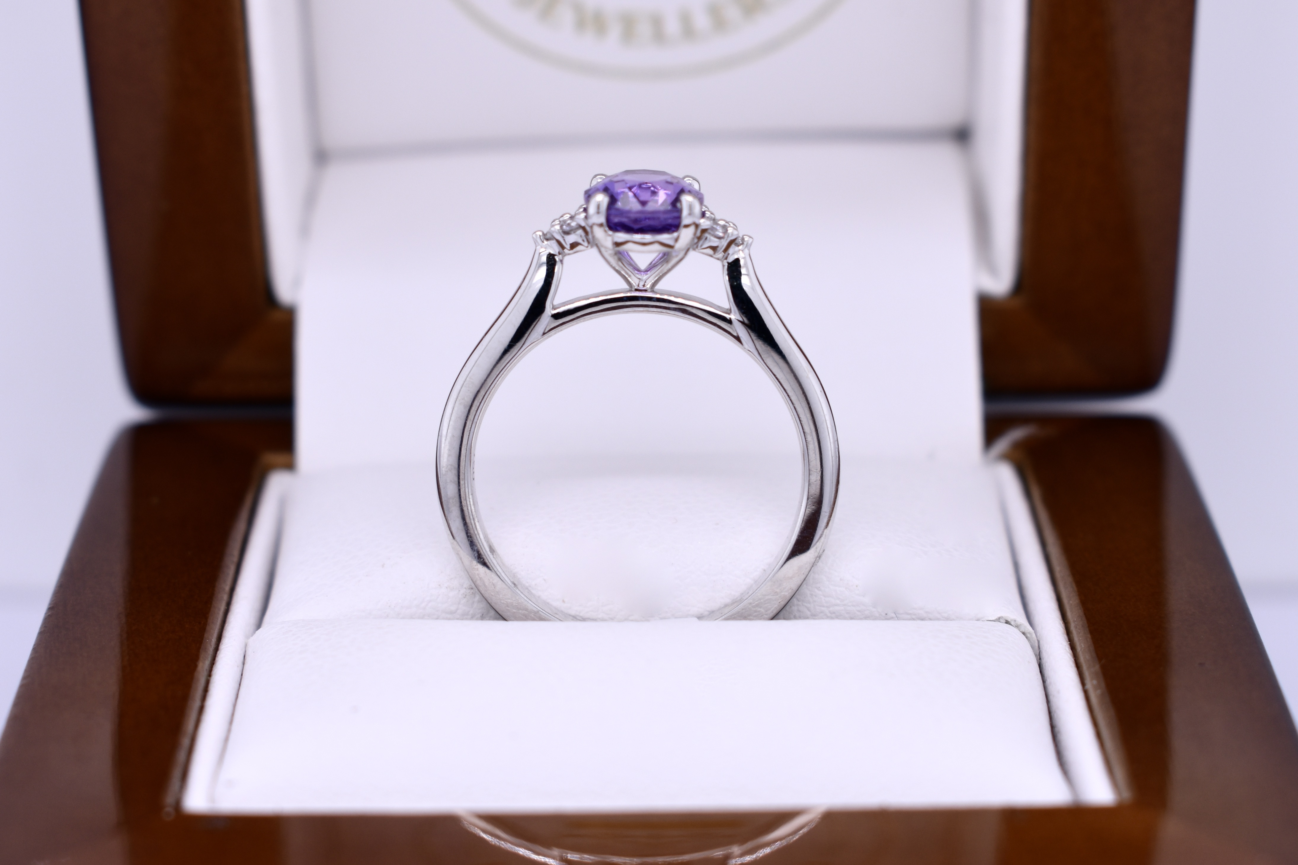 A gorgeous bright purple oval Ceylon sapphire of 1.64cts four claw set in 18ct white gold with three shimmering, white, round brilliant cut diamonds cluster set on each side with a tapered plain band. Total diamond content equals 0.07ct GSI. Finger size M. Independent Valuation available following purchase.