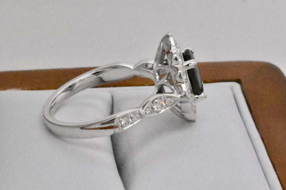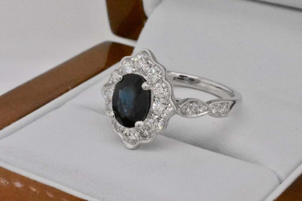 Featuring a hand selected 1.73ct bright dark blue Australian sapphire, claw set in the center of a mill grain scalloped marquise shape halo of shimmering round brilliant cut diamonds and scalloped diamond set shoulders. Total diamond content equals 0.86cts (GVS-SI). Finger size M. Independent Valuation Supplied