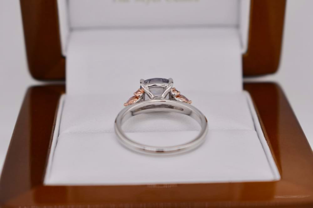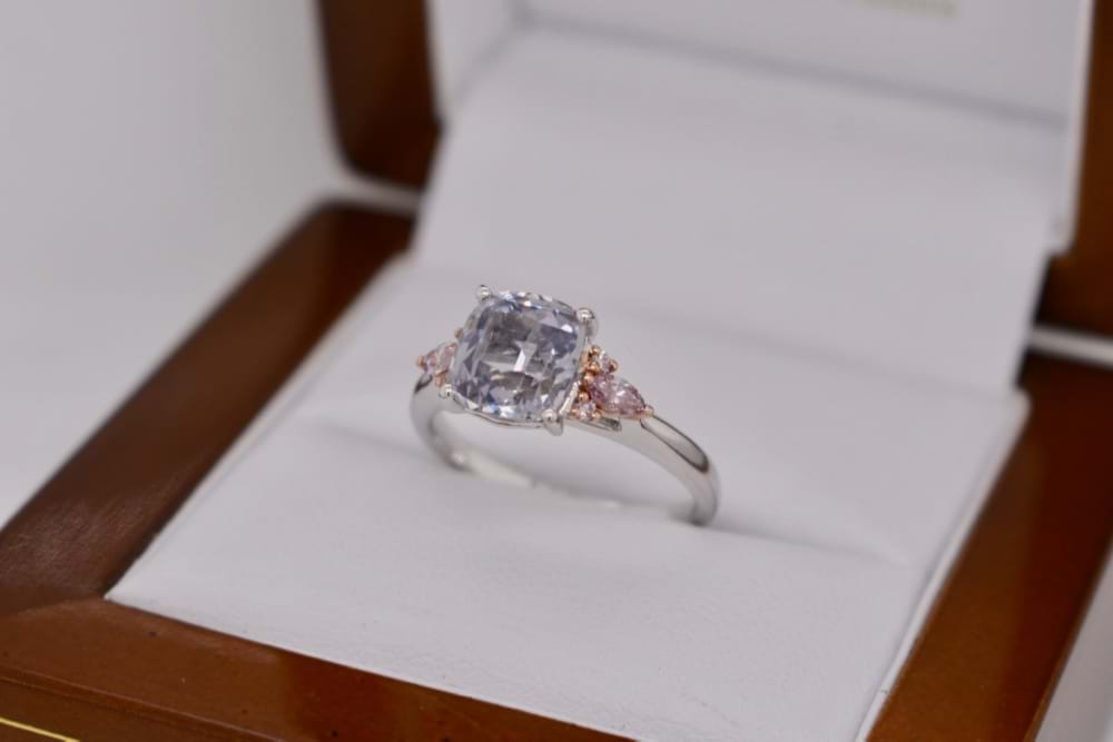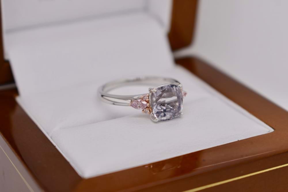 This stunning light grey cushion cut 2.63ct Spinel is set in 18ct white gold, with contrasting rose gold settings for the supporting two marquise and four round brilliant cut natural pink diamonds totalling 0.20ct. Finger size N