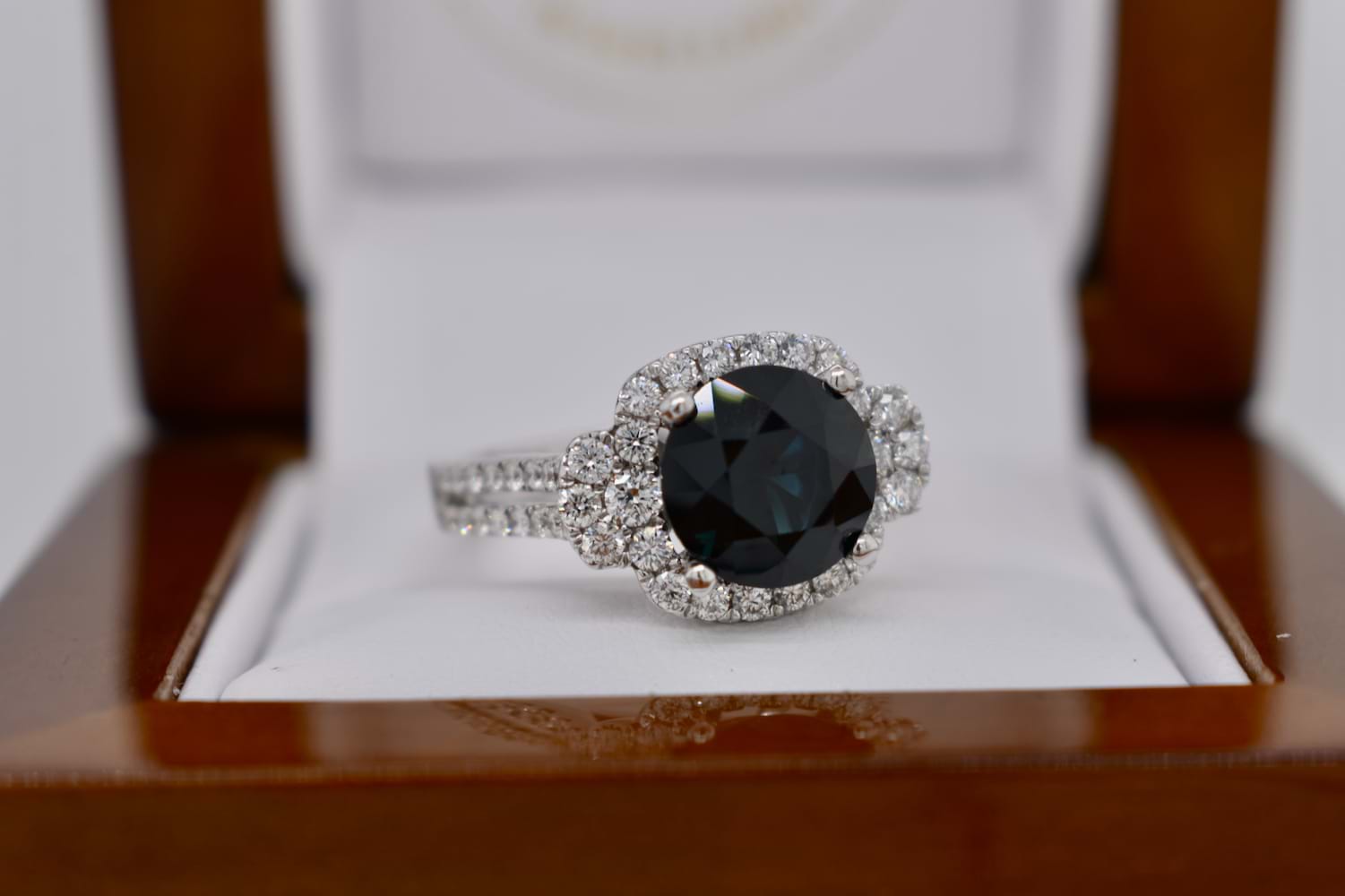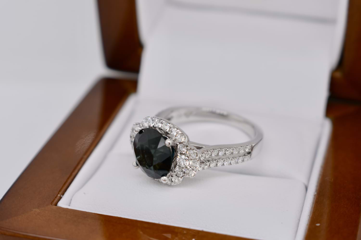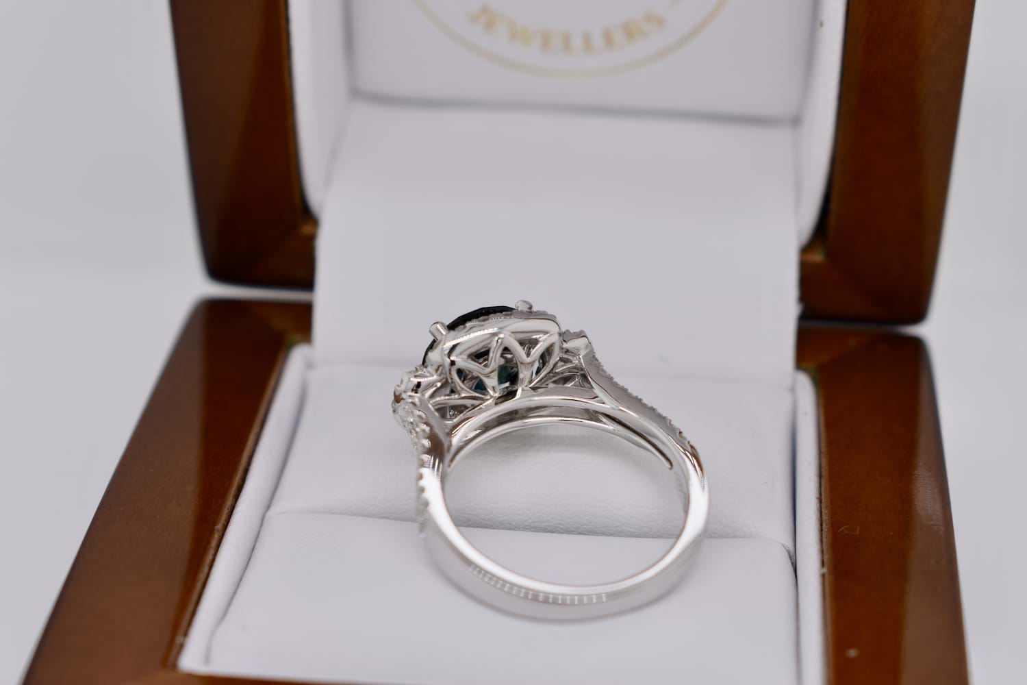 SOLD 18ct White Gold 3.18ct Teal Sapphire & 0.80ct Diamond Halo Ring