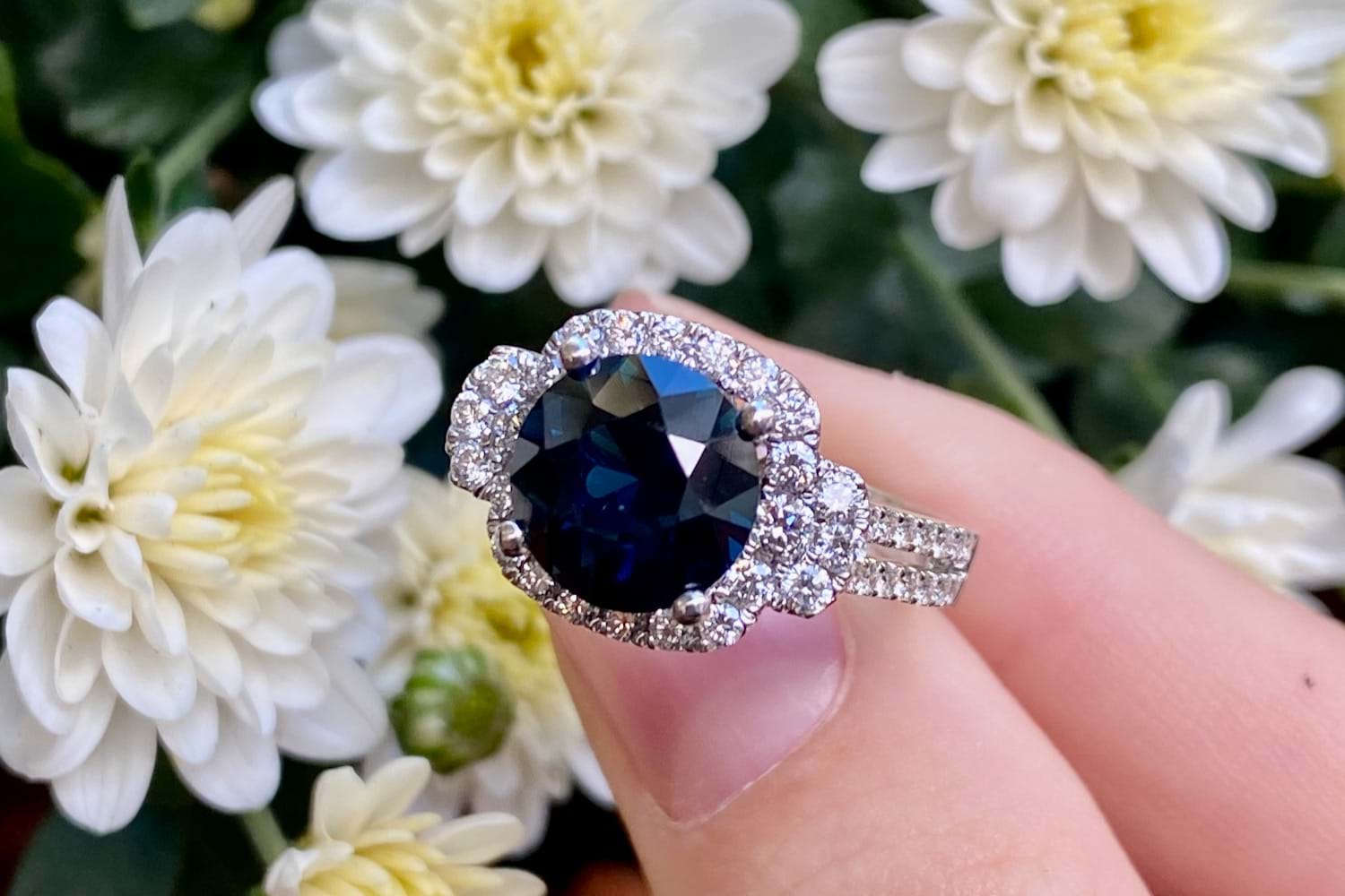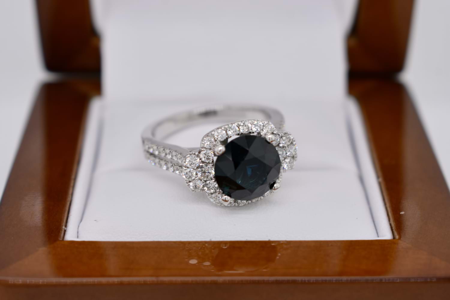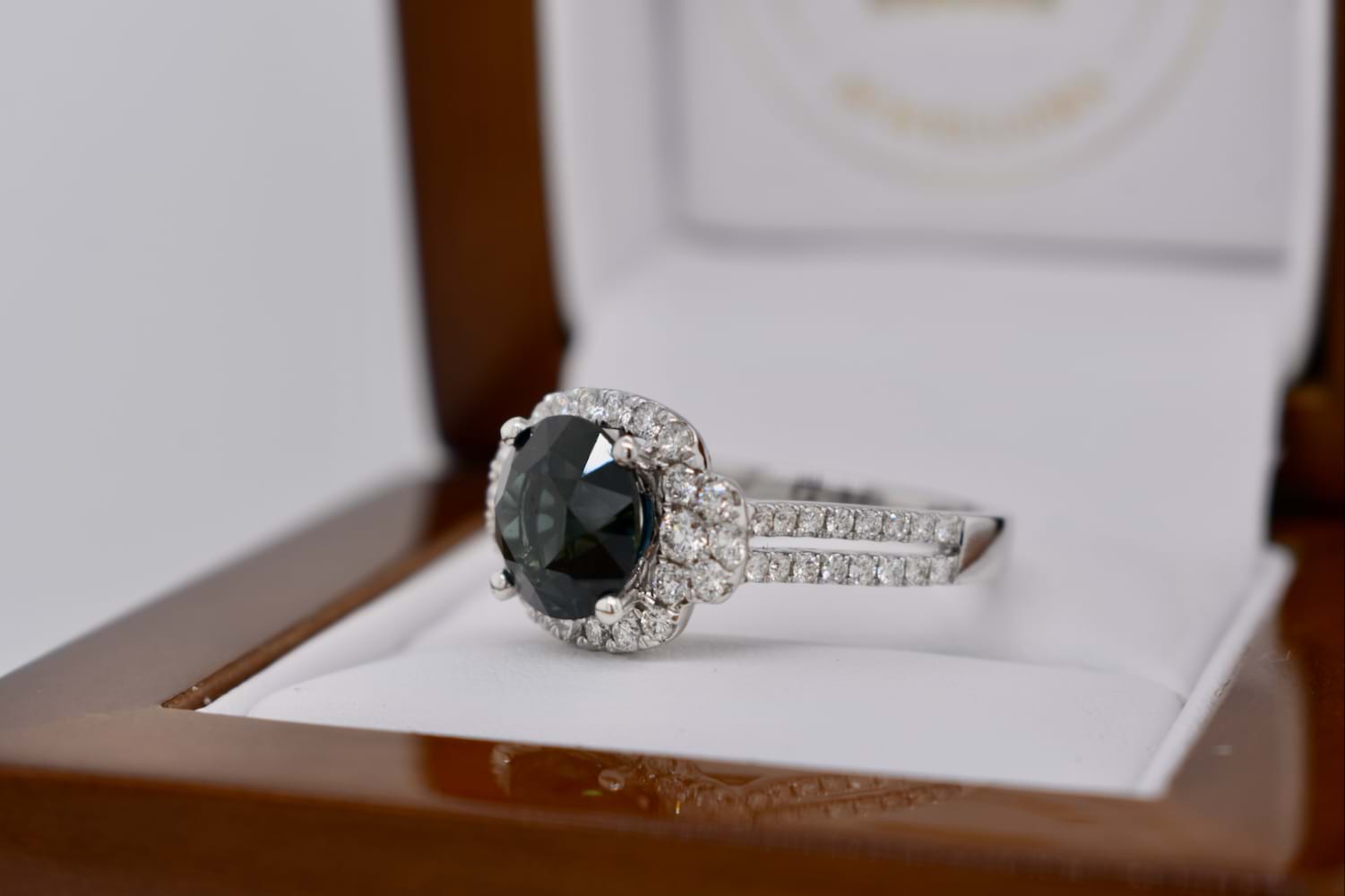 SOLD 18ct White Gold 3.18ct Teal Sapphire & 0.80ct Diamond Halo Ring