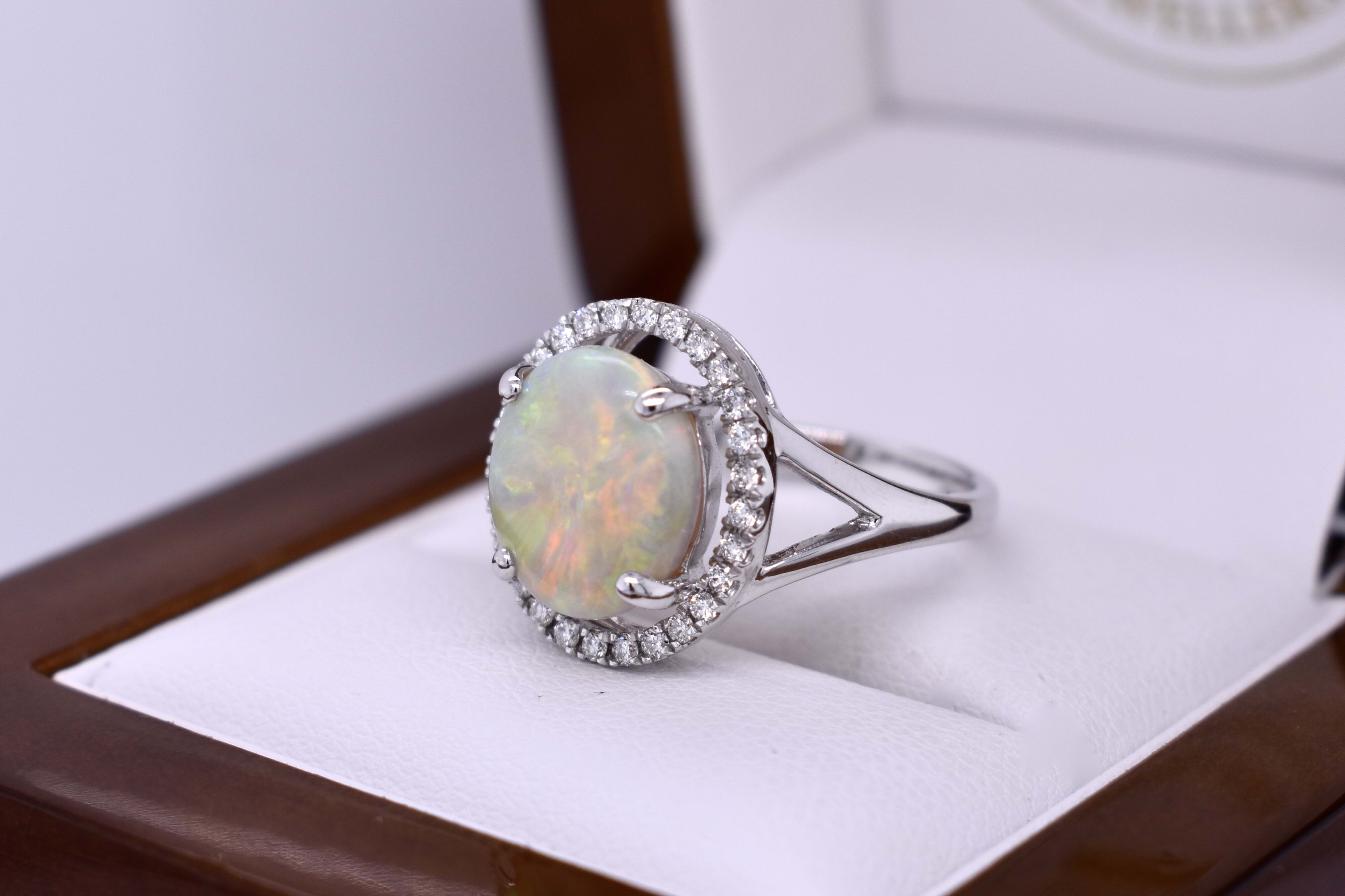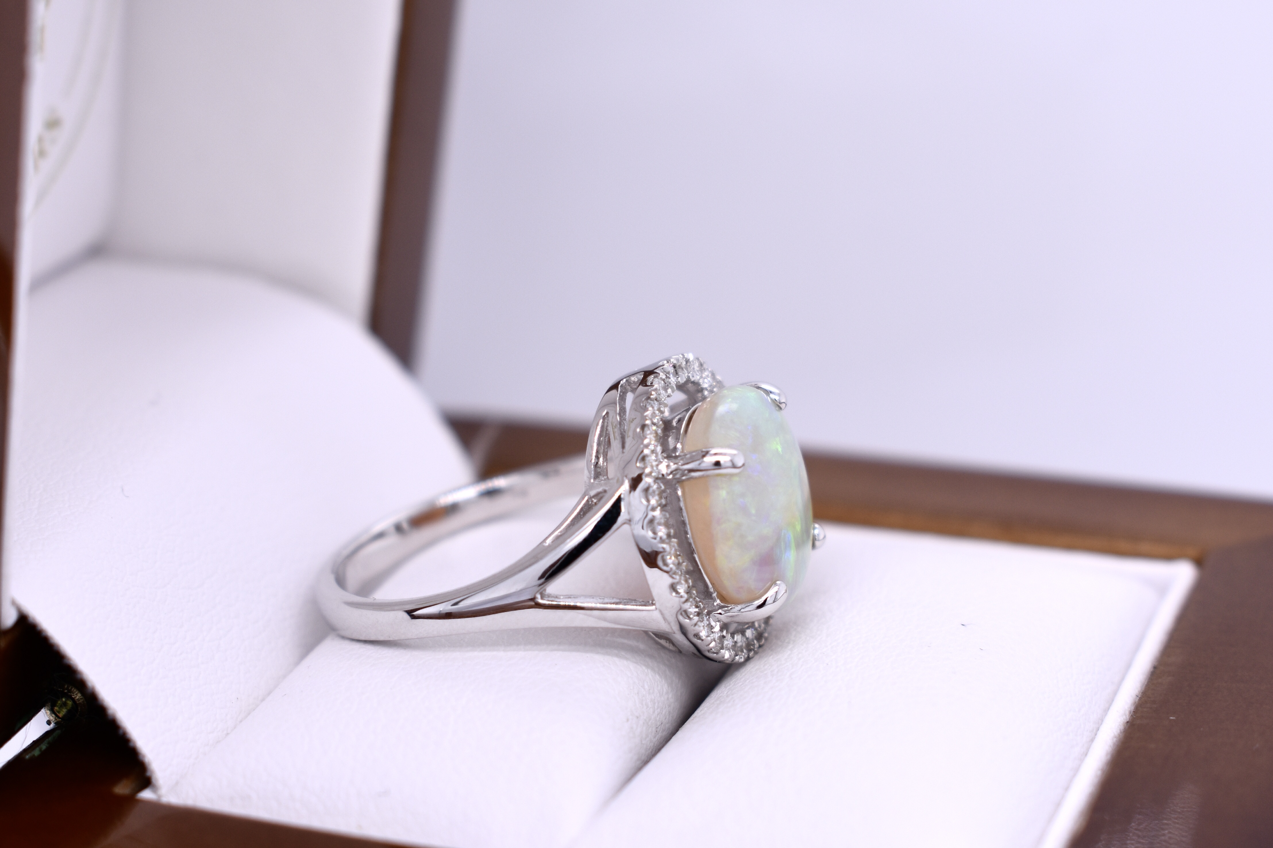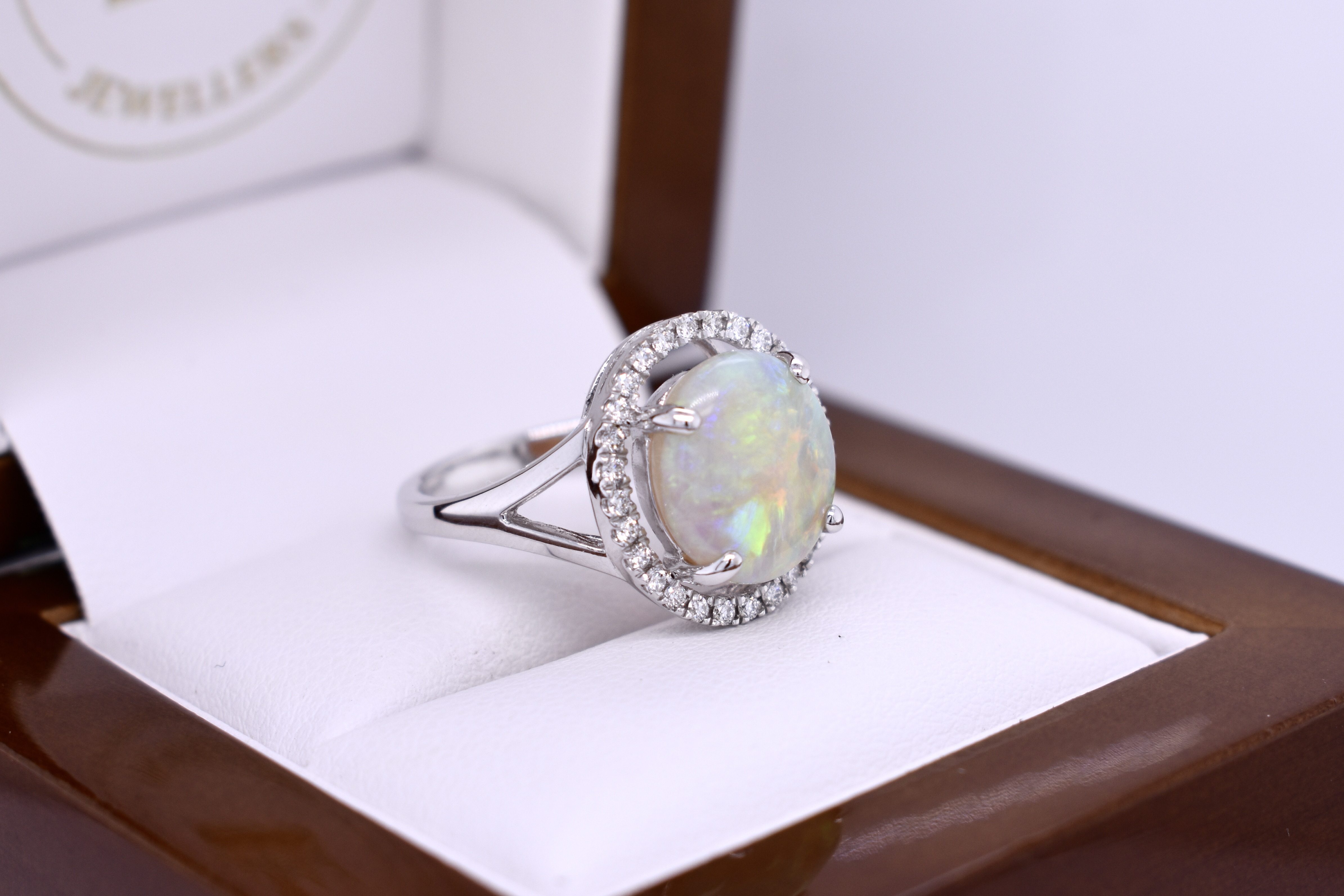 This lovely oval ring featuring a Coober Pedy solid opal of 3.29ct, measuring 11.35x9.92x4.45mm, with mixed pattern of blue, green and orange throughout. The opal is four claw set in 18ct white gold, surrounded by a shimmering halo of 28 round brilliant cut diamonds, measuring 1.30mm, totalling 0.28ct G VS-SI. Finished on a half round 2.36mm tapered band with split shoulders. Finger size N+. Independent Valuation Supplied.