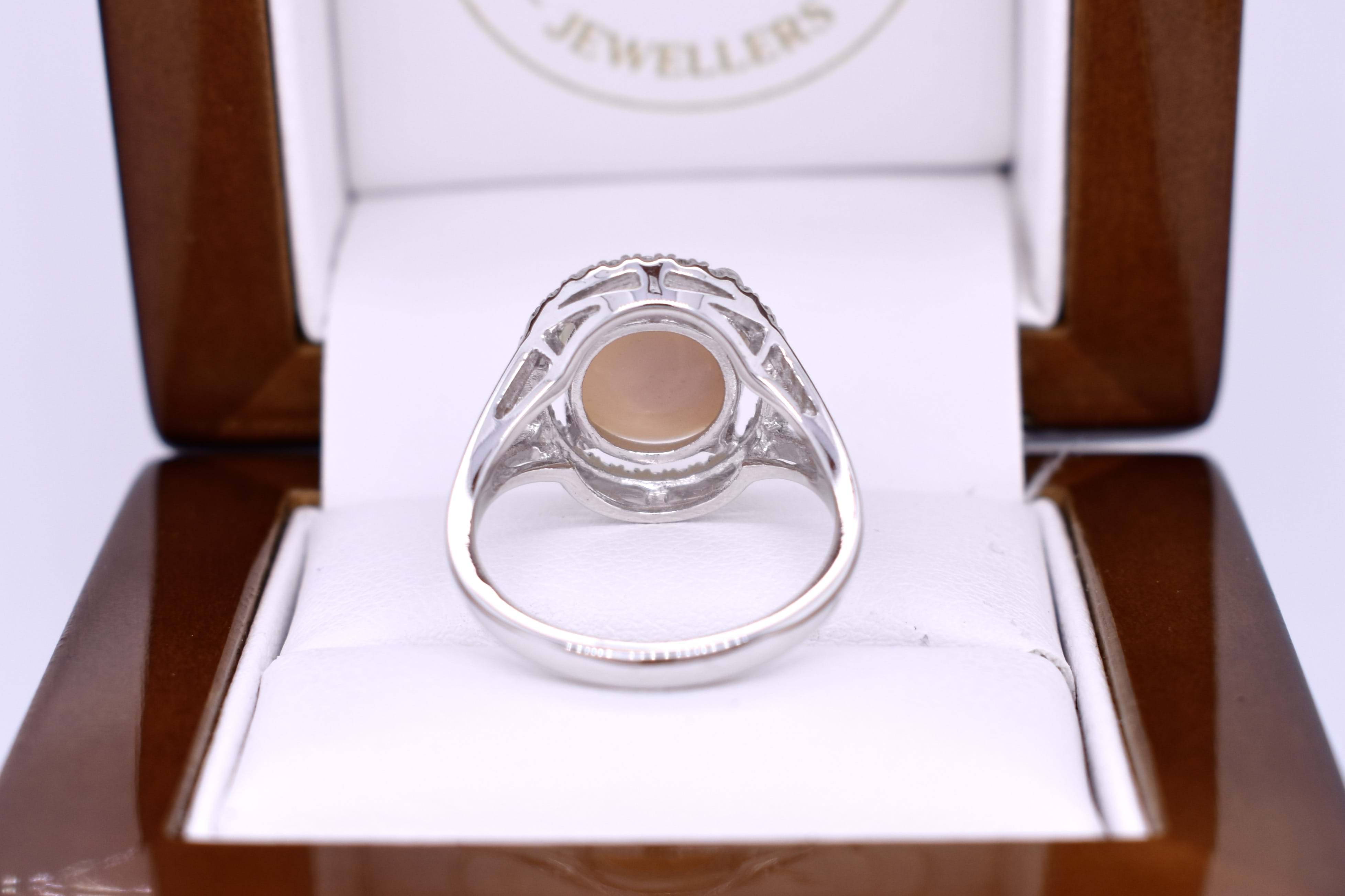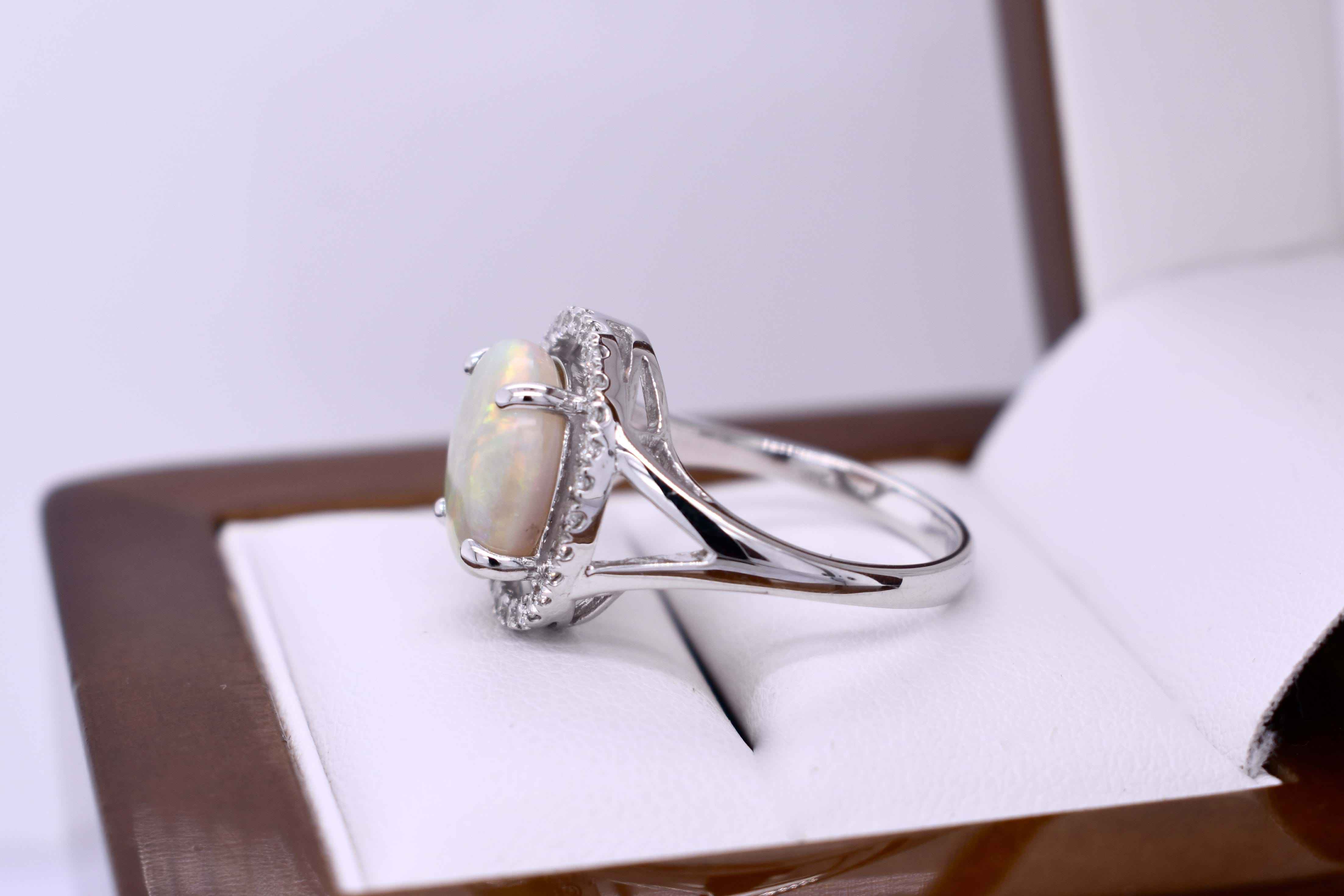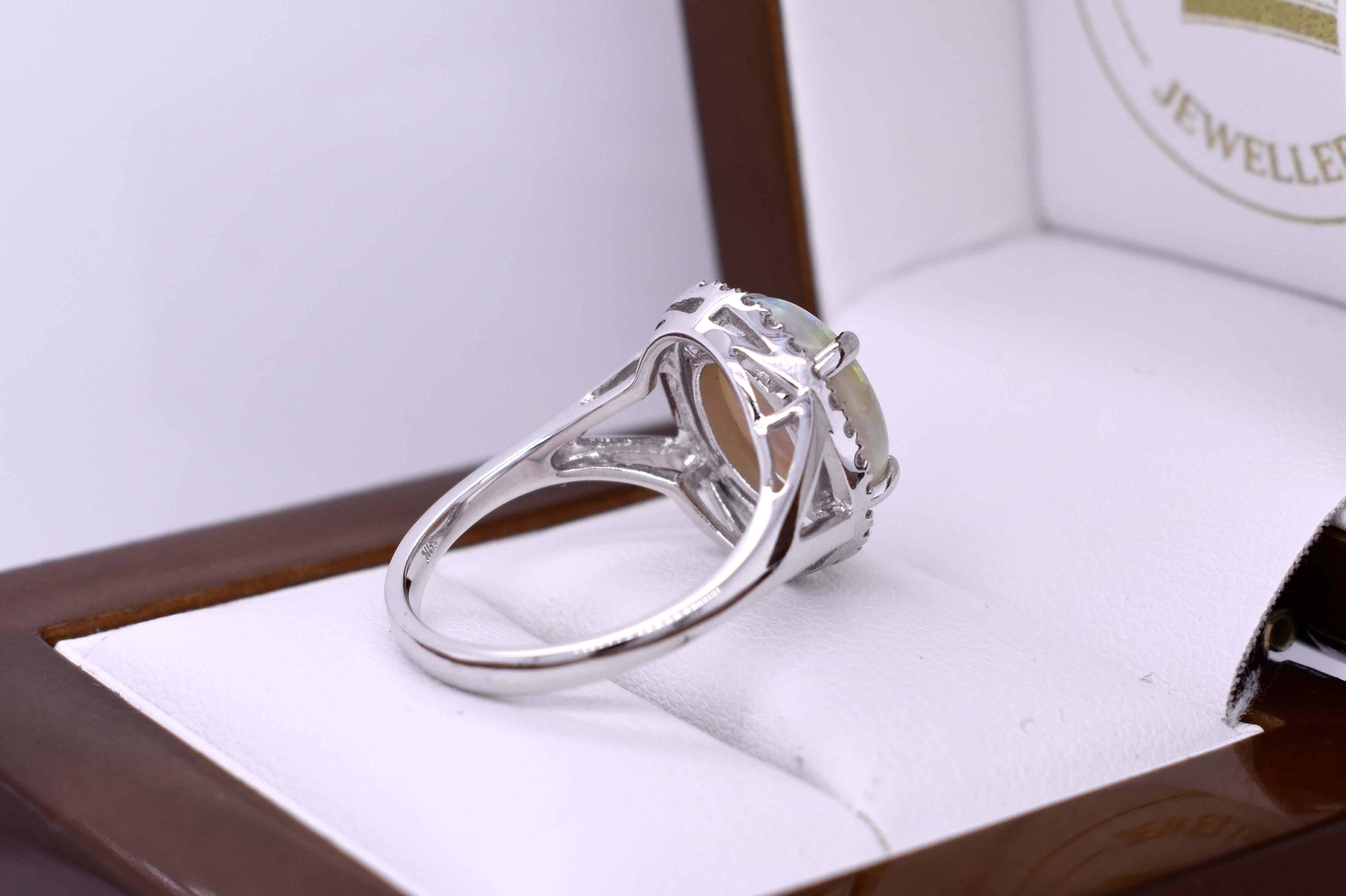 This lovely oval ring featuring a Coober Pedy solid opal of 3.29ct, measuring 11.35x9.92x4.45mm, with mixed pattern of blue, green and orange throughout. The opal is four claw set in 18ct white gold, surrounded by a shimmering halo of 28 round brilliant cut diamonds, measuring 1.30mm, totalling 0.28ct G VS-SI. Finished on a half round 2.36mm tapered band with split shoulders. Finger size N+. Independent Valuation Supplied.
