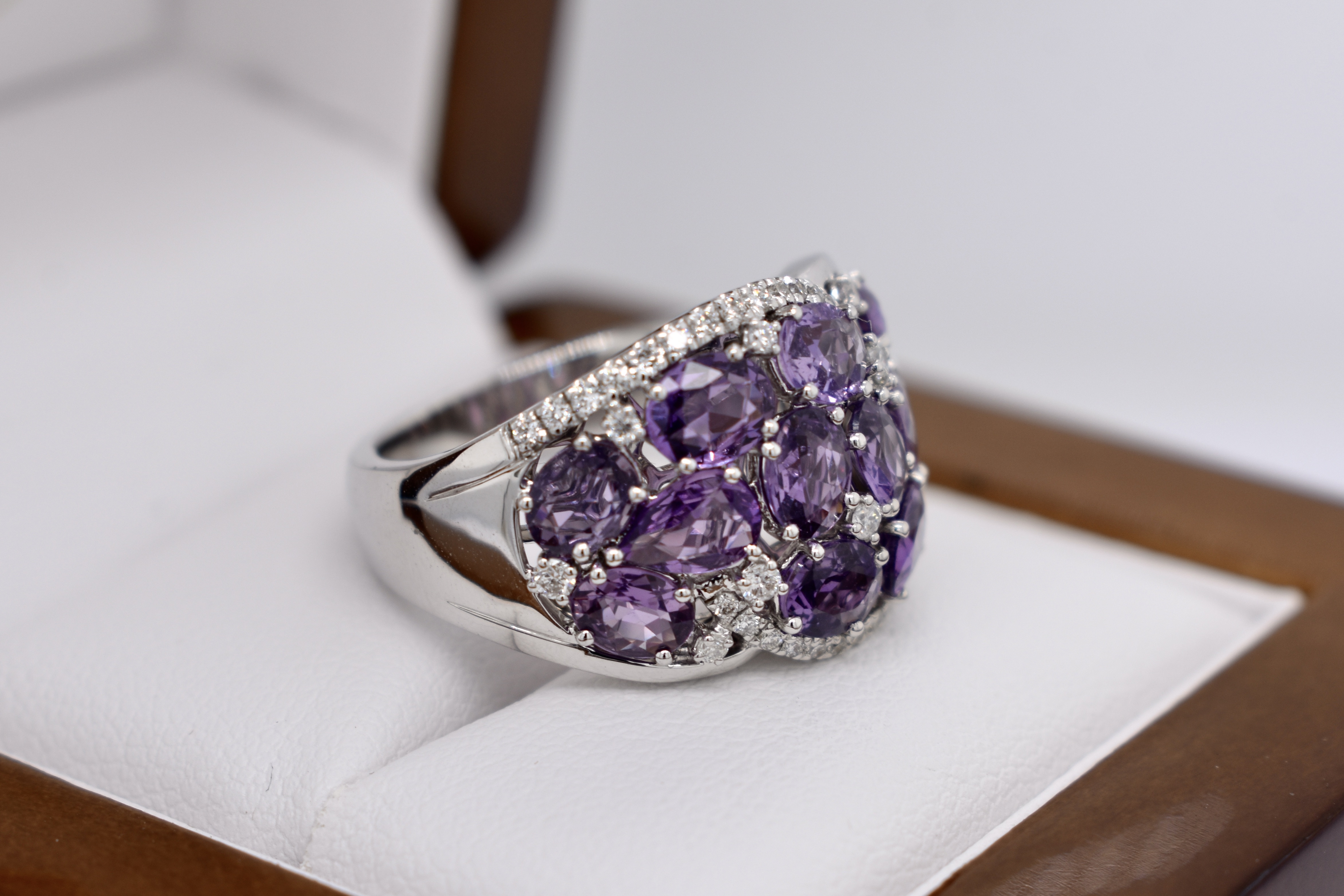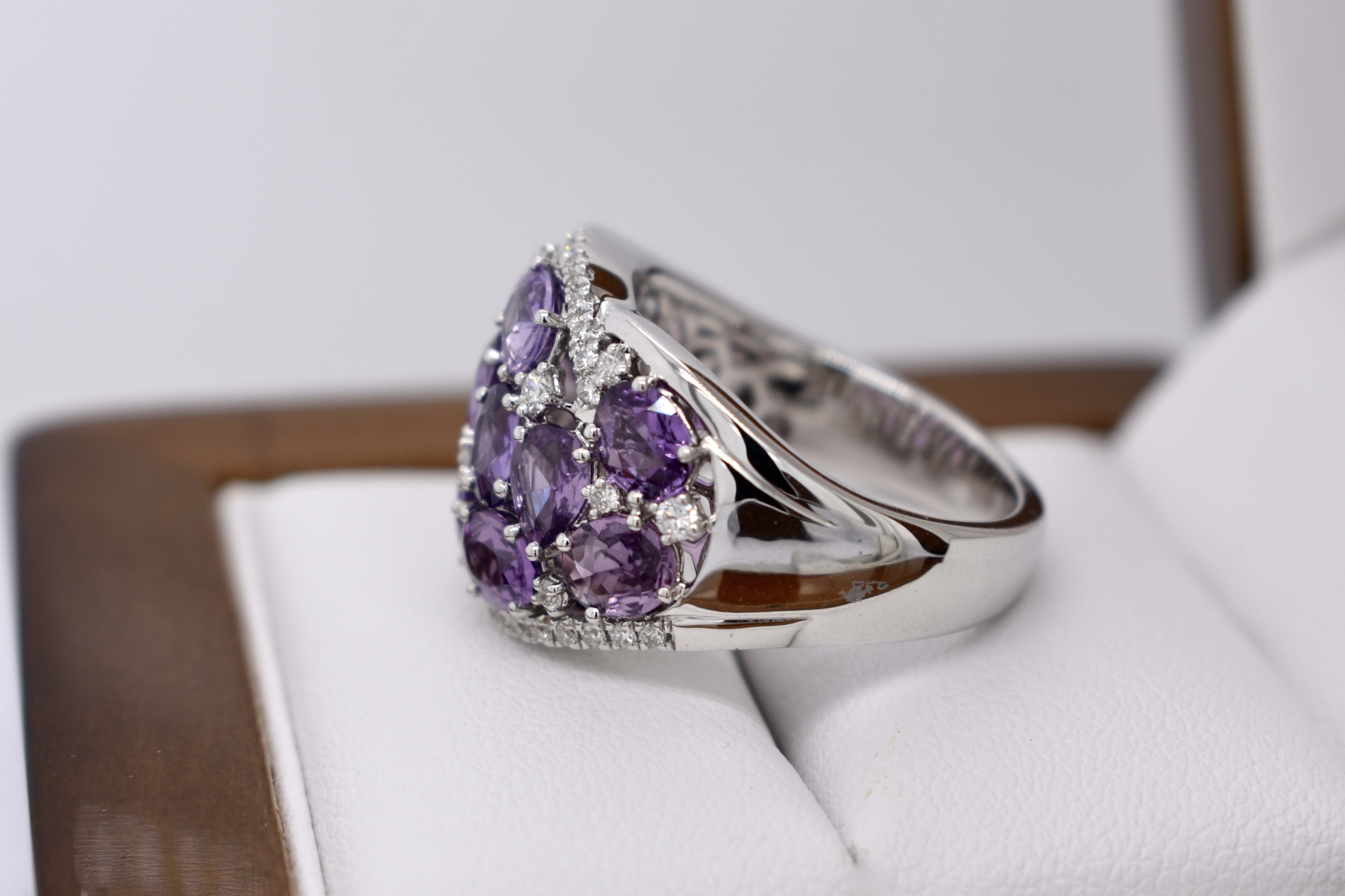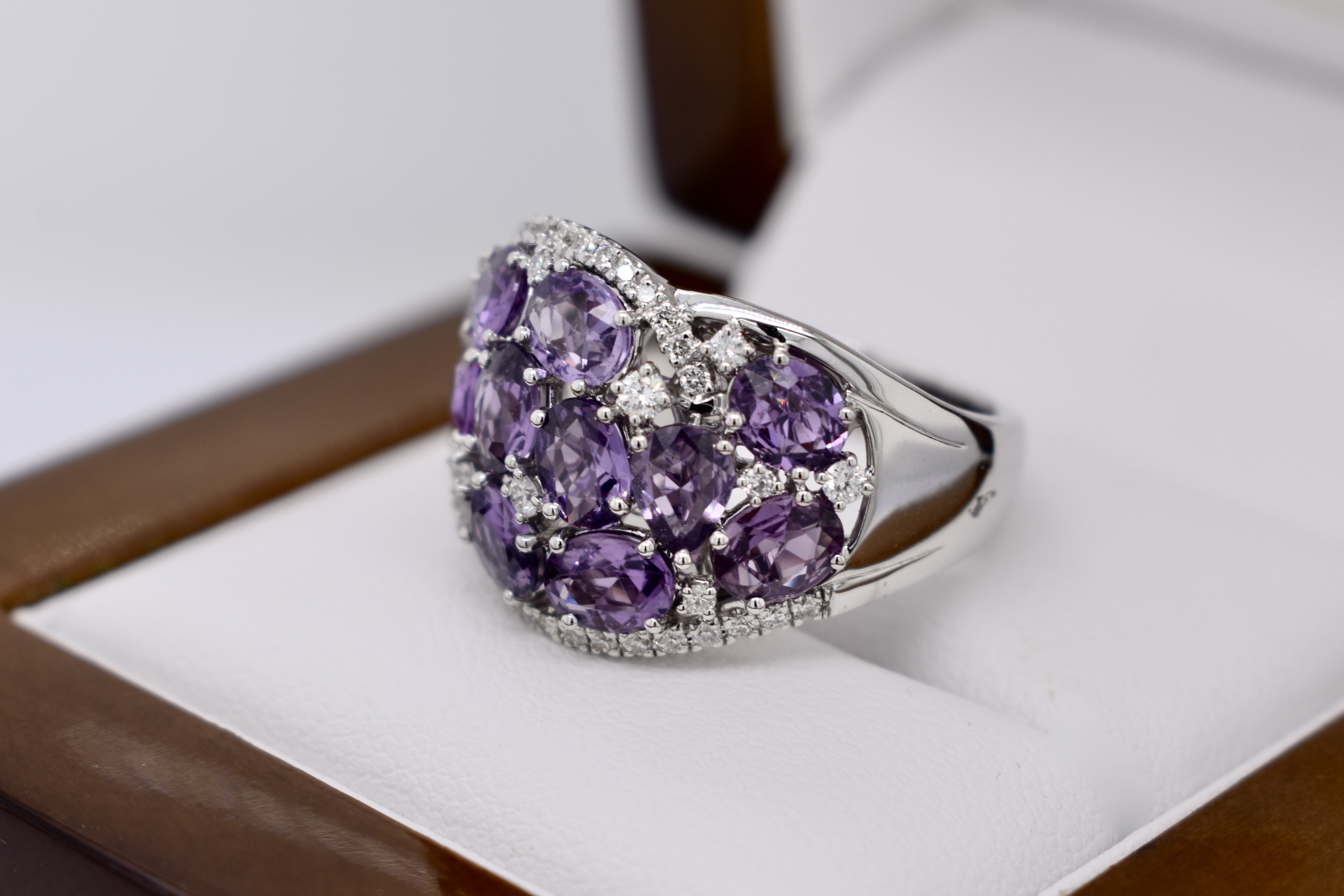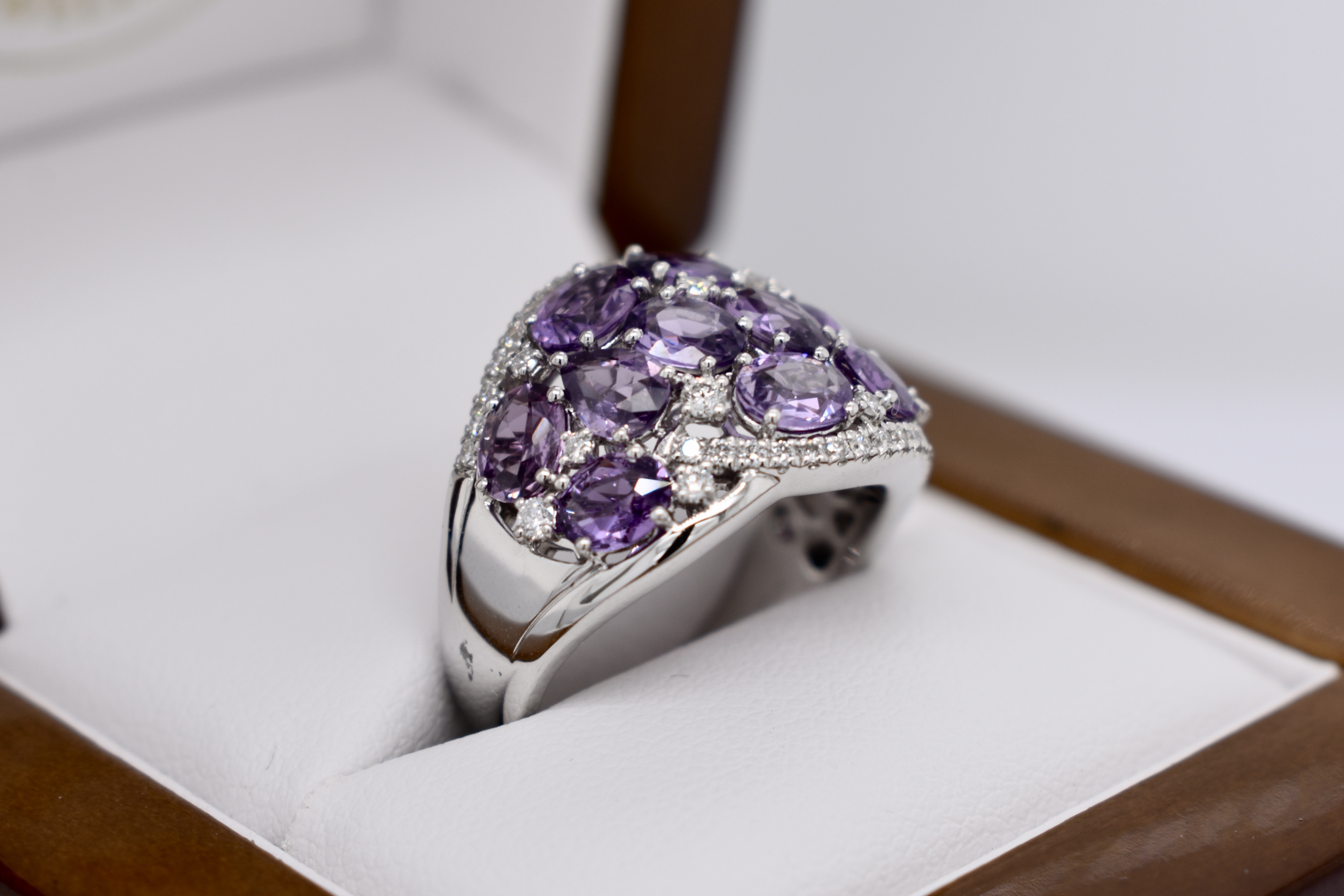 An extravagant multi-stone domed cluster ring, set in 18ct white gold, featuring twelve oval mid purple sapphires set in various directions, totalling 3.95ct, sprinkled with a few diamonds throughout. Half of the top and bottom border is also lined with round brilliant cut diamonds, with a total of 41 diamonds weighing 0.33ct FG VS-SI. Completed with a wide plain band. Finger size M+. Approx. valuation of $13,000. Independent valuation provided upon purchase.