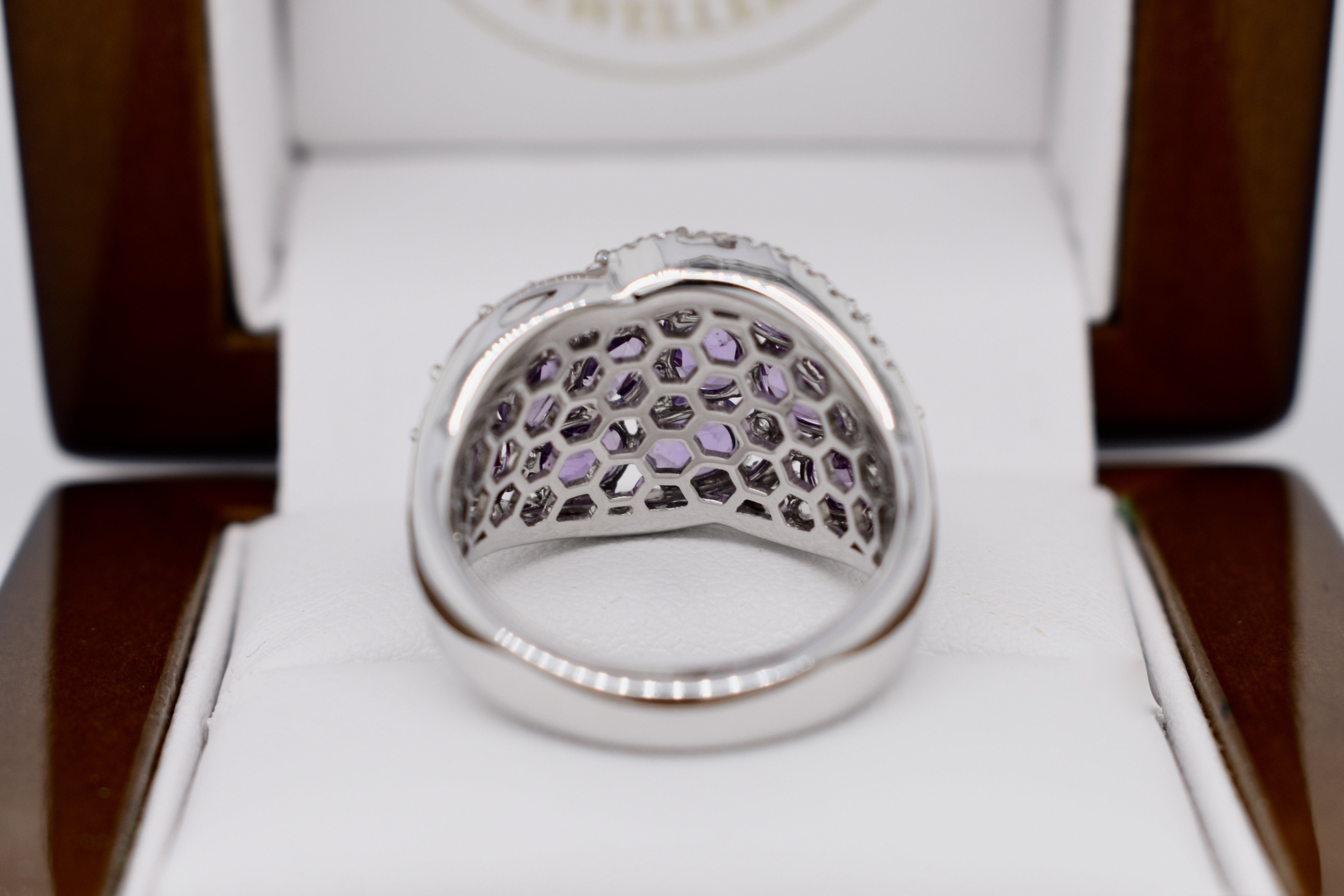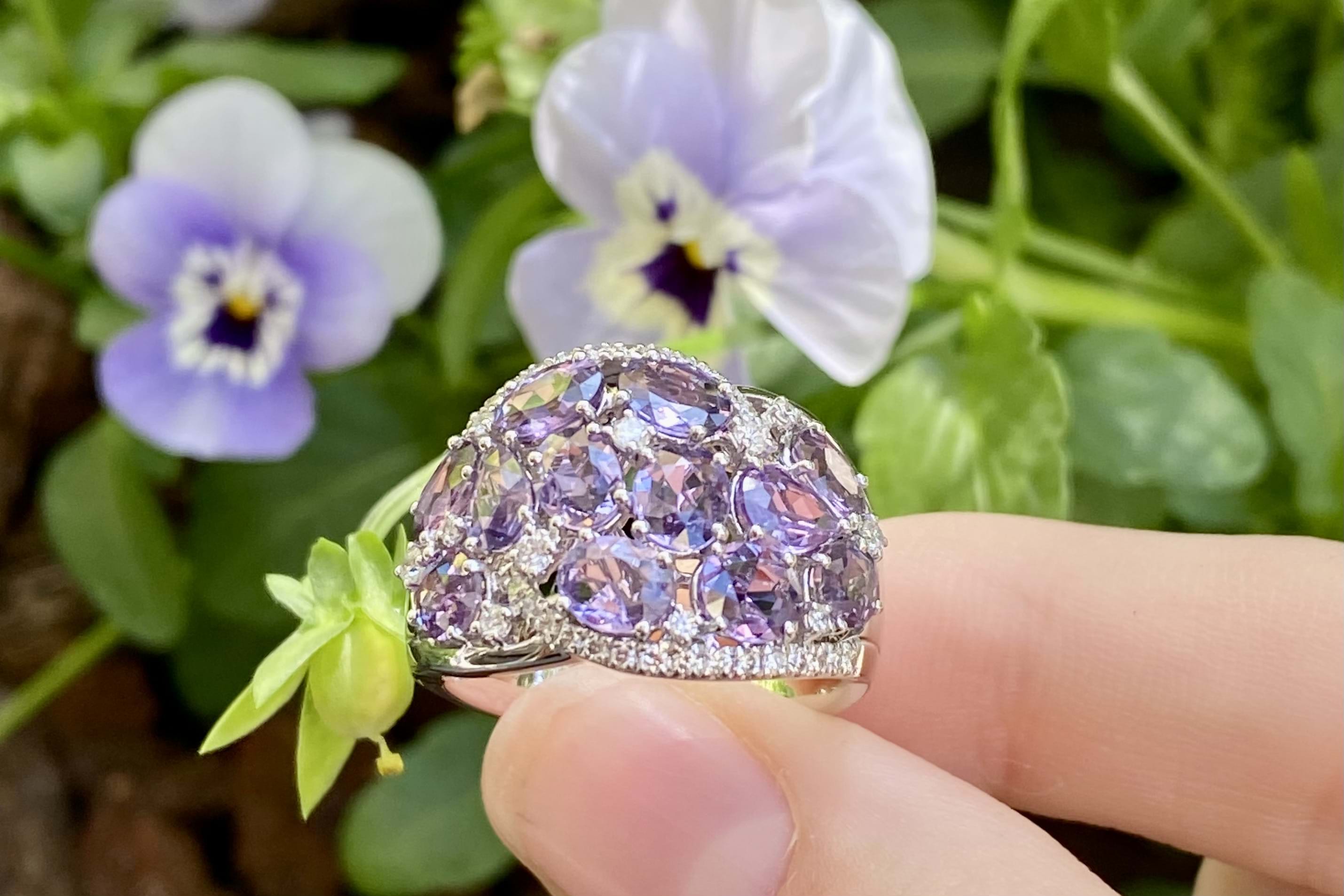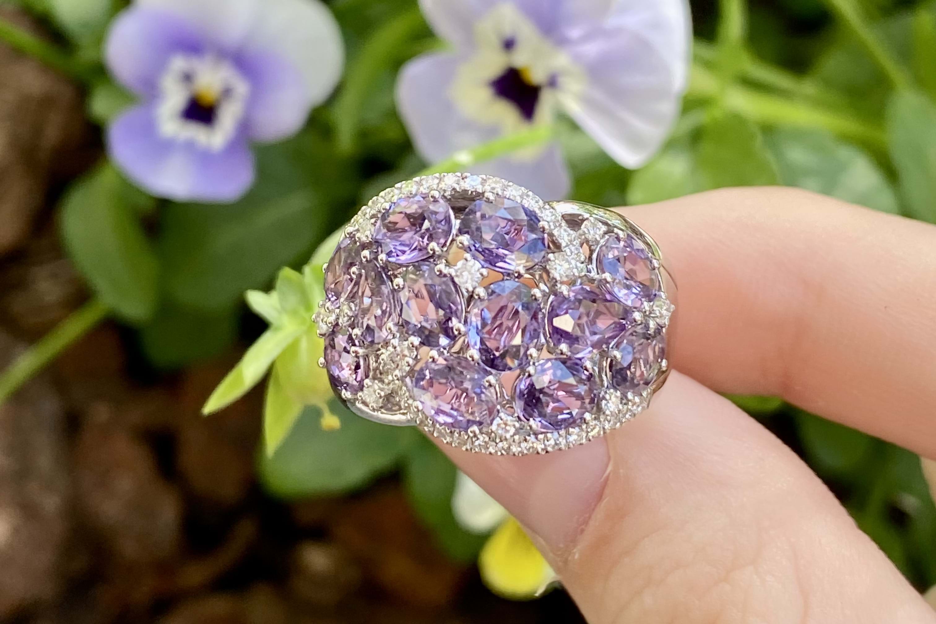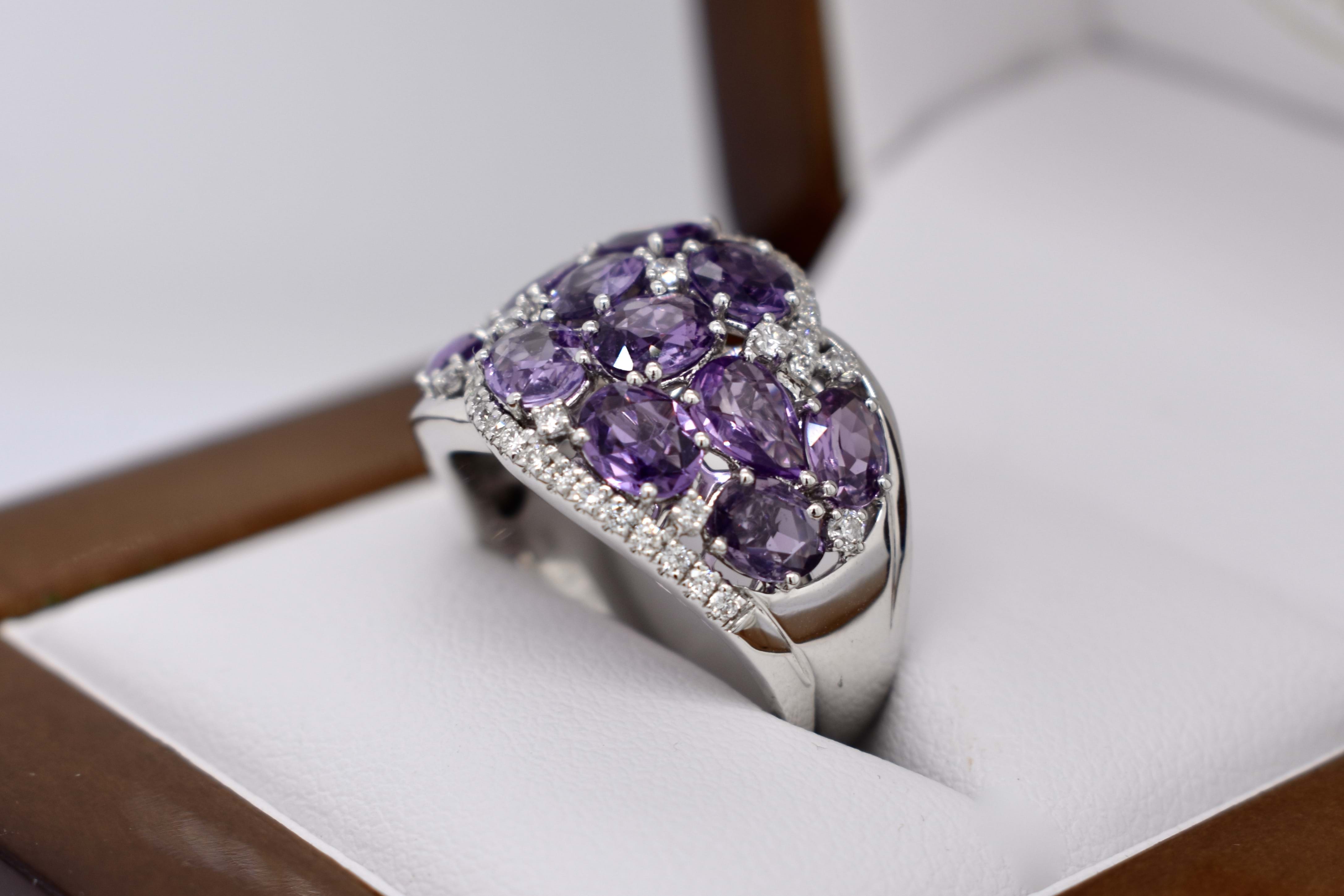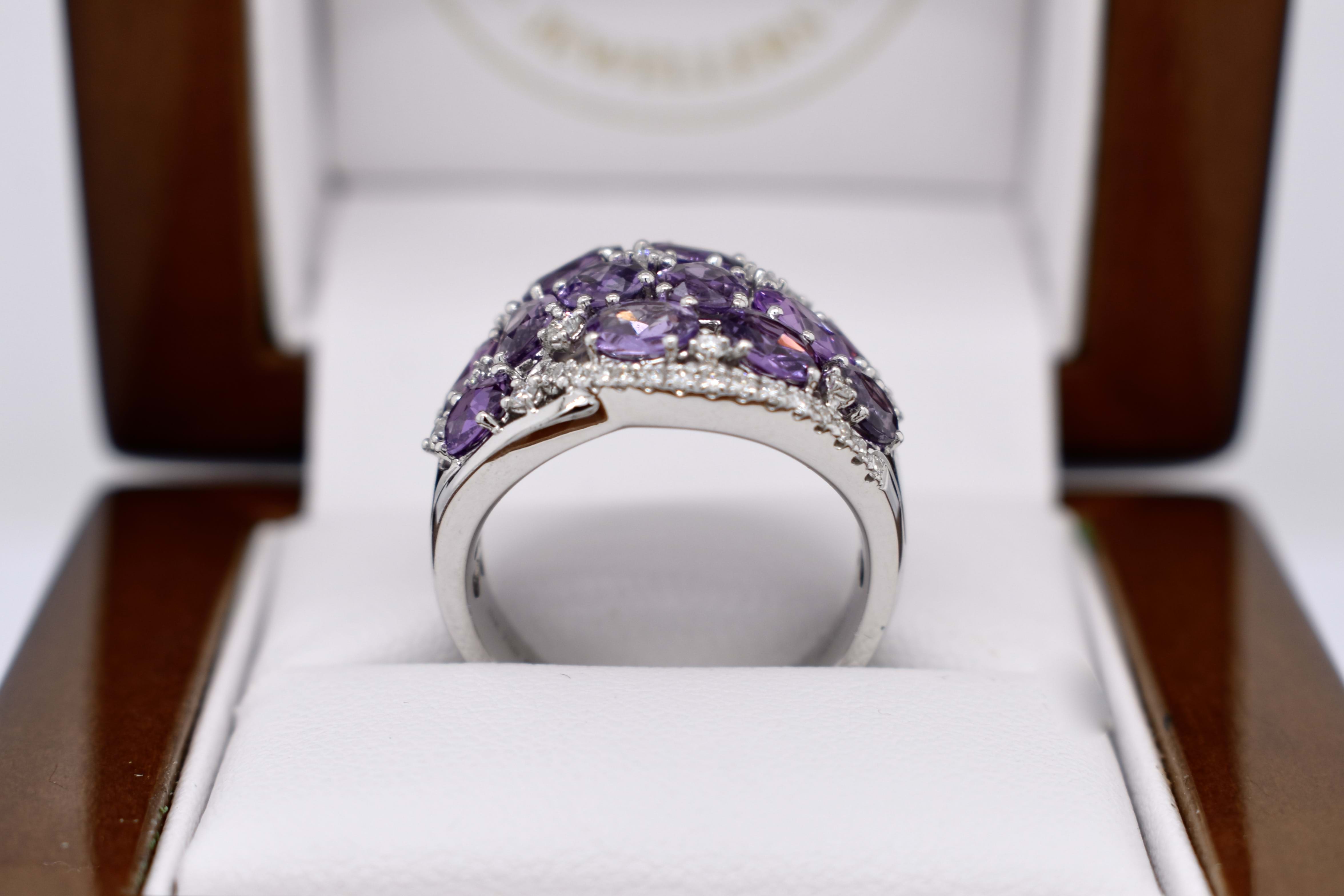 An extravagant multi-stone domed cluster ring, set in 18ct white gold, featuring twelve oval mid purple sapphires set in various directions, totalling 3.95ct, sprinkled with a few diamonds throughout. Half of the top and bottom border is also lined with round brilliant cut diamonds, with a total of 41 diamonds weighing 0.33ct FG VS-SI. Completed with a wide plain band. Finger size M+. Approx. valuation of $13,000. Independent valuation provided upon purchase.