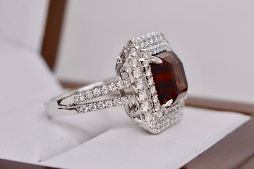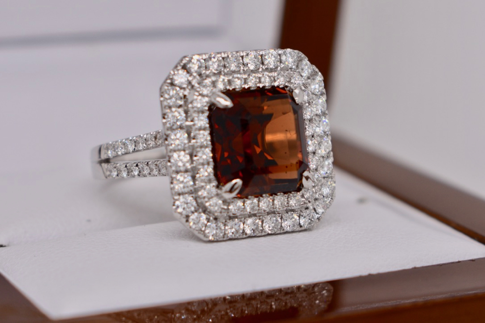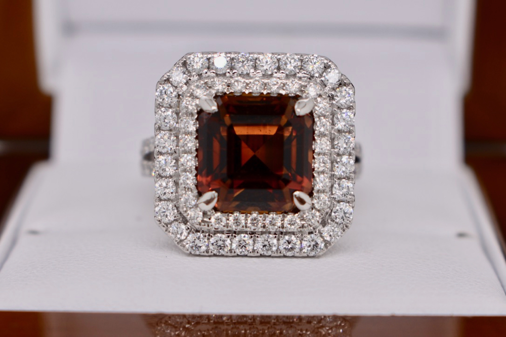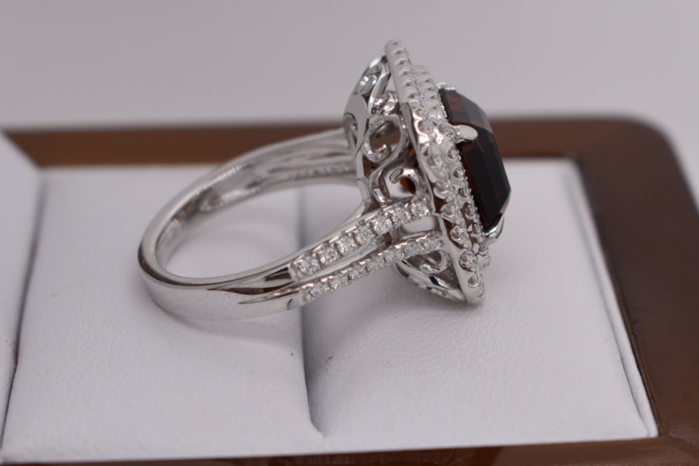 Crafted in 18ct white gold this double halo diamond cocktail ring was specially designed to showcase this unusual emerald cut 6.15ct sherry topaz. Containing an amazing 82 round brilliant cut diamonds totalling 1.15ct (GH/VS-SI) this epic ring is a show stopper! Independent Valuation Supplied