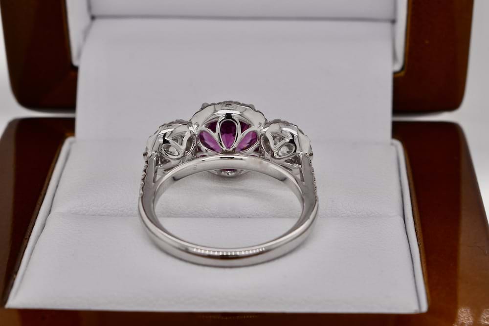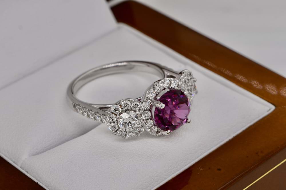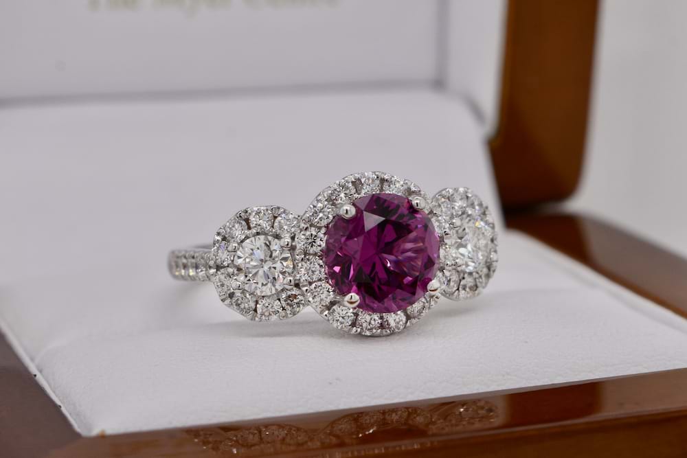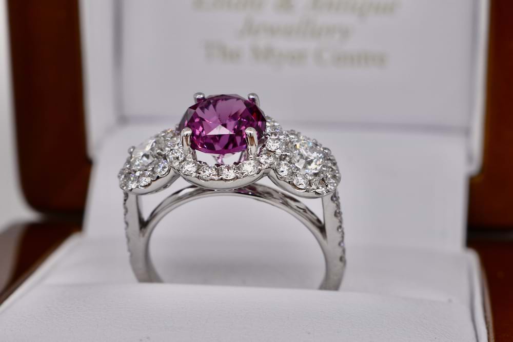 Stunning, chunky & gorgeous 2.57ct bright, mid to dark purlish pink, eye clean Umbalite Garnet set into the center of this 3 stone halo ring. The diamonds either side are 2 = 0.52ct F/VS in quality. Each of the three main stones are surrounded by a halo of bright, white diamonds (as well as the shoulders) The total small diamonds are 41 = 0.85ct F/G -VS-SI quality. The total diamond content is 1.37ct. What is Umbalite Garnet? It is a very high quality version of the Rhodolite Garnet. It generally comes from one location, the Umba valley in Tanzania, where it gets its name. Just like Rhodolite, it comes in a beautiful purple color with flashes of red or blue. Umbalite garnet is a relatively new gemstone to the market. Finger size M.5. Independent valuation supplied