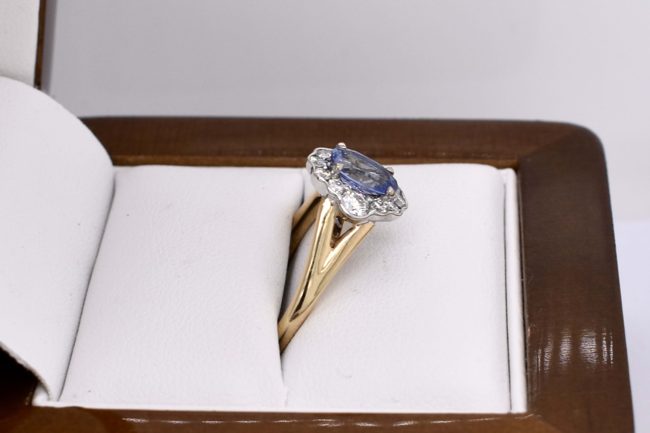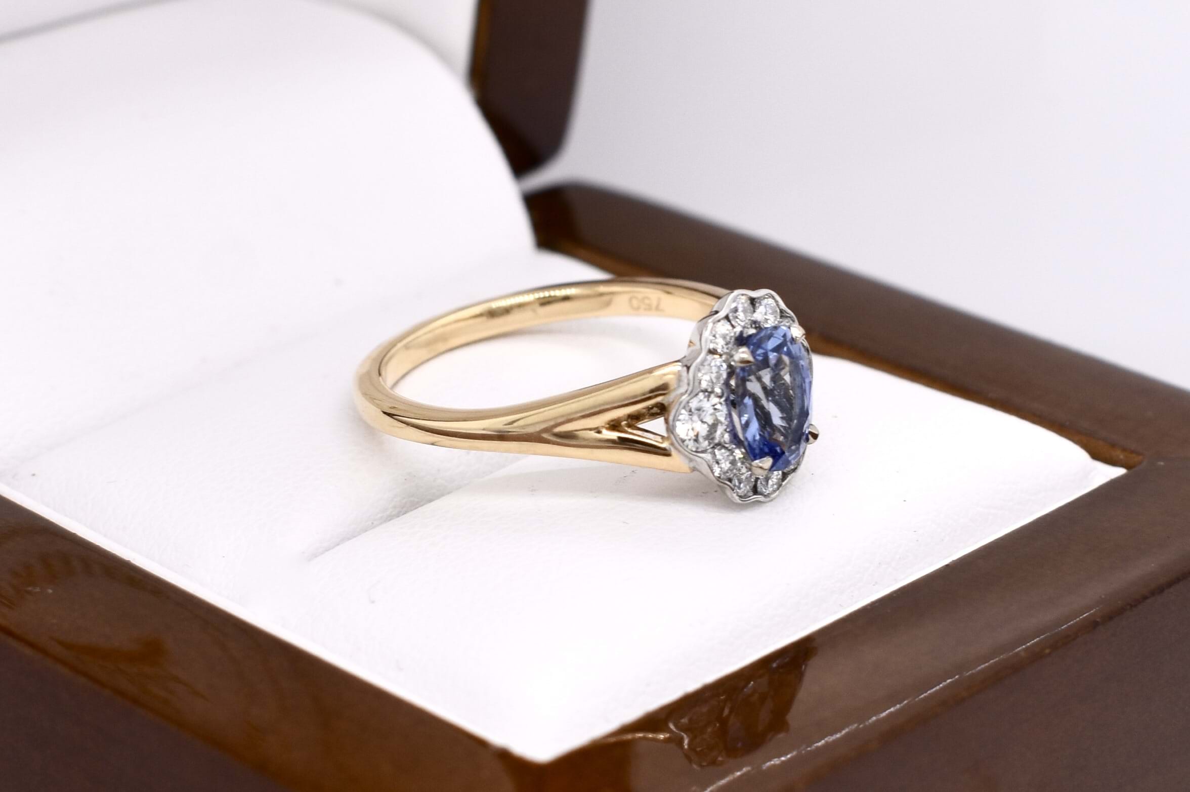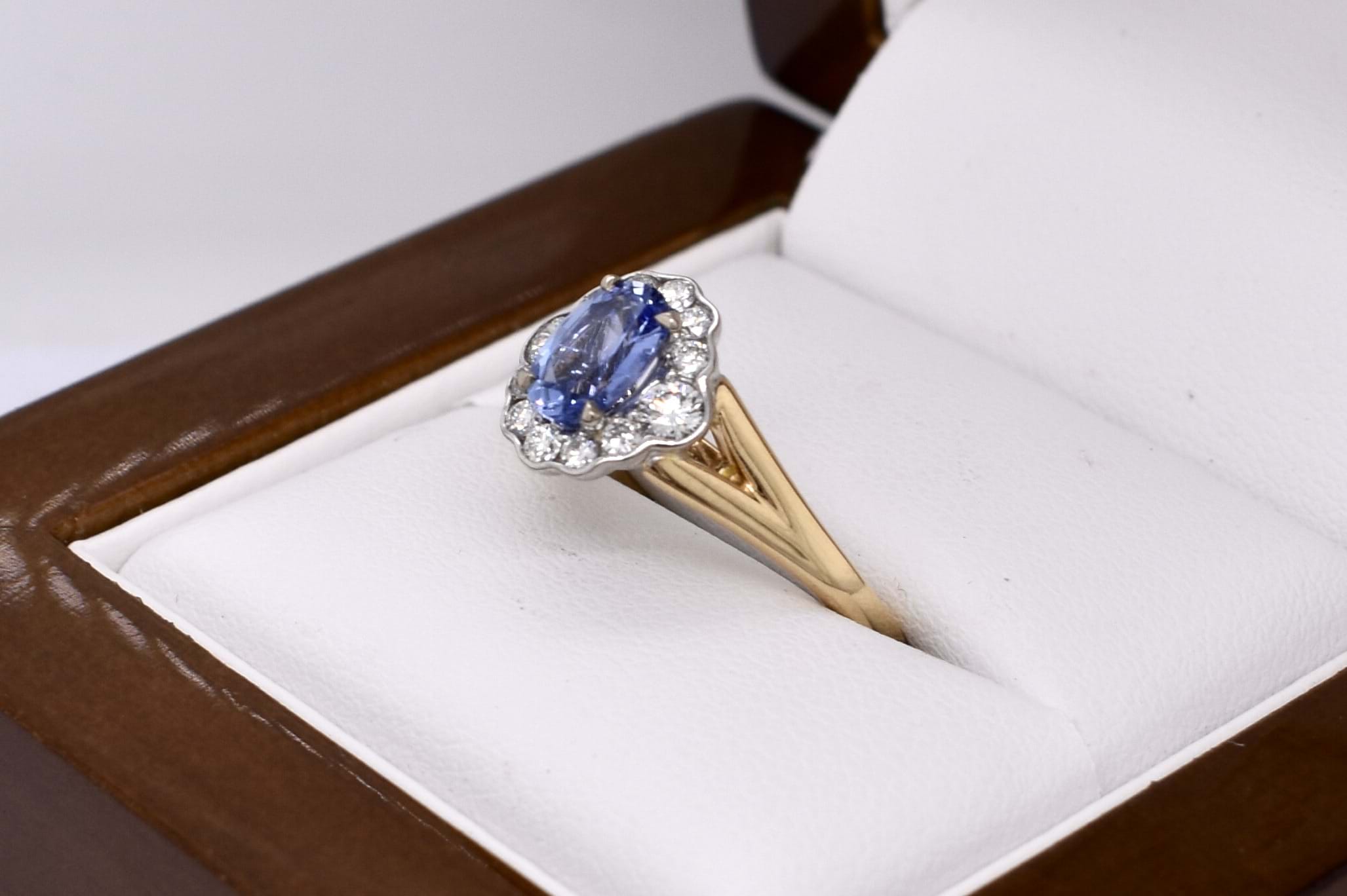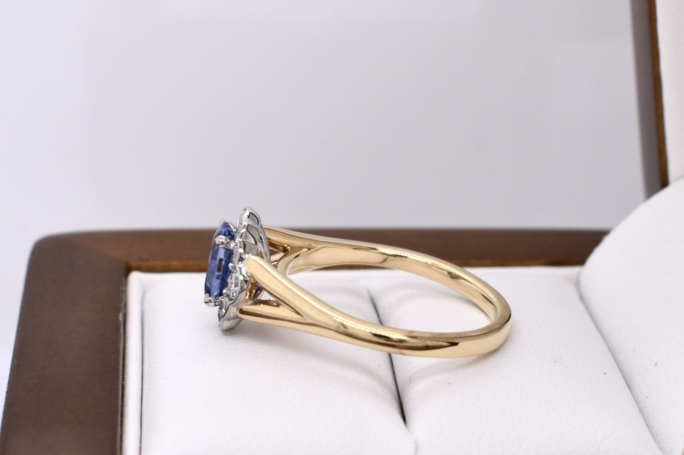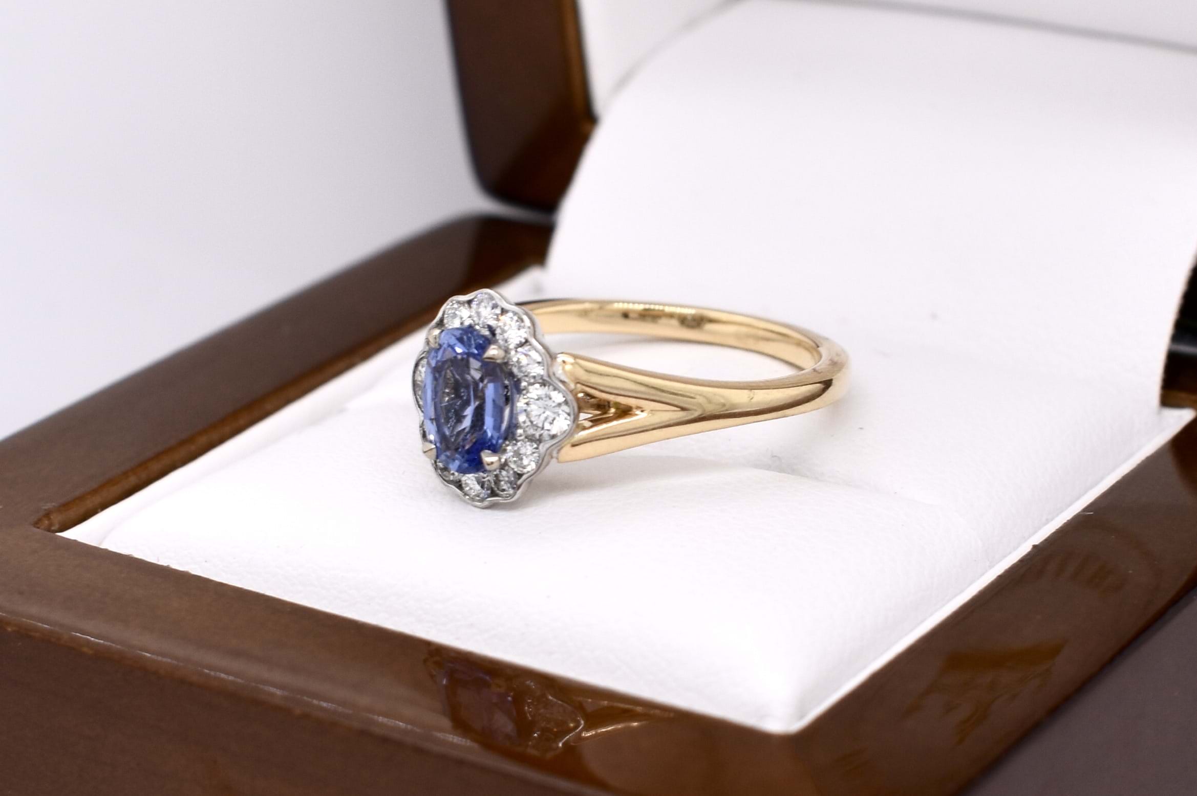This gorgeous ring features a bright/light blue oval Ceylon sapphire weighing 0.85ct and is four claw set in 18ct yellow gold. Set with a dazzling graduated halo of round brilliant cut white diamonds which are shared claw and channel set. Total of 12 diamonds, totalling 0.36ct G SI. Finished on a pretty band with split shoulder detailing. Finger size M+. Independent Valuation available upon purchase.