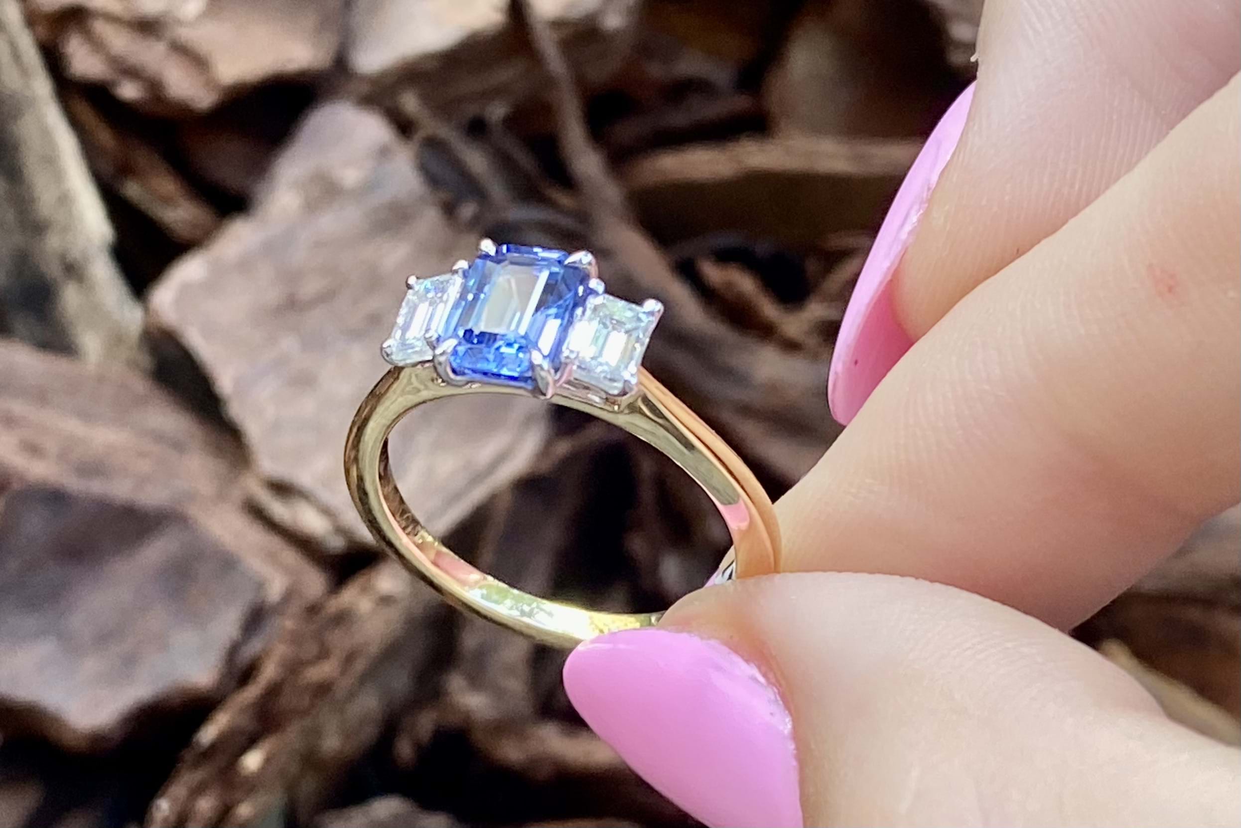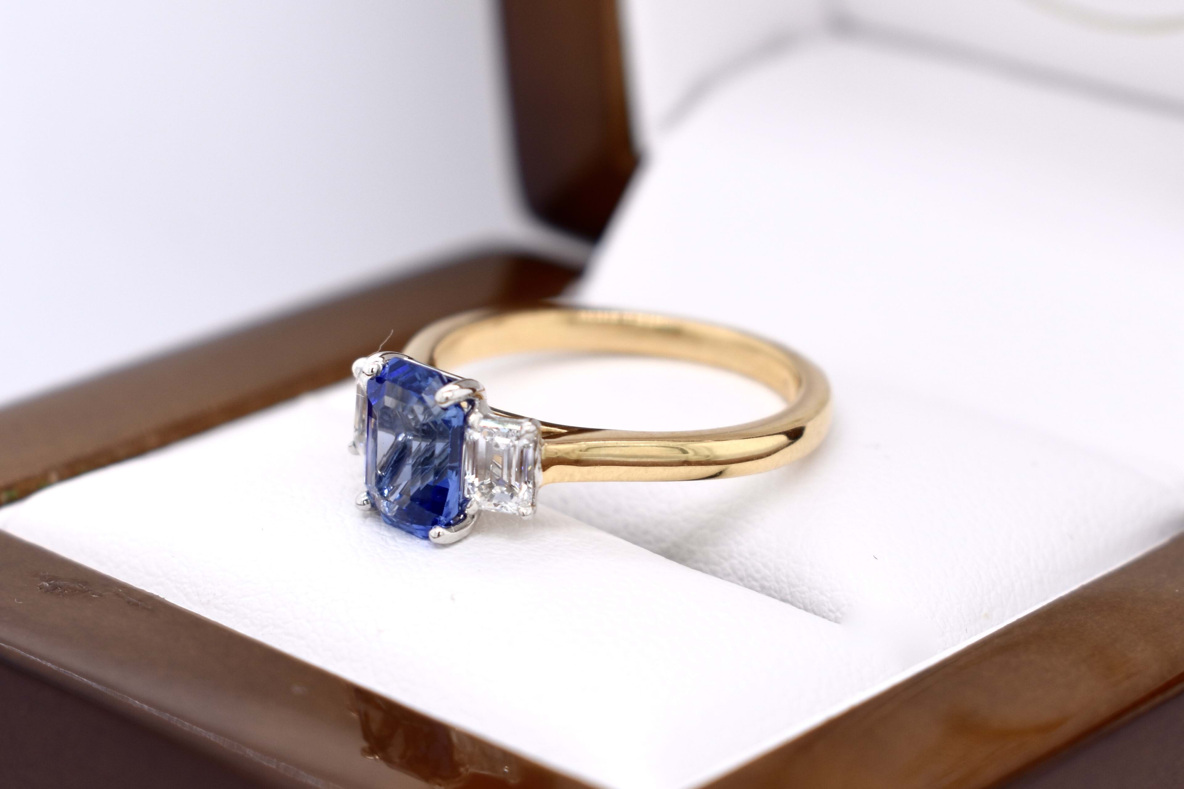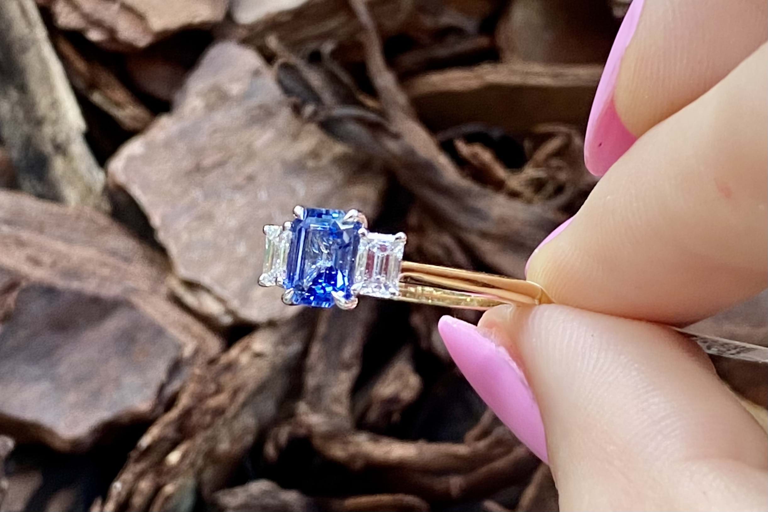 This gorgeous ring features a central blue emerald cut Ceylon sapphire of 1.00ct, four claw set, paired with an emerald cut white diamond each side, totalling of 0.50ct G SI. The trilogy ring is made in 18ct yellow gold with a plain band. Finger size M+. Independent Valuation available upon purchase.