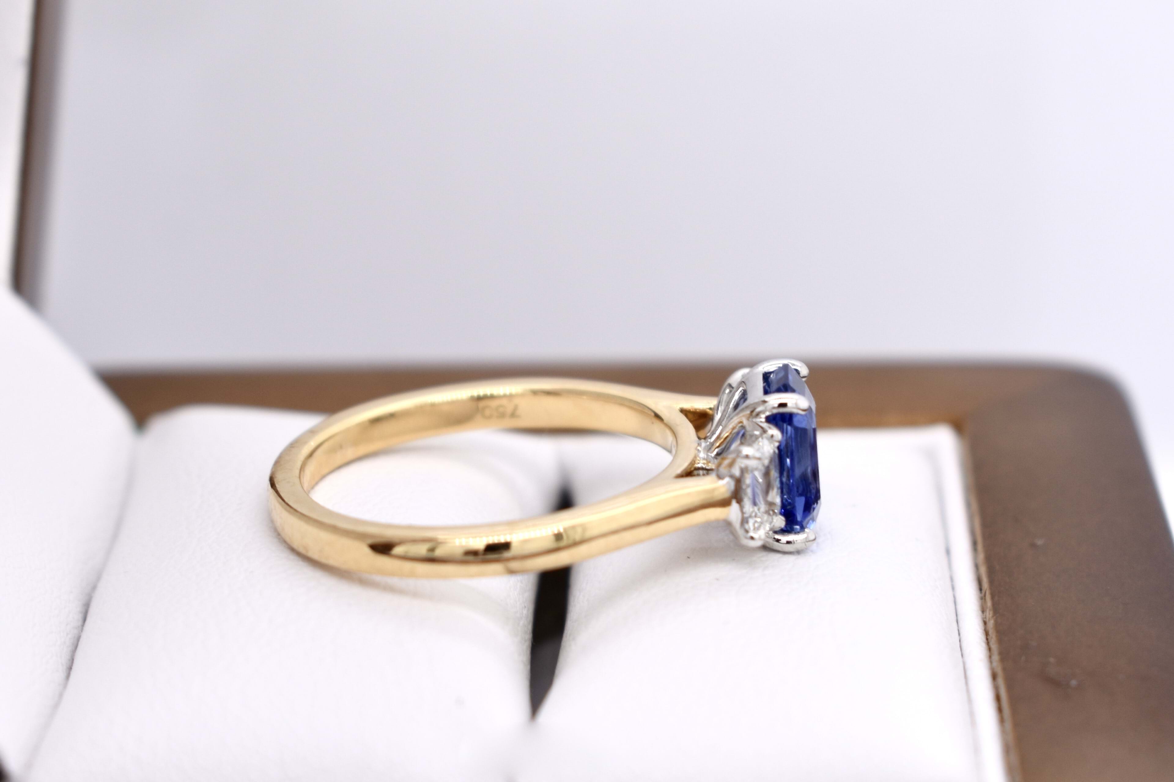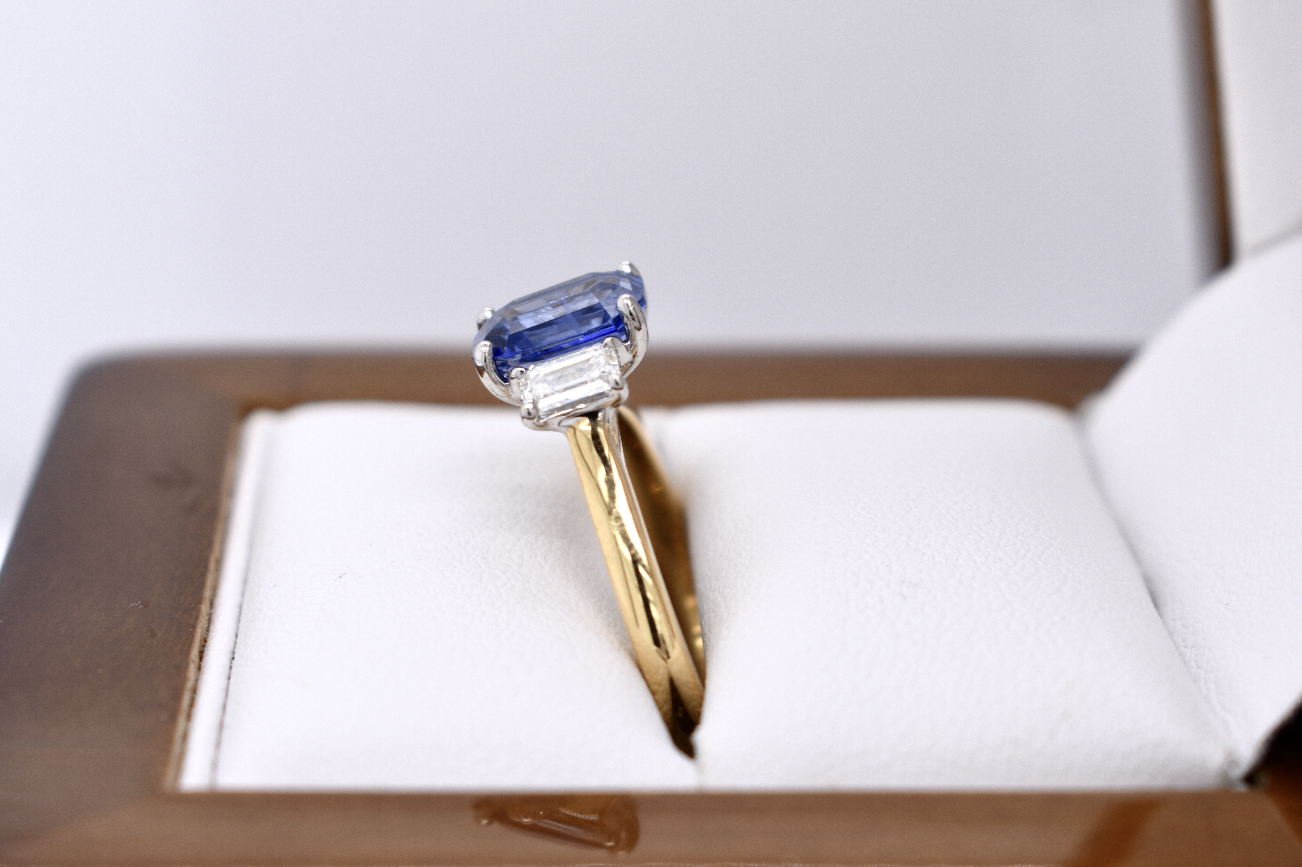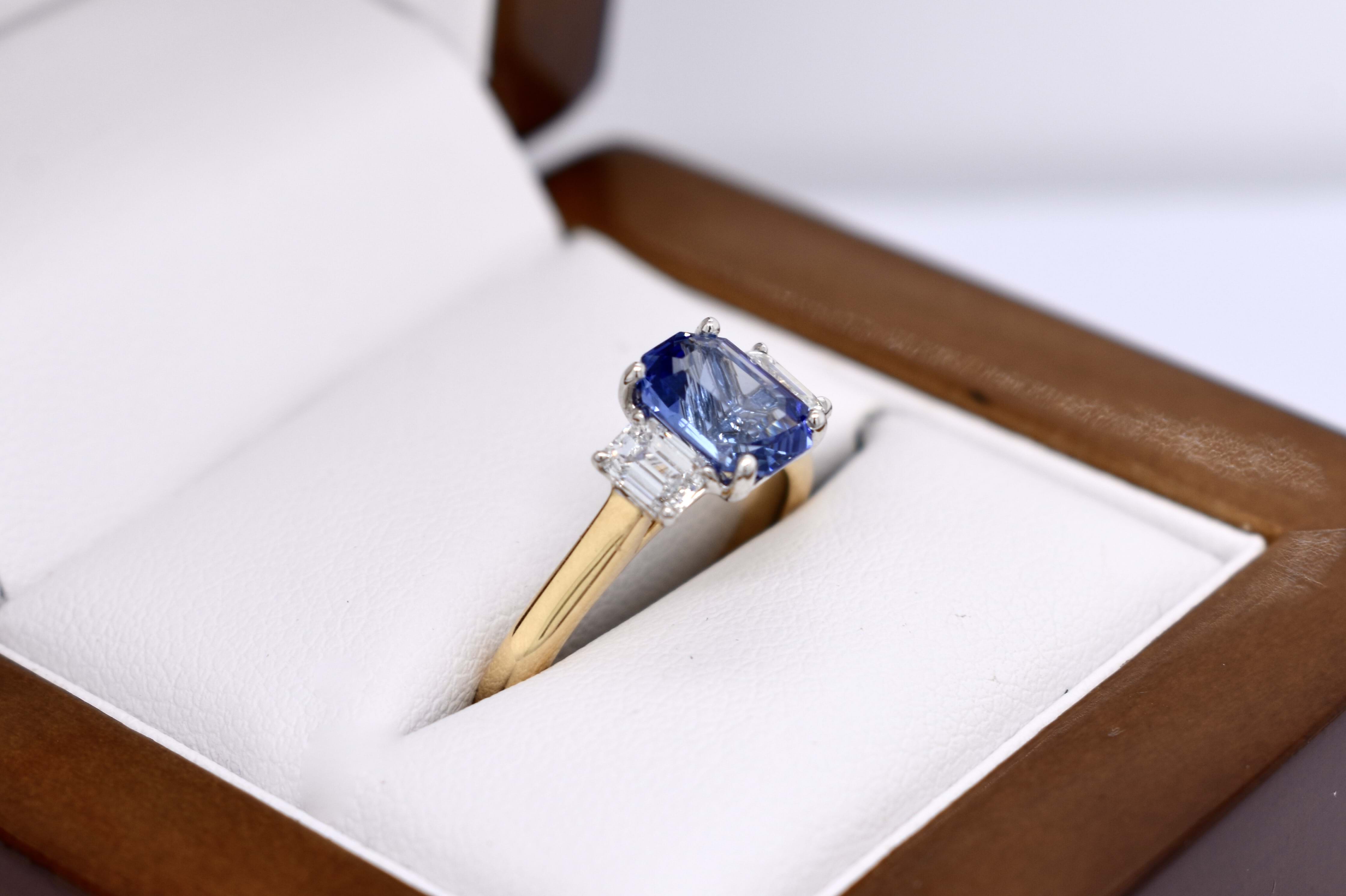 This gorgeous ring features a central blue emerald cut Ceylon sapphire of 1.00ct, four claw set, paired with an emerald cut white diamond each side, totalling of 0.50ct G SI. The trilogy ring is made in 18ct yellow gold with a plain band. Finger size M+. Independent Valuation available upon purchase.