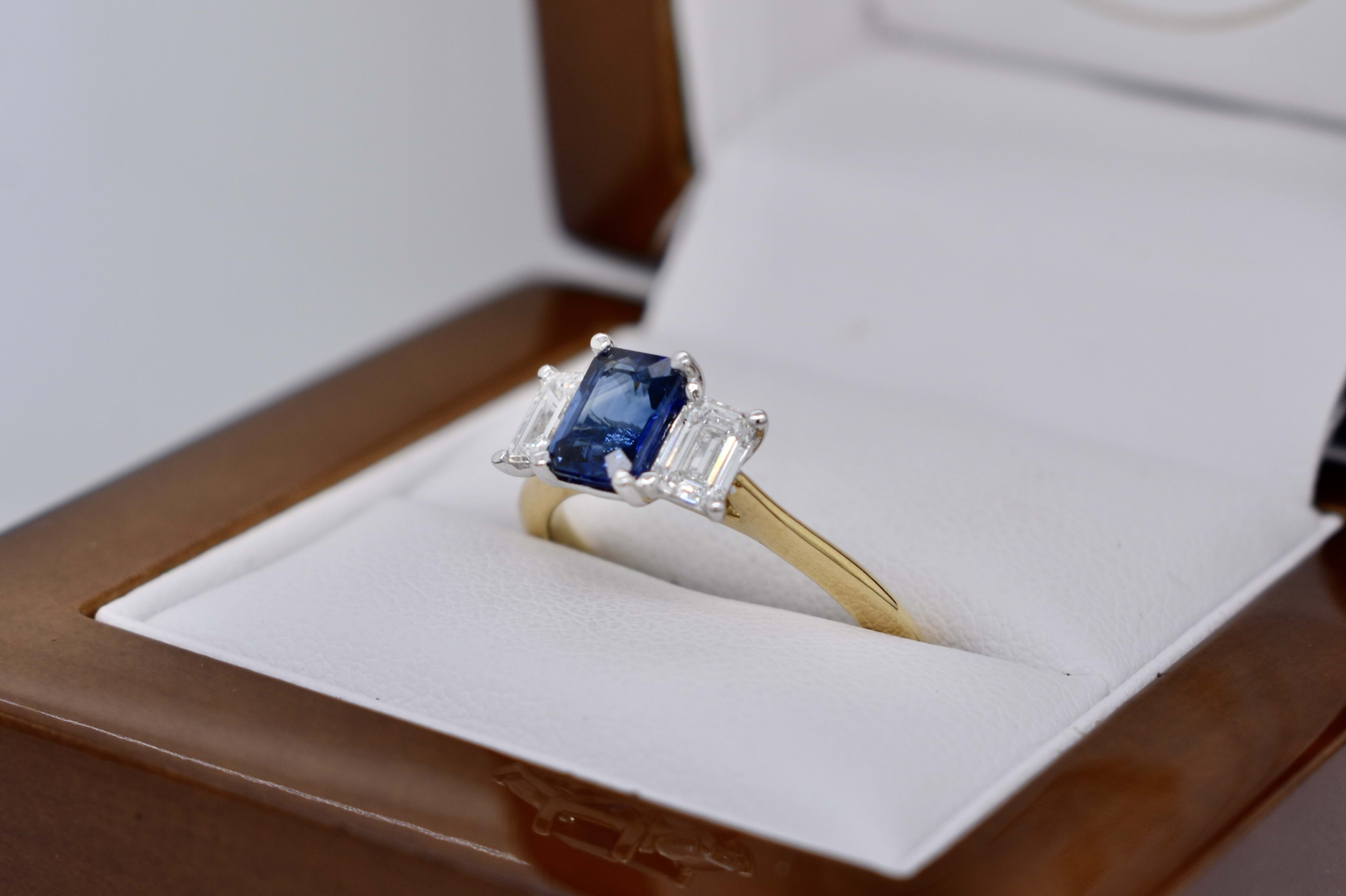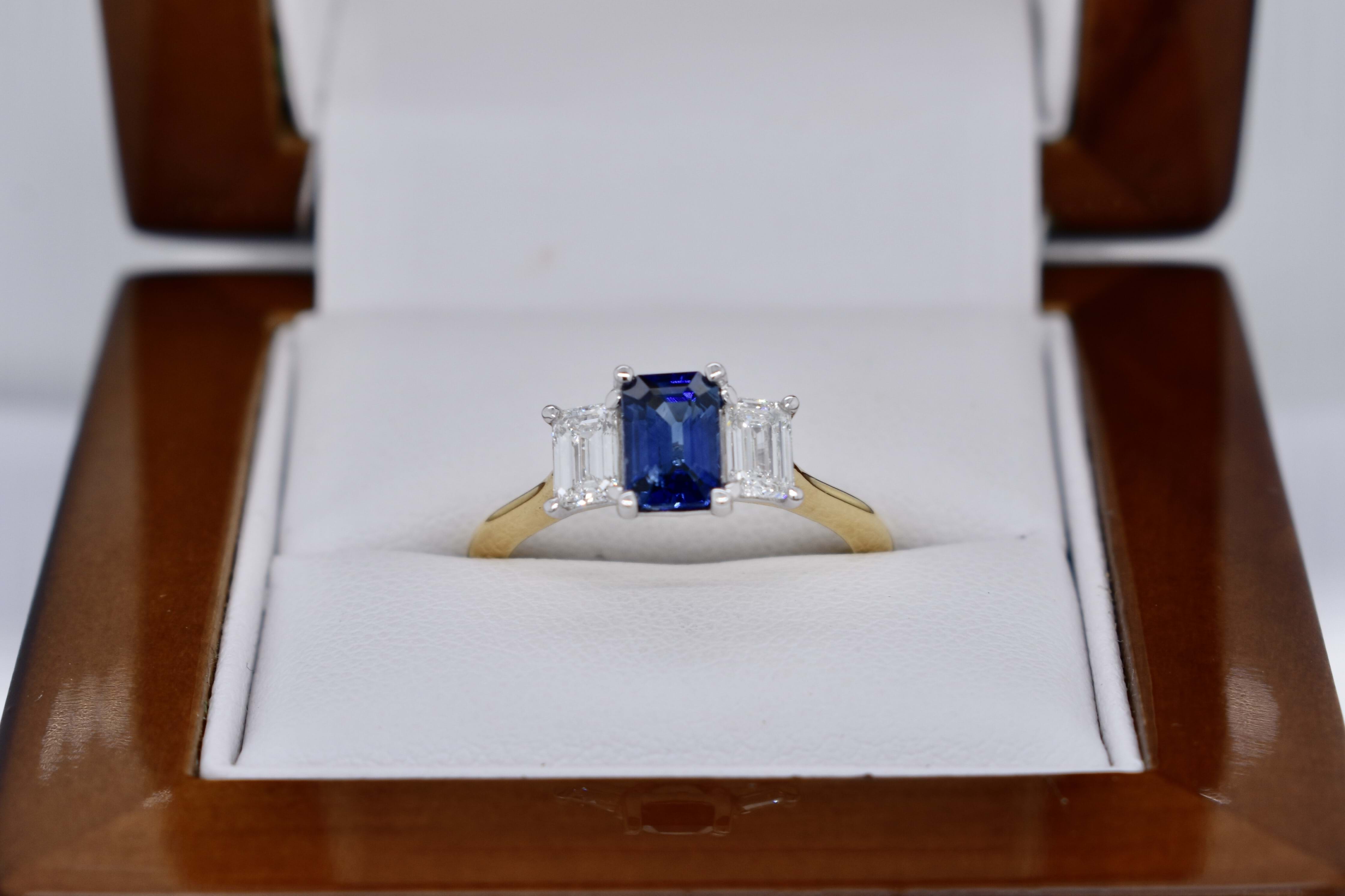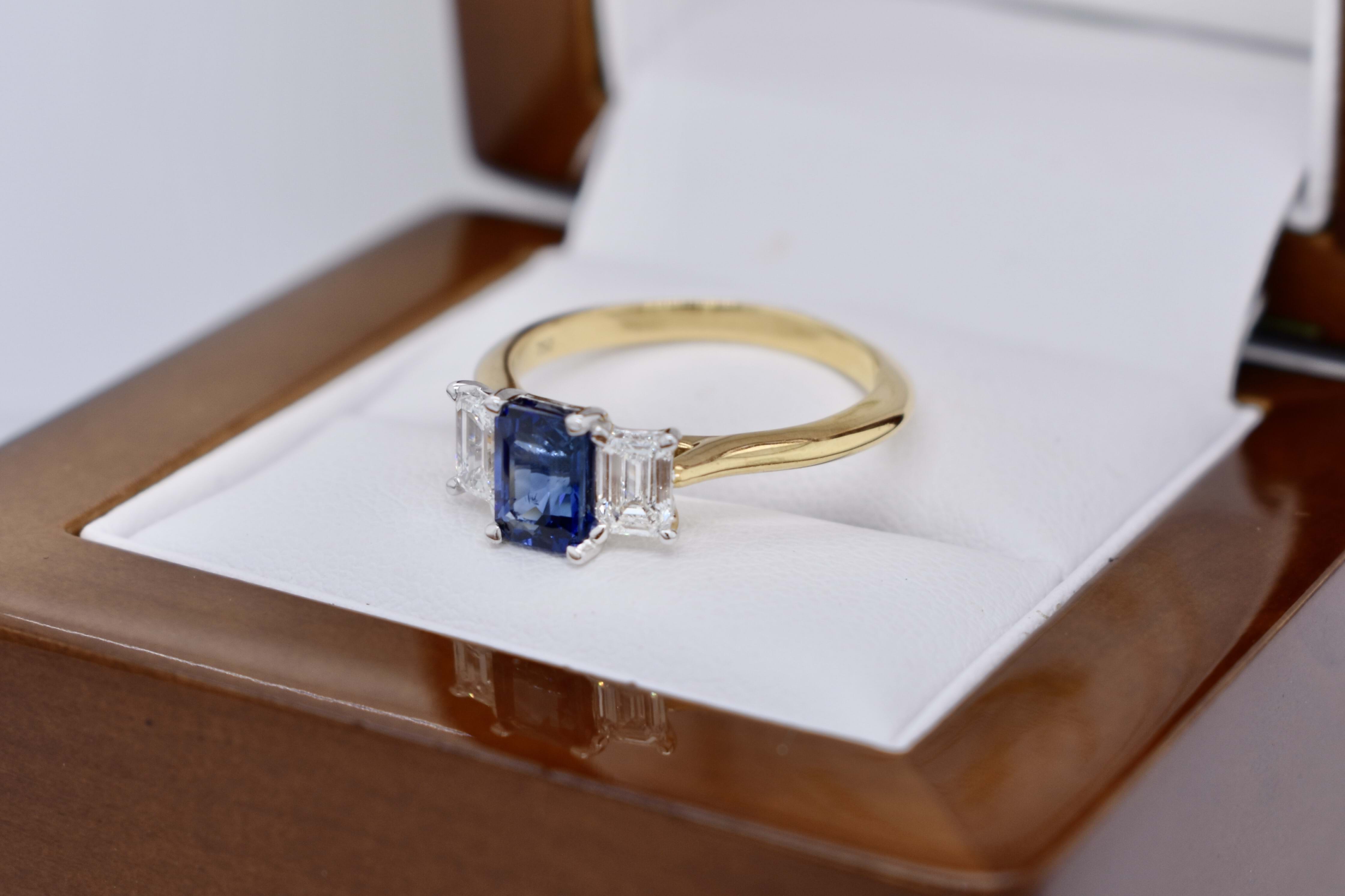 Beautiful 18ct yellow gold ring, featuring a stunning bright dark blue Ceylon Sapphire of 1.01ct, four claw set with an emerald cut diamond on each side. Sapphire is emerald cut and measures 6.57x4.50x3.03mm. The ring features 2 emerald cut diamonds, measuring 3.2x2.0mm and weighing a total of 0.61ct F VS2, both with GIA laser inscriptions. With a v scalloped under rail and knife edge 2.14mm band, this ring would make a beautiful dress or anniversary ring. Finger size M+. Independent Valuation Supplied.
