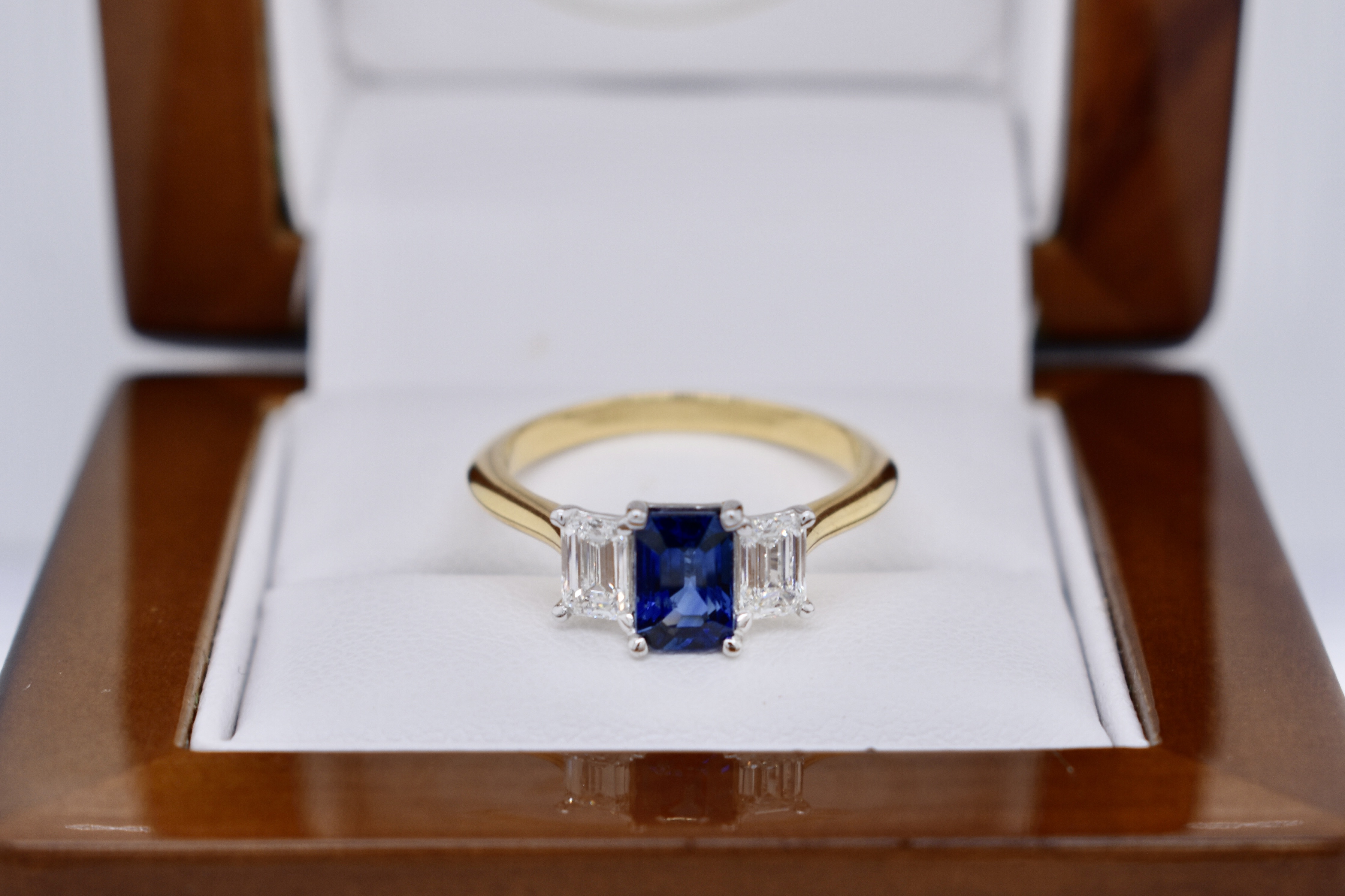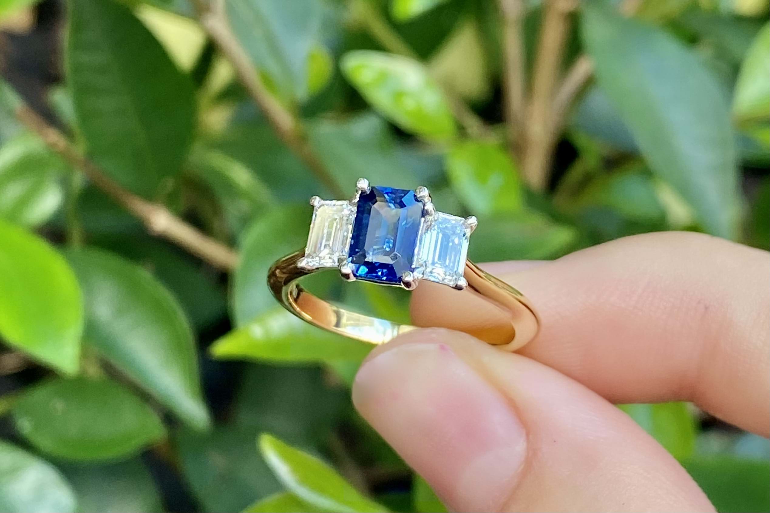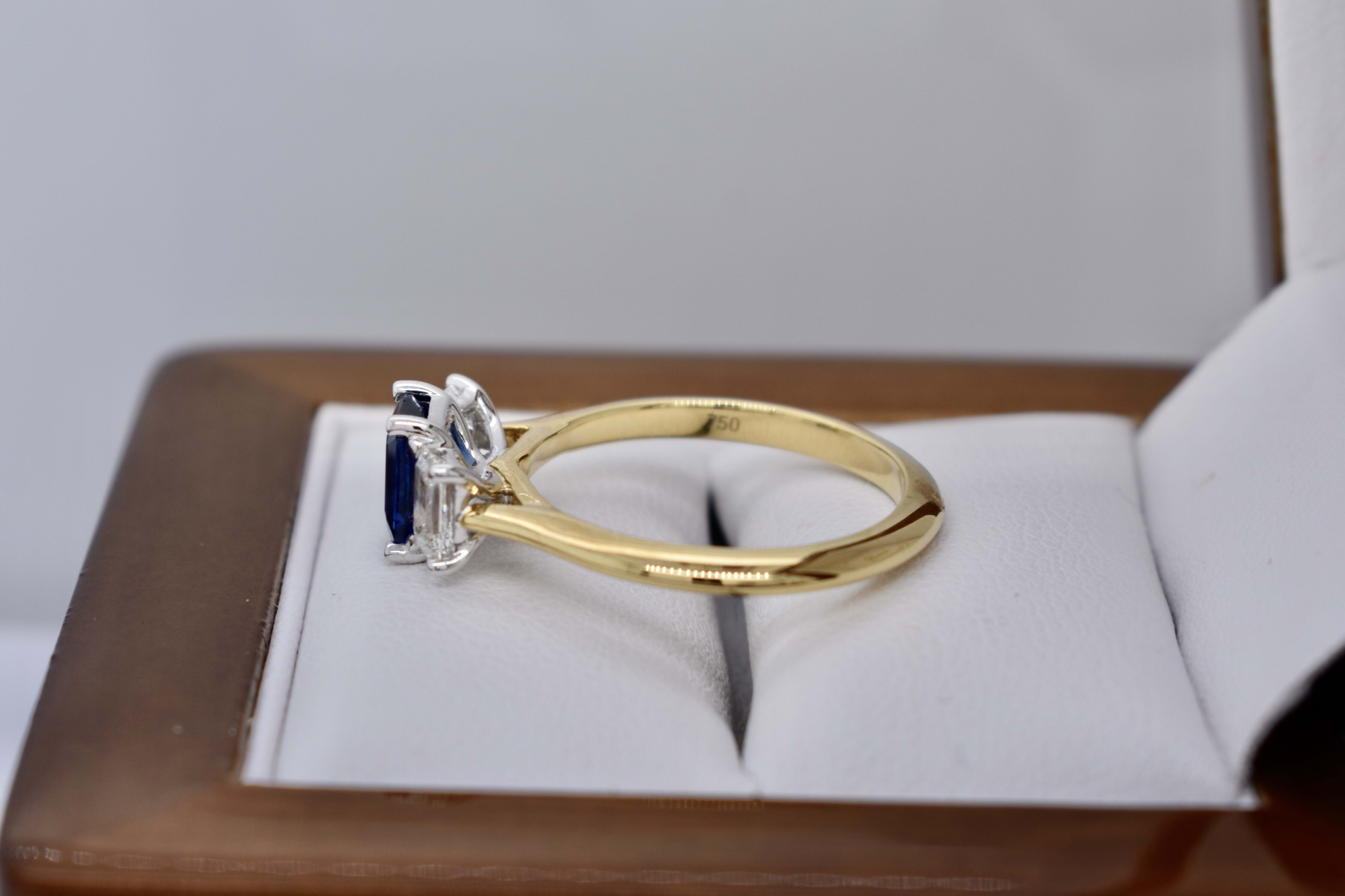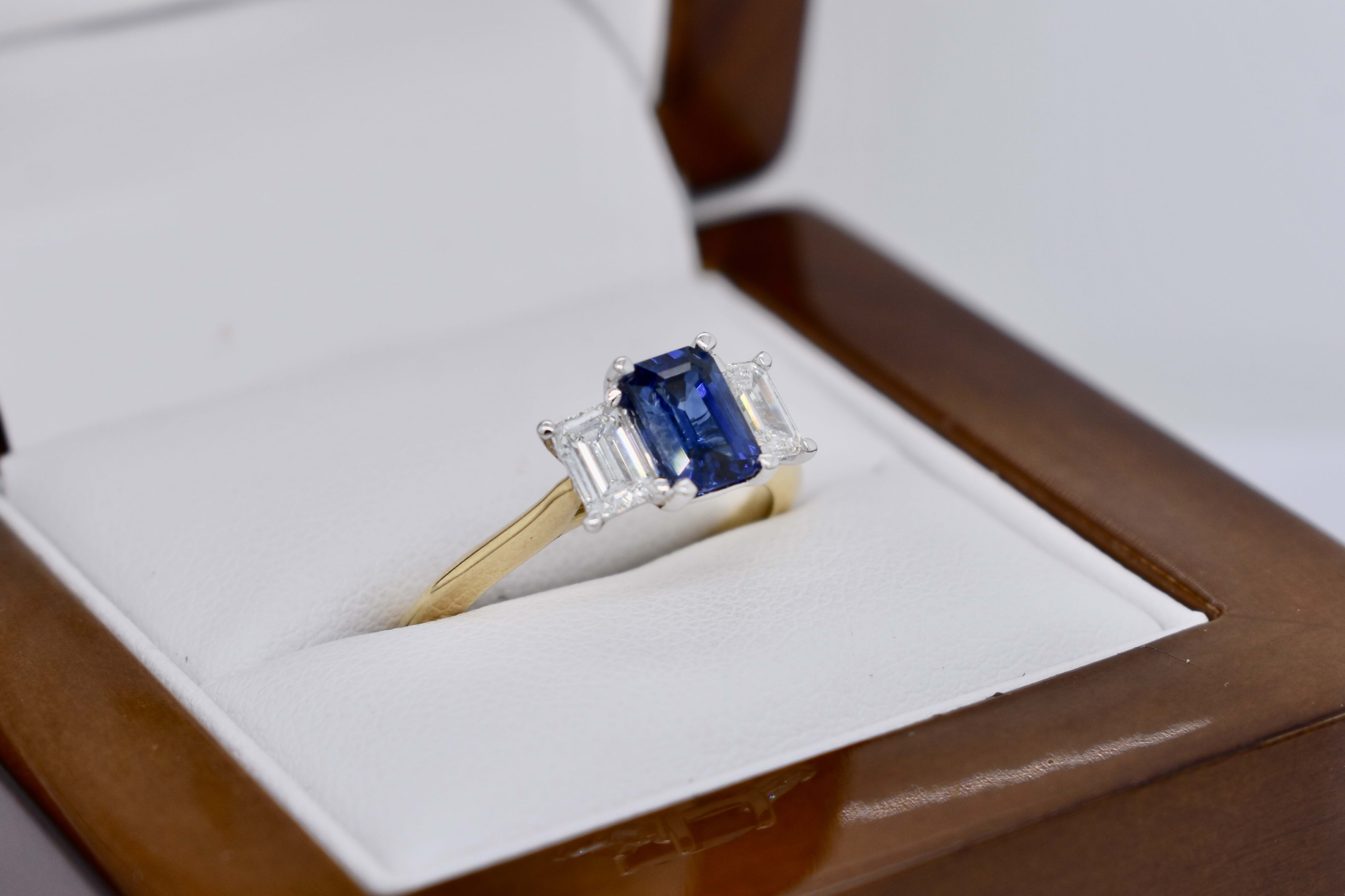 Beautiful 18ct yellow gold ring, featuring a stunning bright dark blue Ceylon Sapphire of 1.01ct, four claw set with an emerald cut diamond on each side. Sapphire is emerald cut and measures 6.57x4.50x3.03mm. The ring features 2 emerald cut diamonds, measuring 3.2x2.0mm and weighing a total of 0.61ct F VS2, both with GIA laser inscriptions. With a v scalloped under rail and knife edge 2.14mm band, this ring would make a beautiful dress or anniversary ring. Finger size M+. Independent Valuation Supplied.