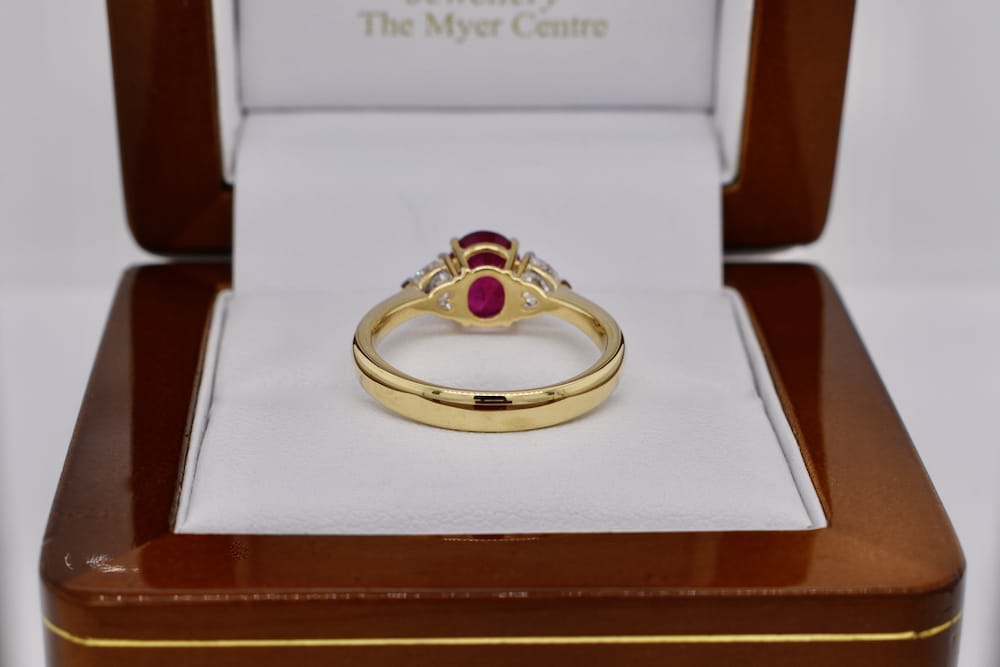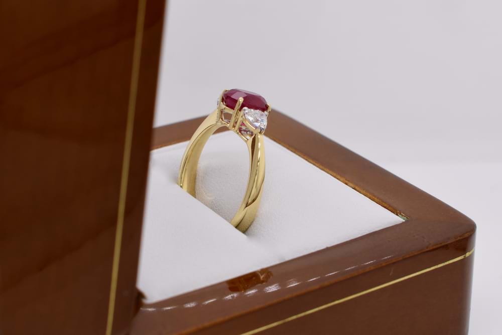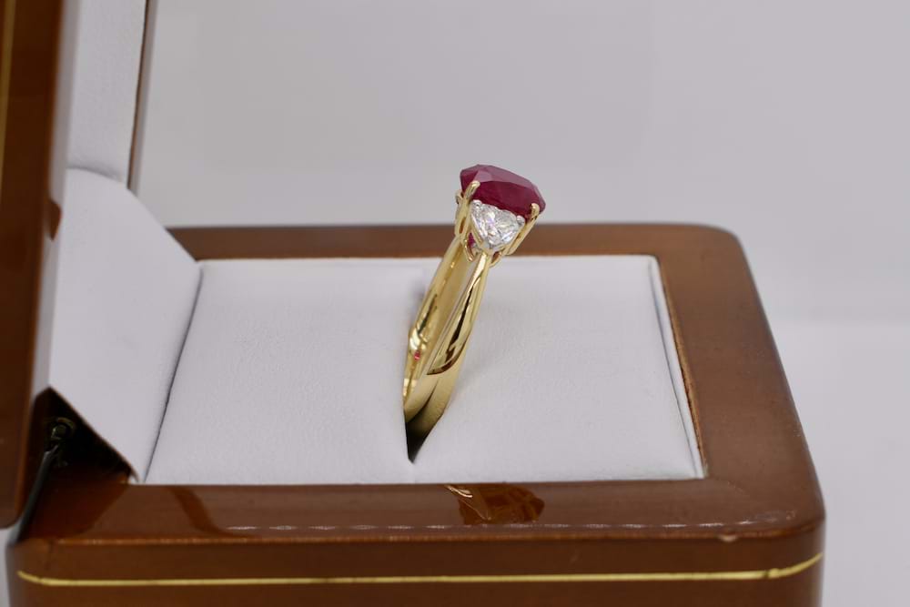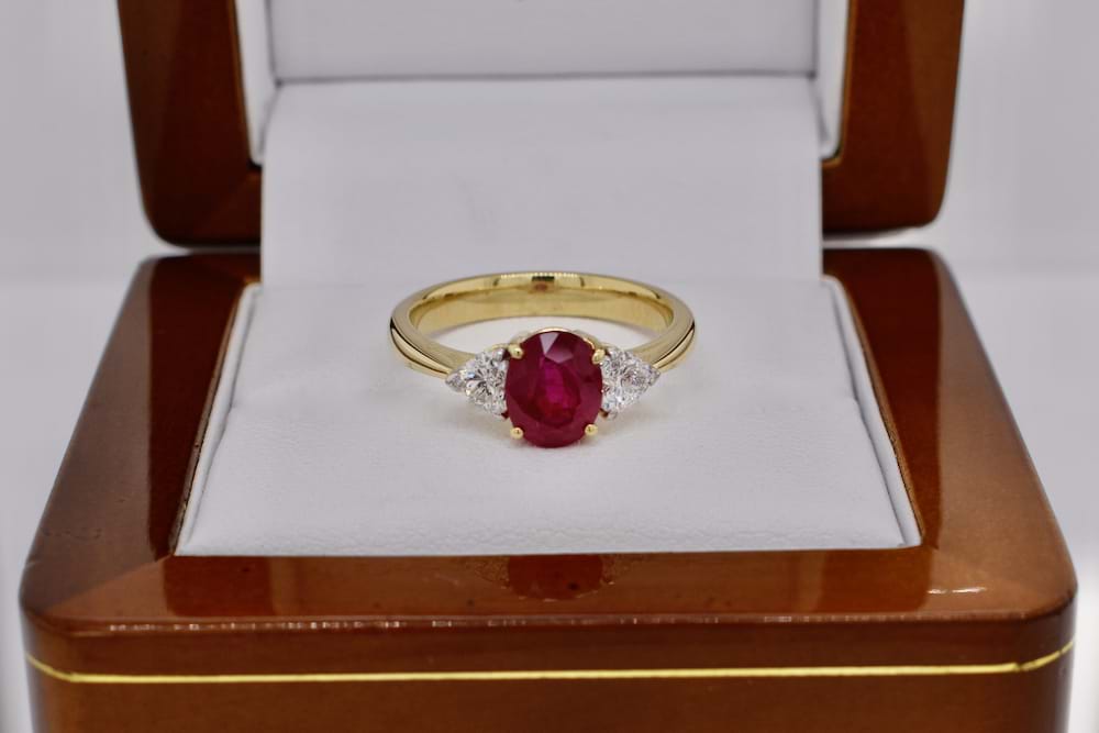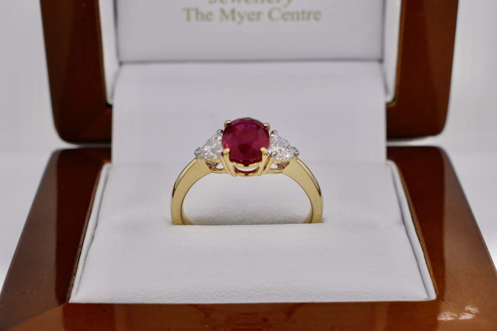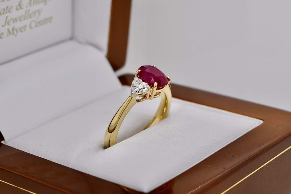 This elegant 18ct yellow gold ring has a beautiful 1.90ct ruby at the centre with a gorgeous dark pinkish red colour, accompanied by two lovely, sparkling heart diamonds equalling 0.50ct E/F VS. Finger size O. Independent valuation supplied