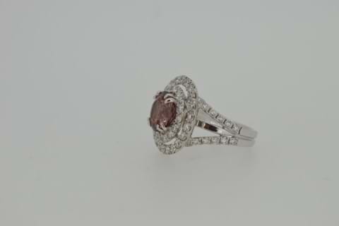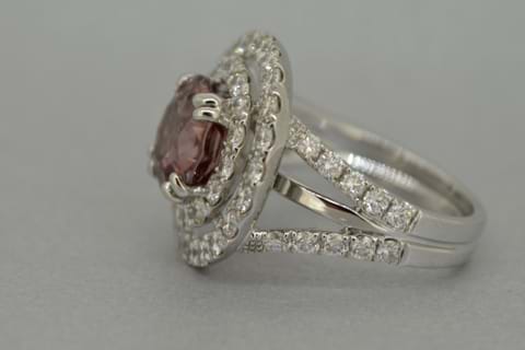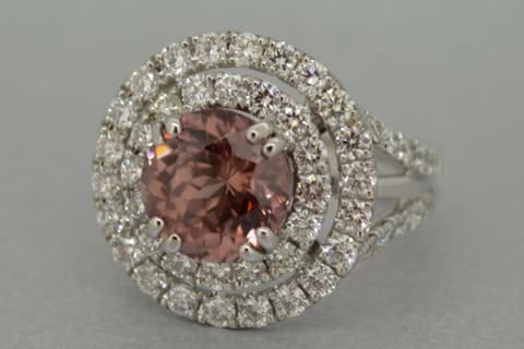 This sparkling double halo ring is set in 18ct white gold and features two rows of high quality shimmering diamonds totalling 2.08cts and surrounding a 5.04ct nautral pink Zircon. Independent Valuation Supplied