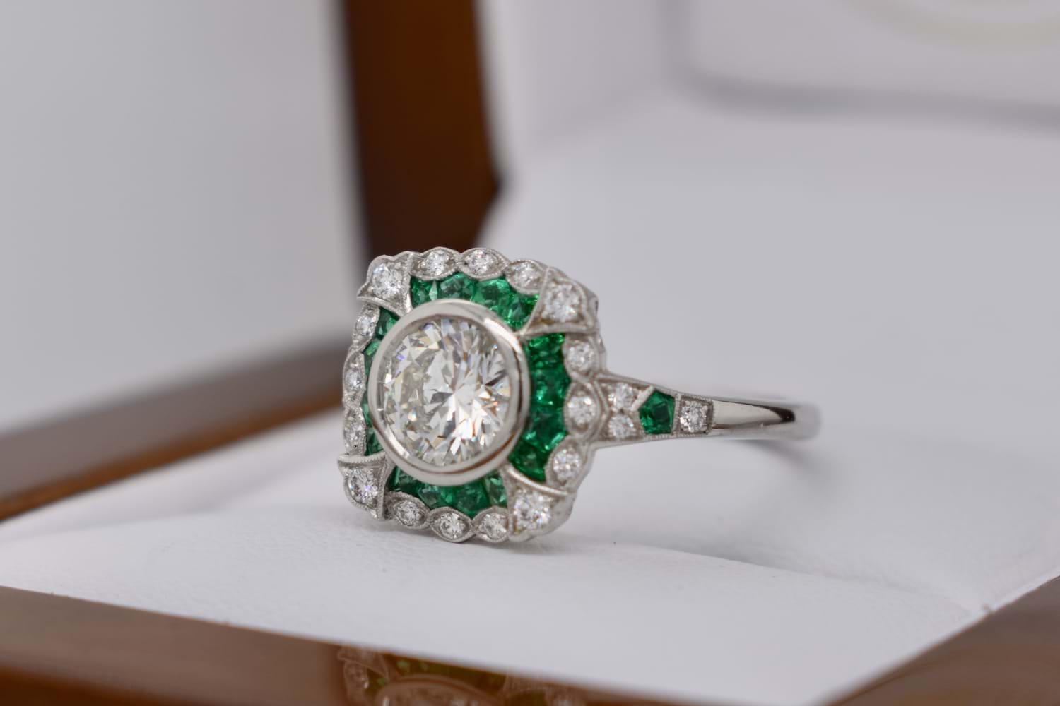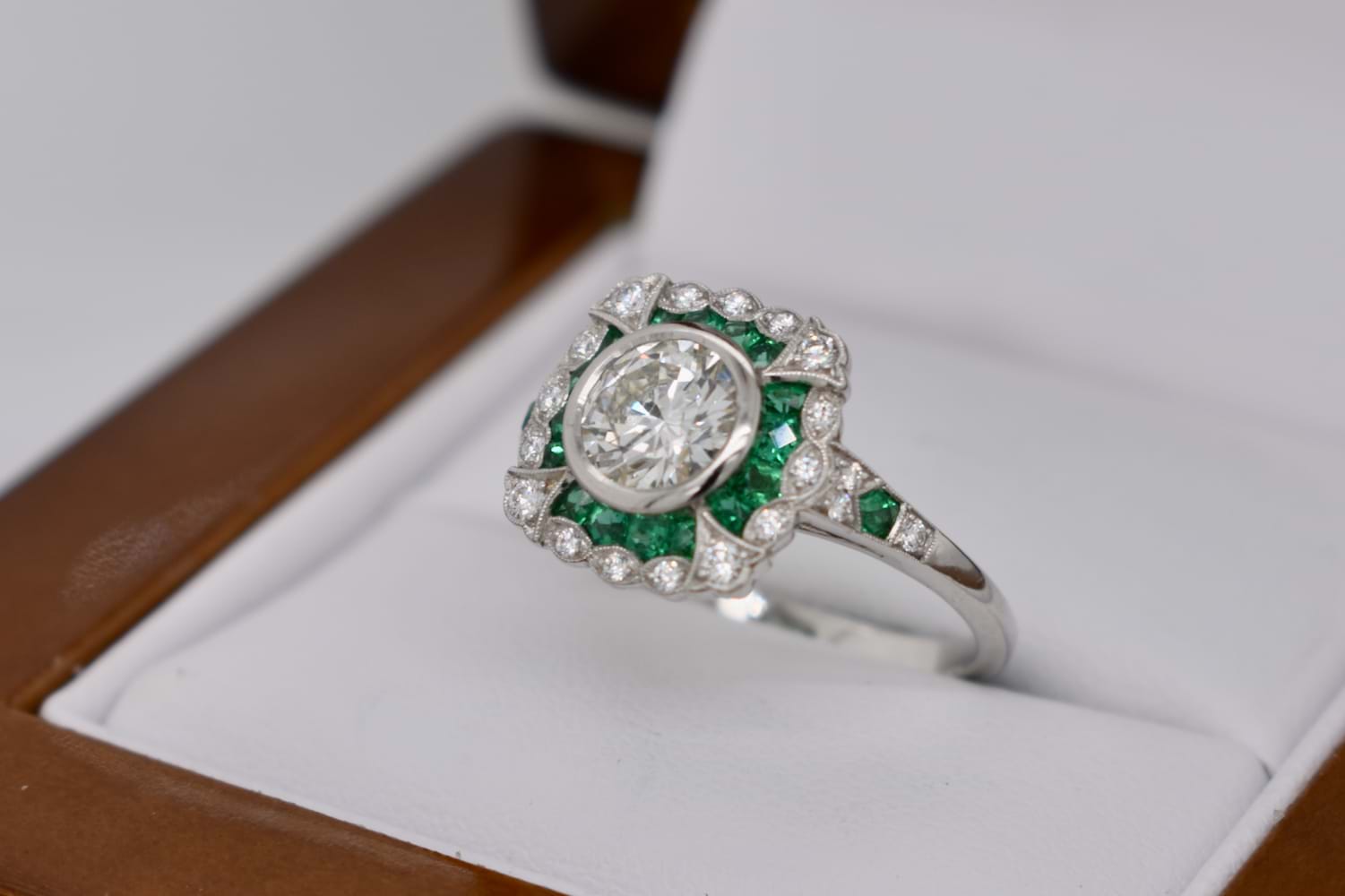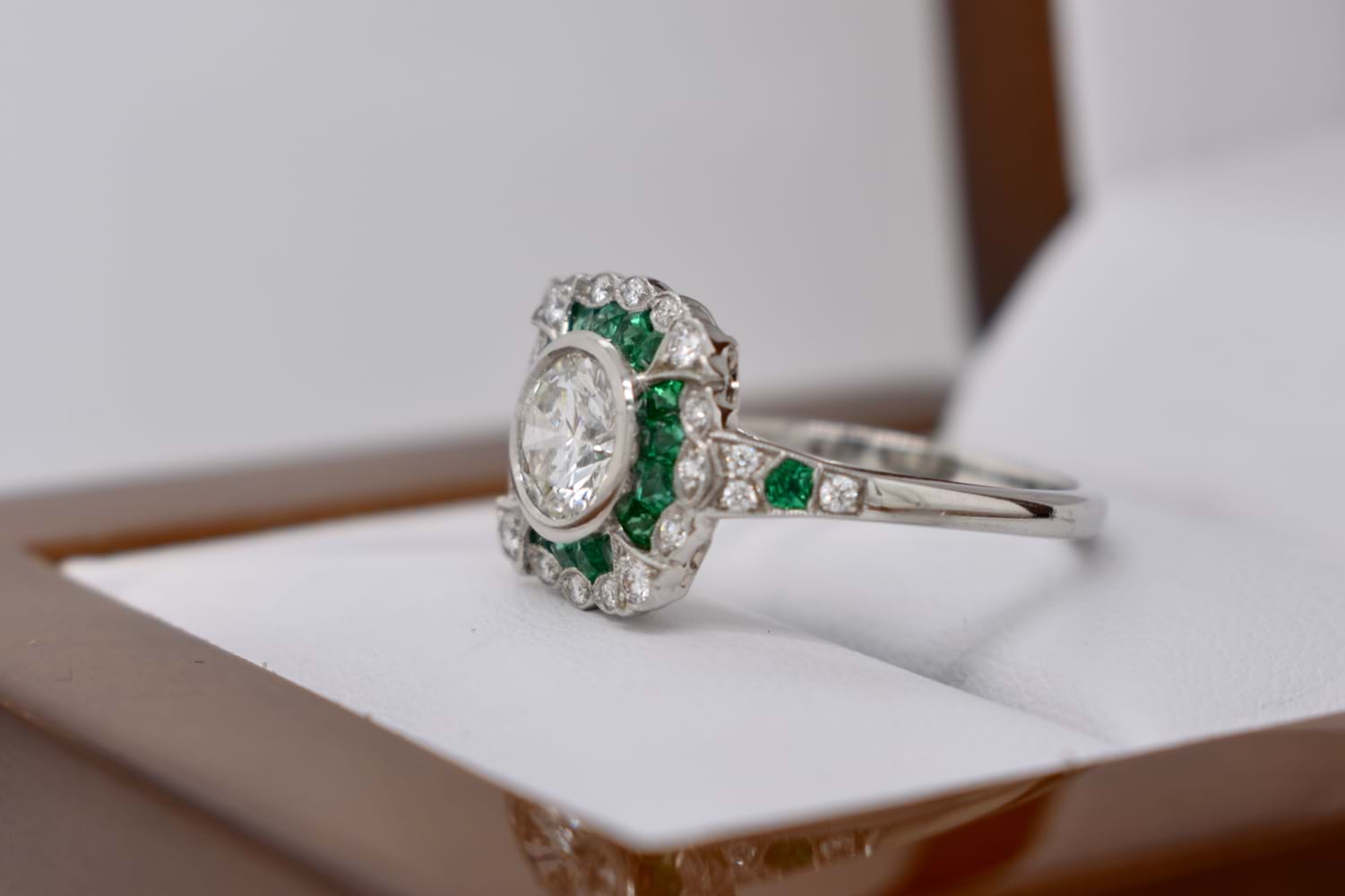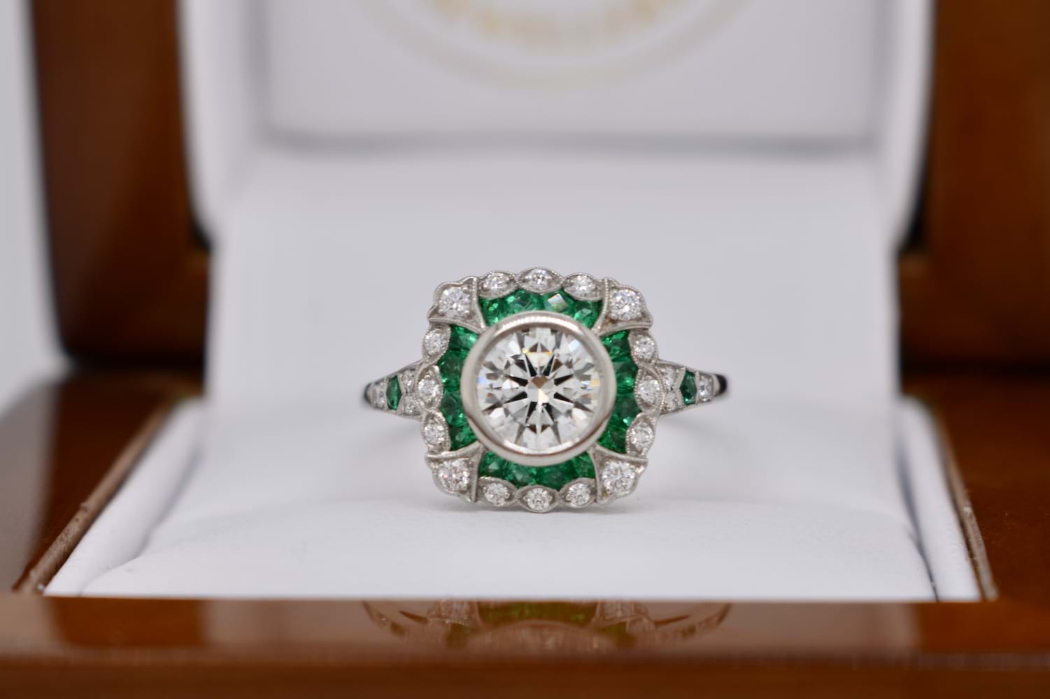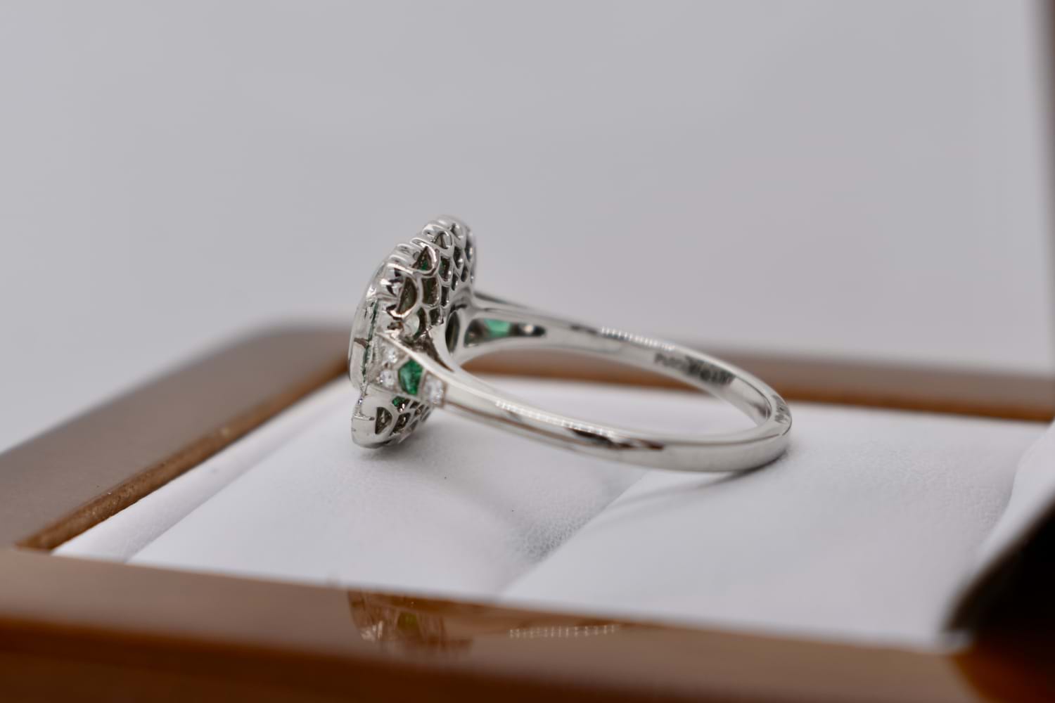 This eye catching geometric ring is crafted in Platinum with one centre diamond of 0.71ct FSI2. This round brilliant cut diamond is surrounded by fancy cut bright mid-dark green emeralds totalling 0.40ct, as well as 22 more round brilliant cut diamonds totalling 0.15ct FGVS-SI. The mill edge grain setting adds to the art deco style of the ring, which is finished with a 1.90mm band. Finger size L. Independent Valuation Supplied
