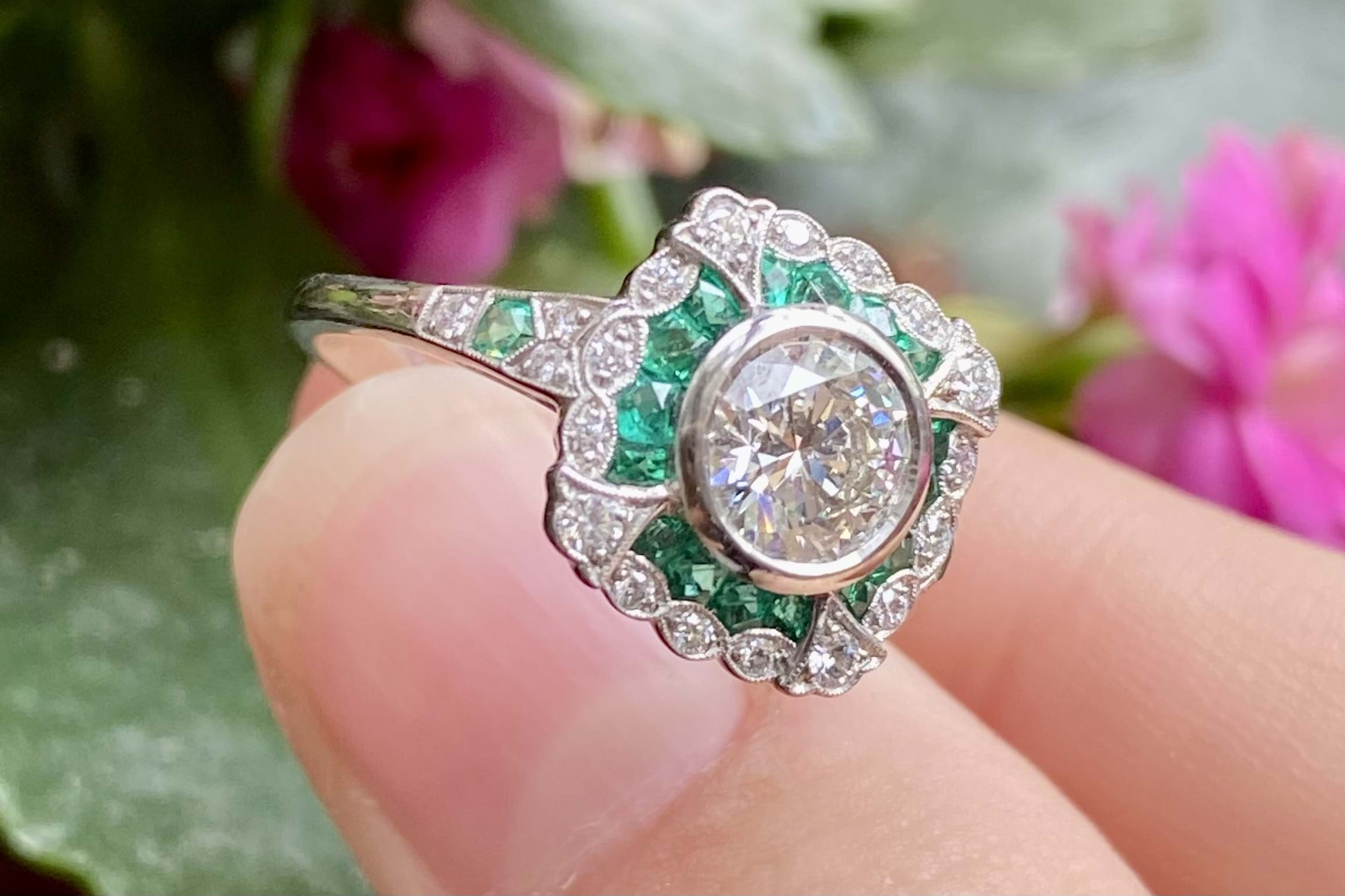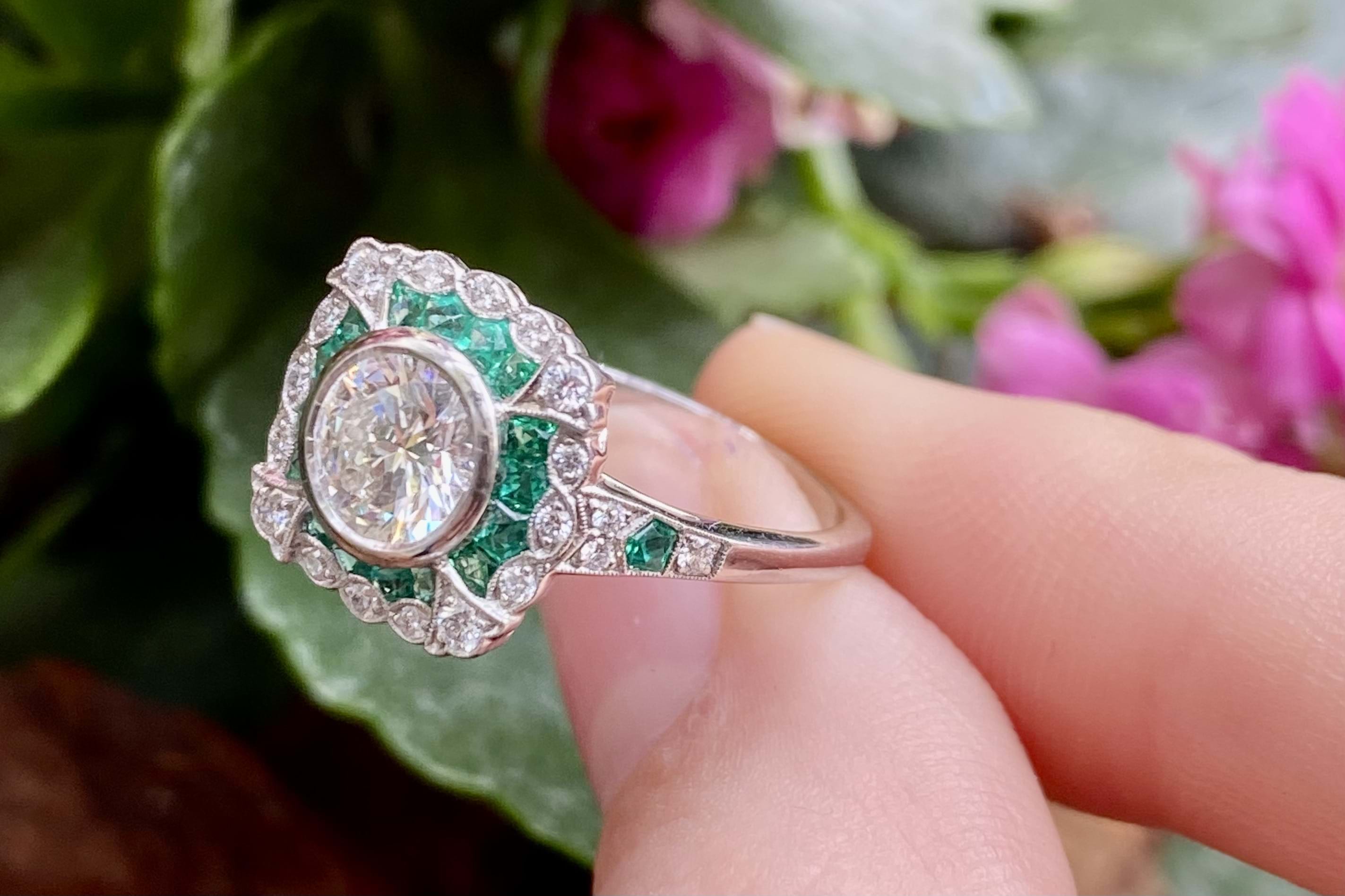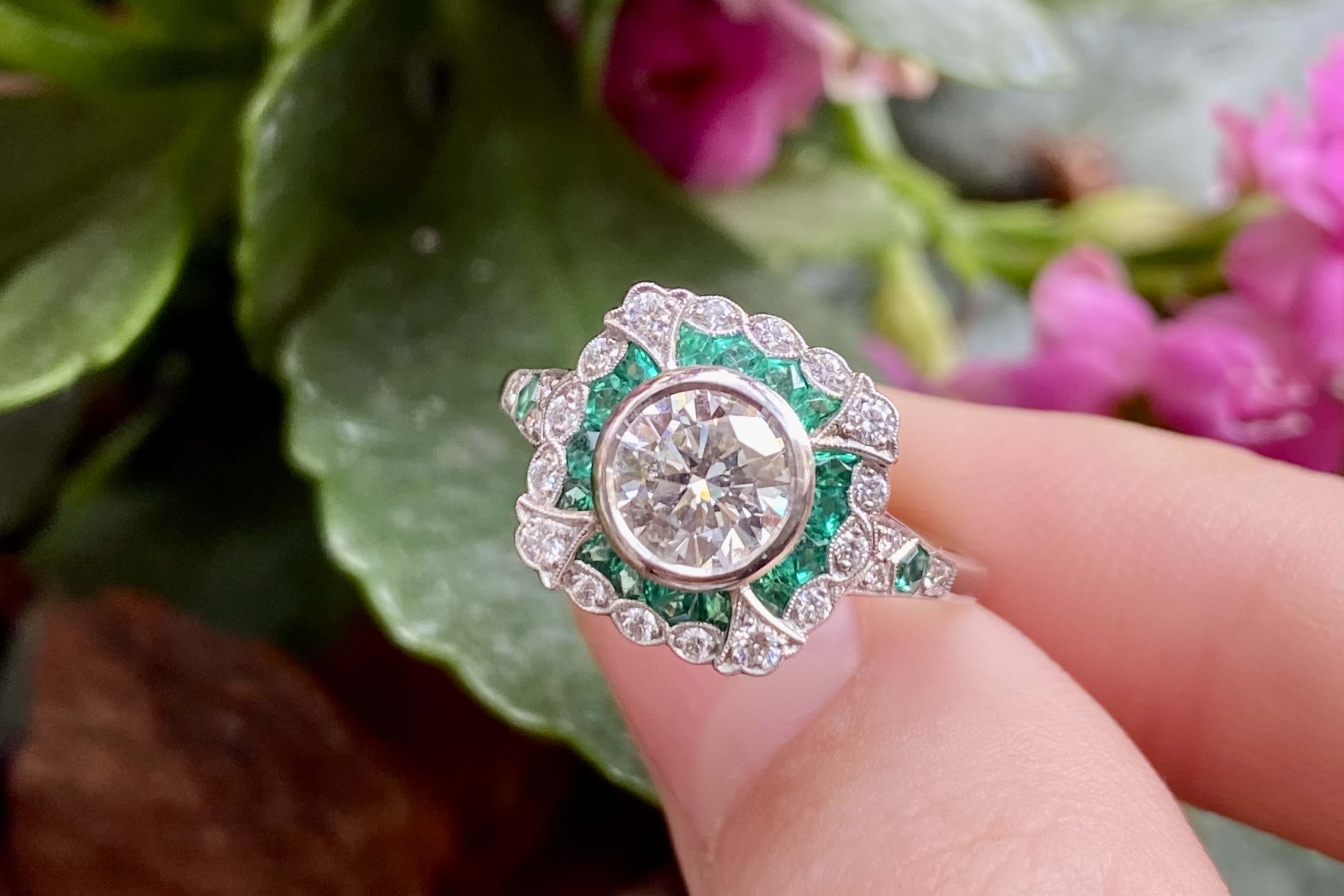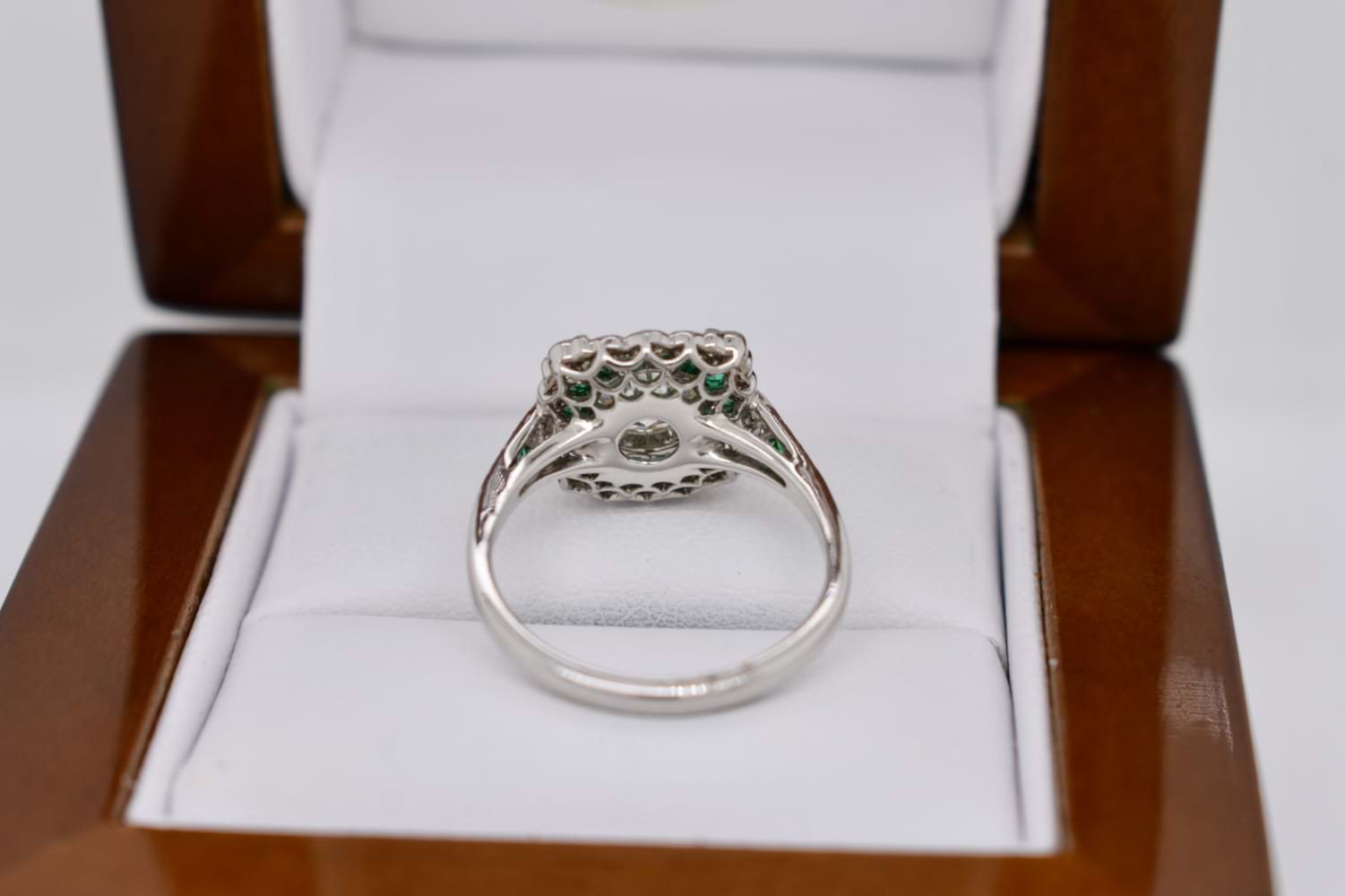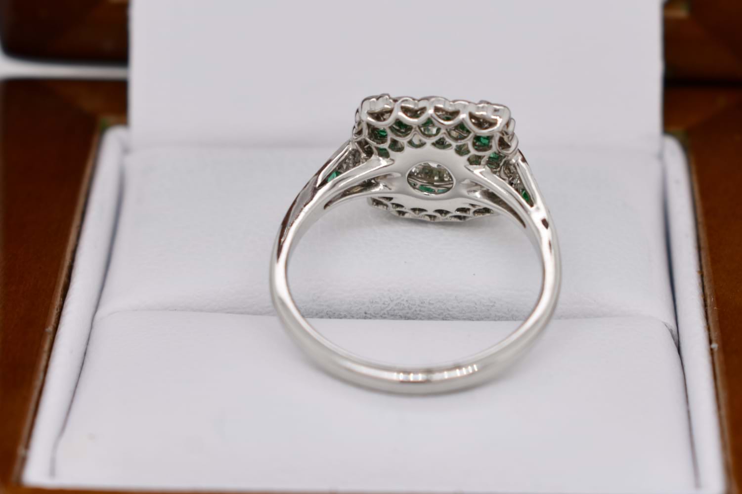 This eye catching geometric ring is crafted in Platinum with one centre diamond of 0.71ct FSI2. This round brilliant cut diamond is surrounded by fancy cut bright mid-dark green emeralds totalling 0.40ct, as well as 22 more round brilliant cut diamonds totalling 0.15ct FGVS-SI. The mill edge grain setting adds to the art deco style of the ring, which is finished with a 1.90mm band. Finger size L. Independent Valuation Supplied