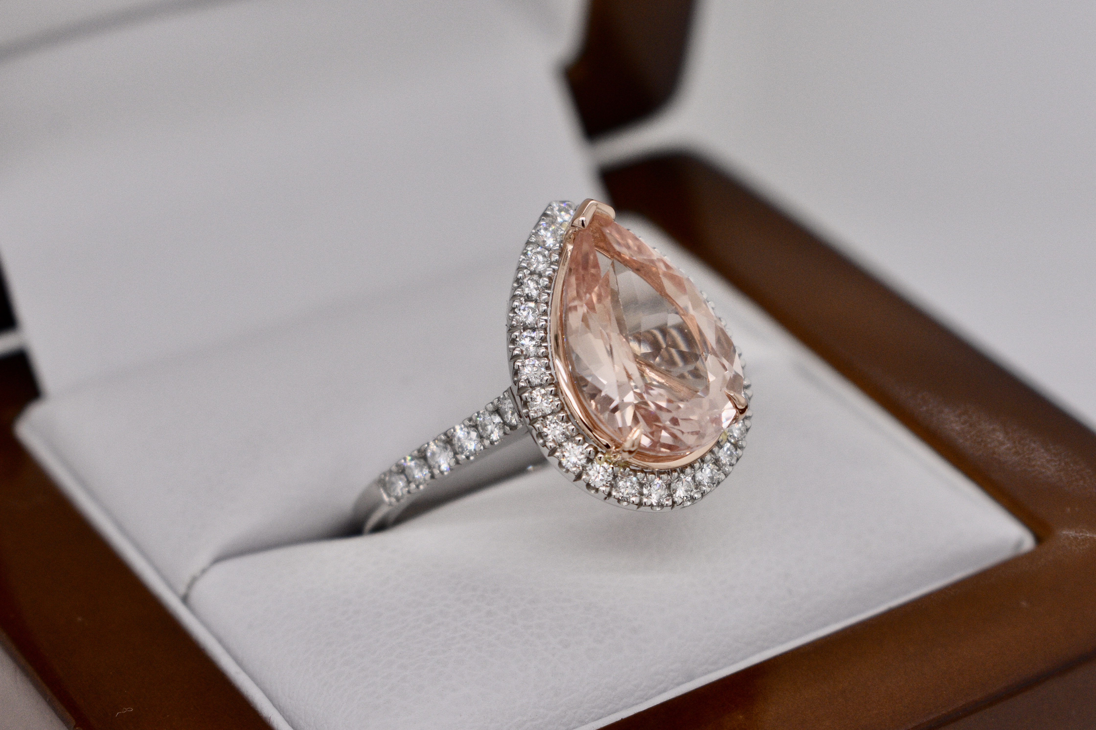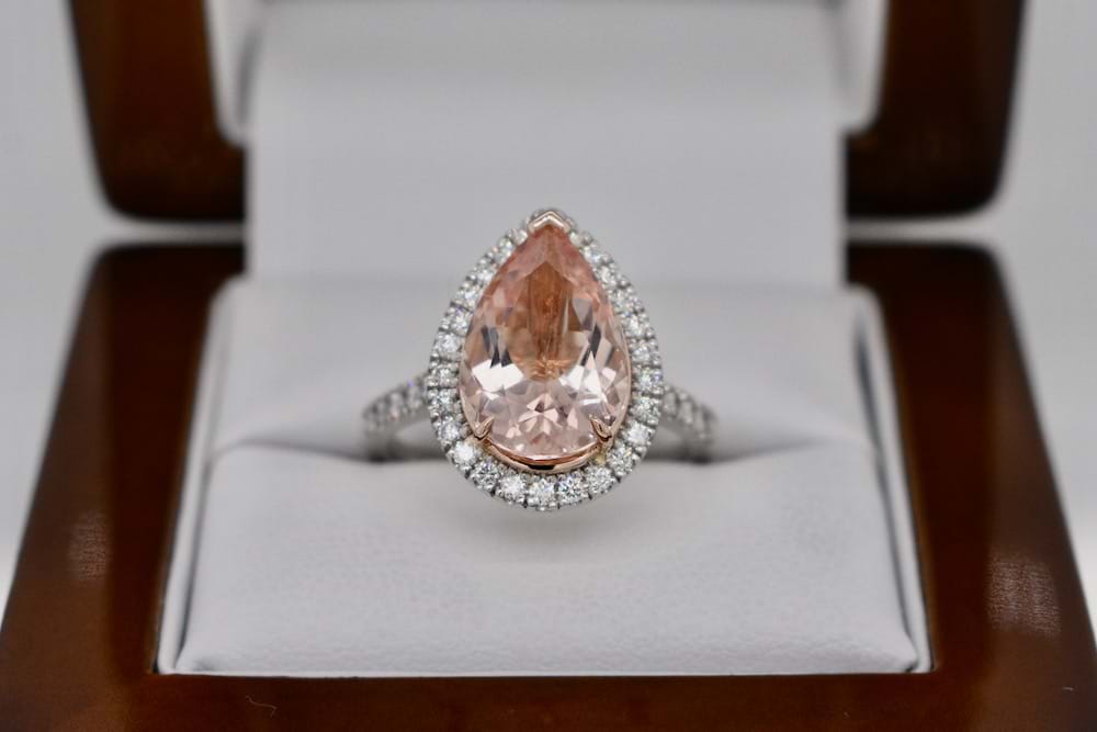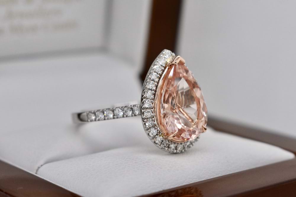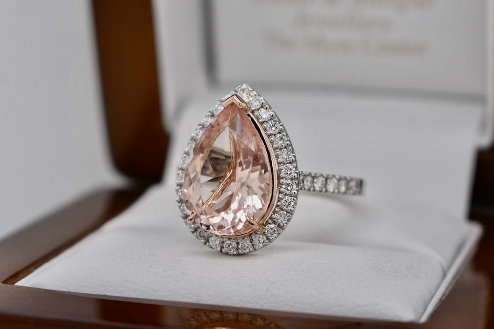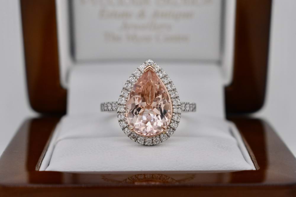 This luscious peach tone morganite of 3.98cts was hand chosen in store to be the feature of this striking halo ring. Expertly crafted in our work in platinum and 18ct rose gold the piece contains 36 shimmering round brilliant cut diamonds totalling 0.50cts D/F VS and will sit beautifully with bands if desired. Finger size O+ Independent Valuation Supplied