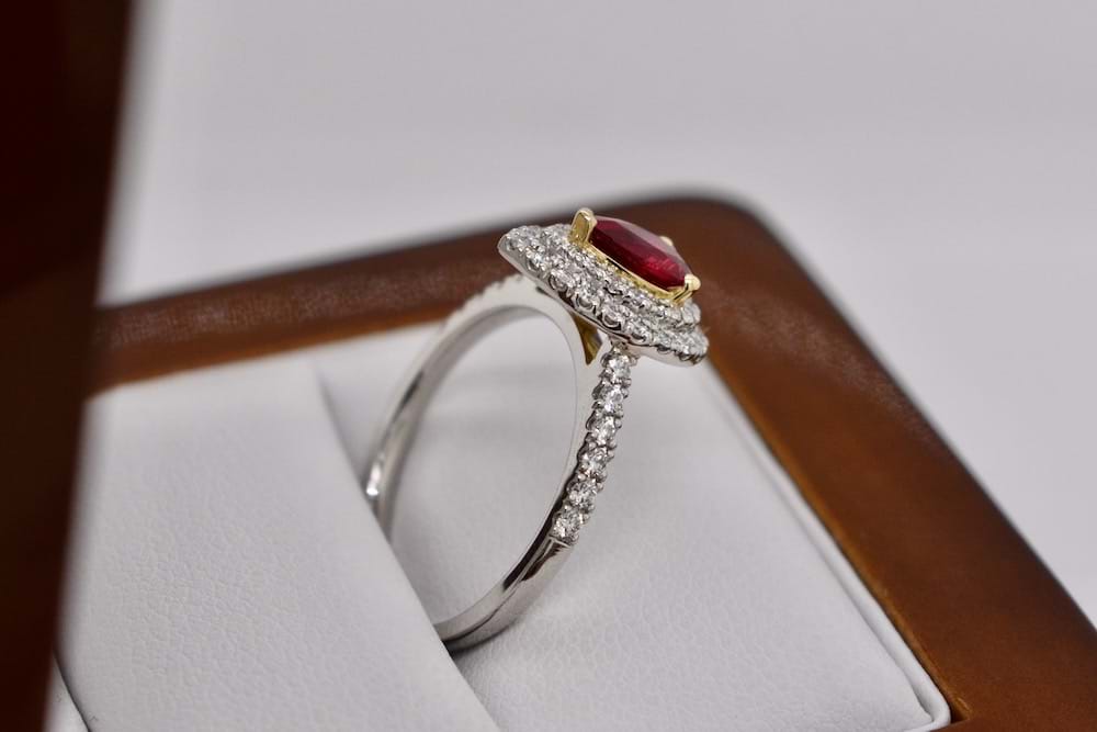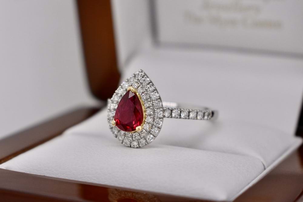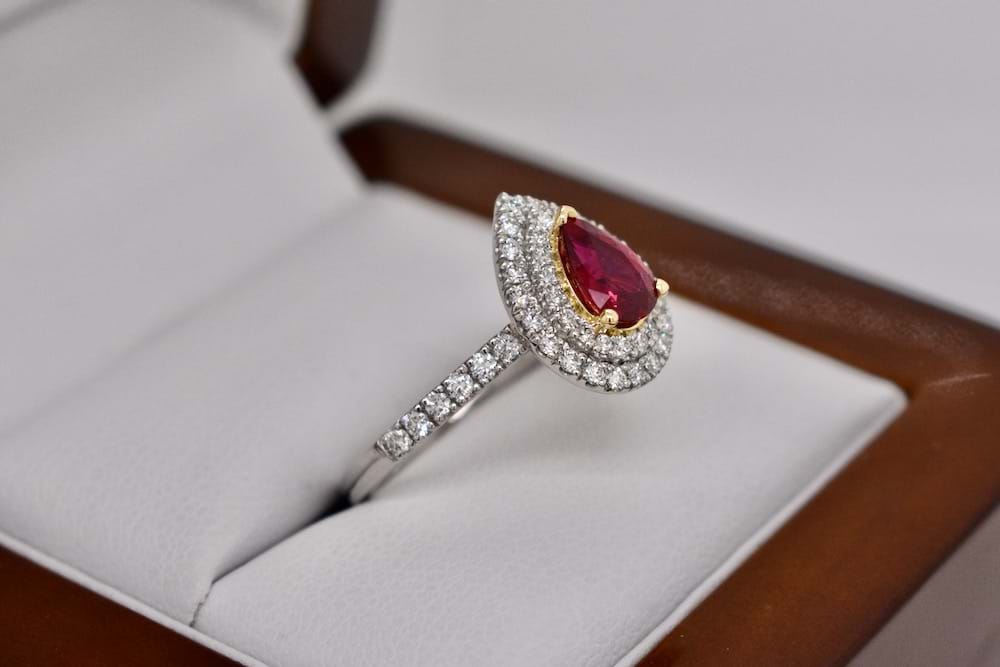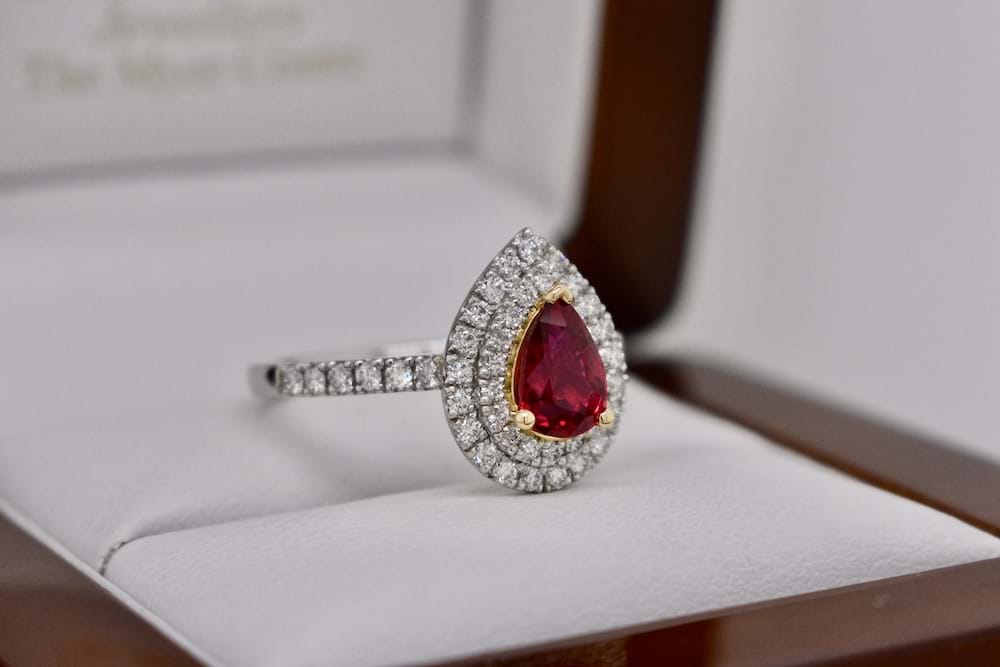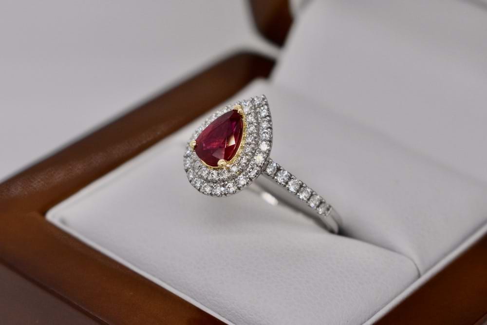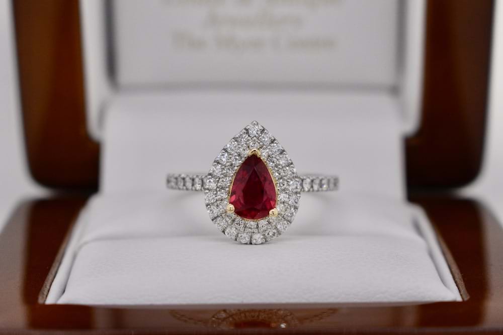 A stunning bright dark-medium red natural ruby of 0.77cts chosen to be the feature of this bespoke diamond halo ring. The pearshape ruby is cap & two claw set with 18ct yellow gold and has a double halo of shimmering round brilliant cut diamonds and diamond set shoulders in platinum. Total diamond content equals 0.60cts (D-G/SI), this ring will sit with or without bands. Finger size M+ Independent Valuation Supplied