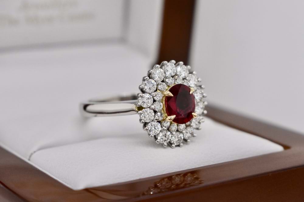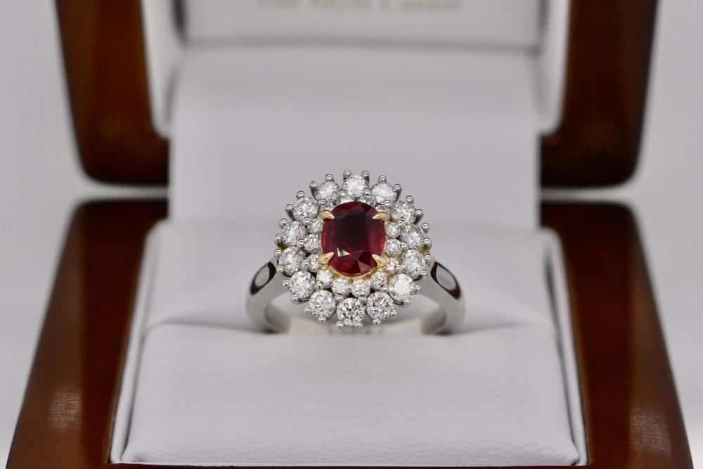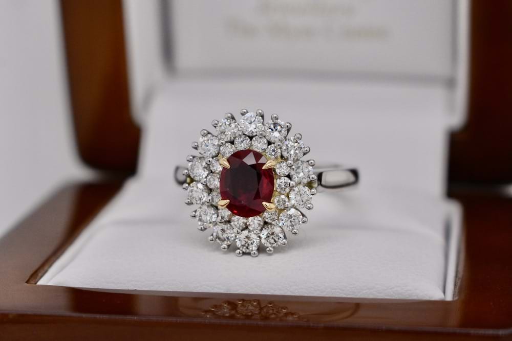 This spectacular natural ruby has been showcased beautifully in this bespoke platinum and 18ct yellow gold cluster ring. Designed in store the ring features a 1.08ct ruby in the centre with a double halo surround of 28 stunning round brilliant cut diamonds totalling 1.01cts (D/F SI). The ring will sit beautifully alone or when paired with bands, finger size M+ Independent Valuation Supplied