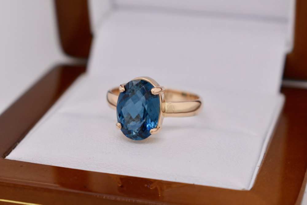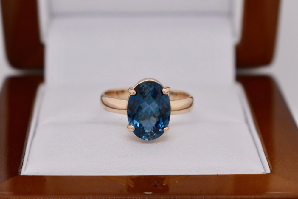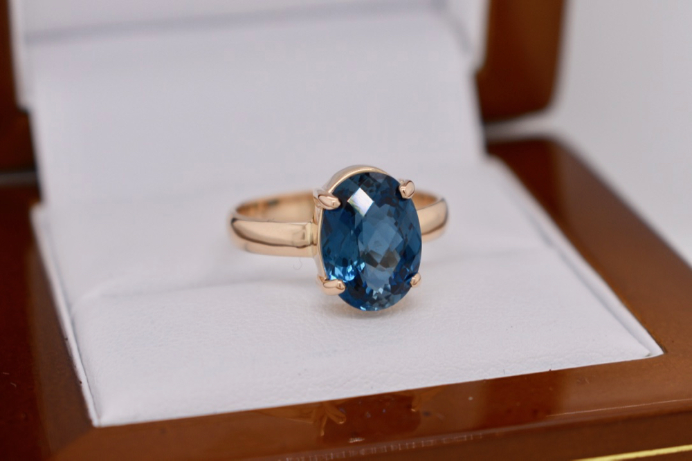 9ct yellow gold handmade claw set ring set with an 11.2 x 8.2mm checkerboard cut London Blue Topaz. Finger size M.5